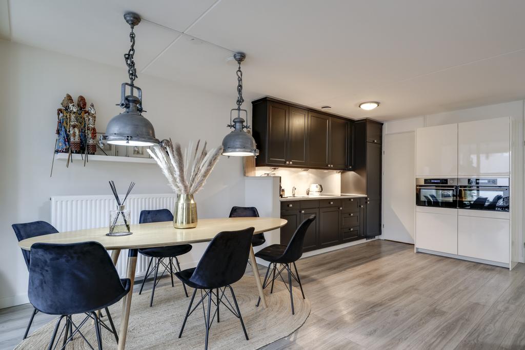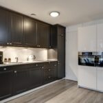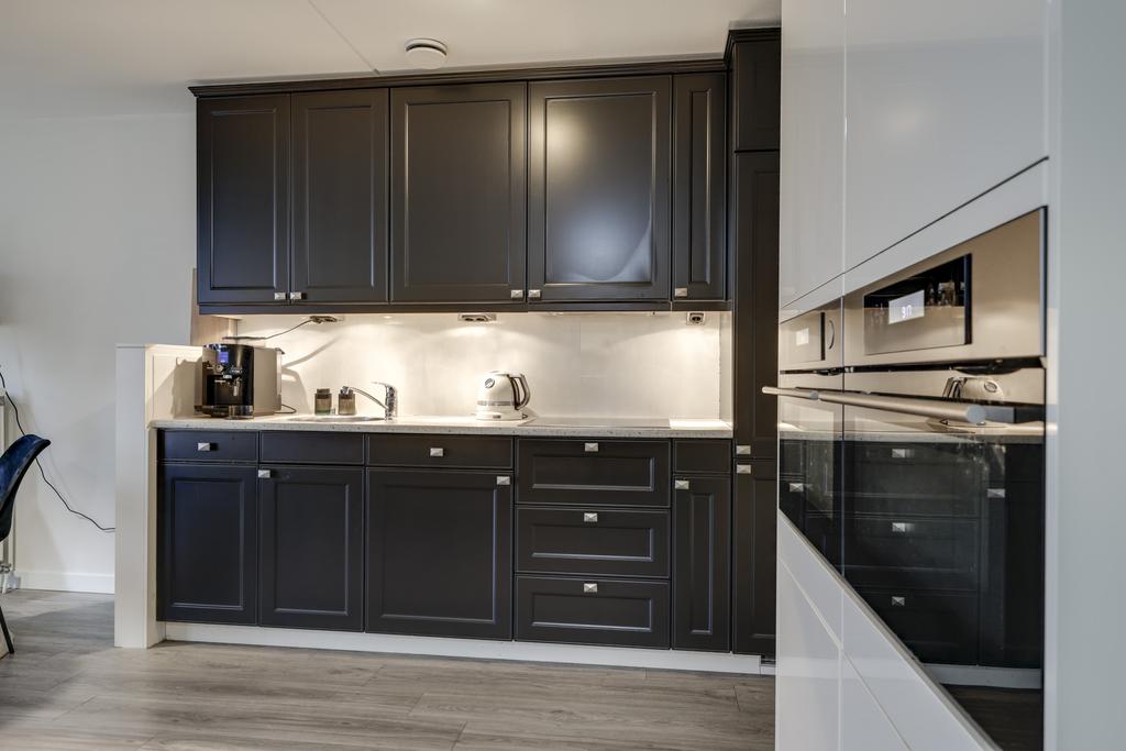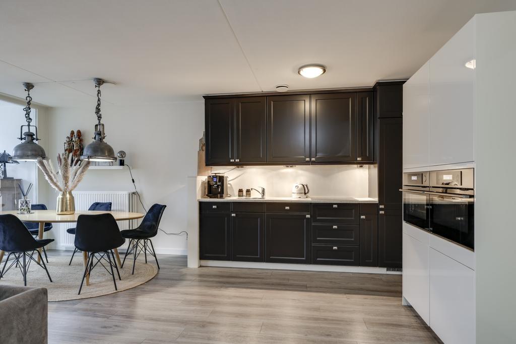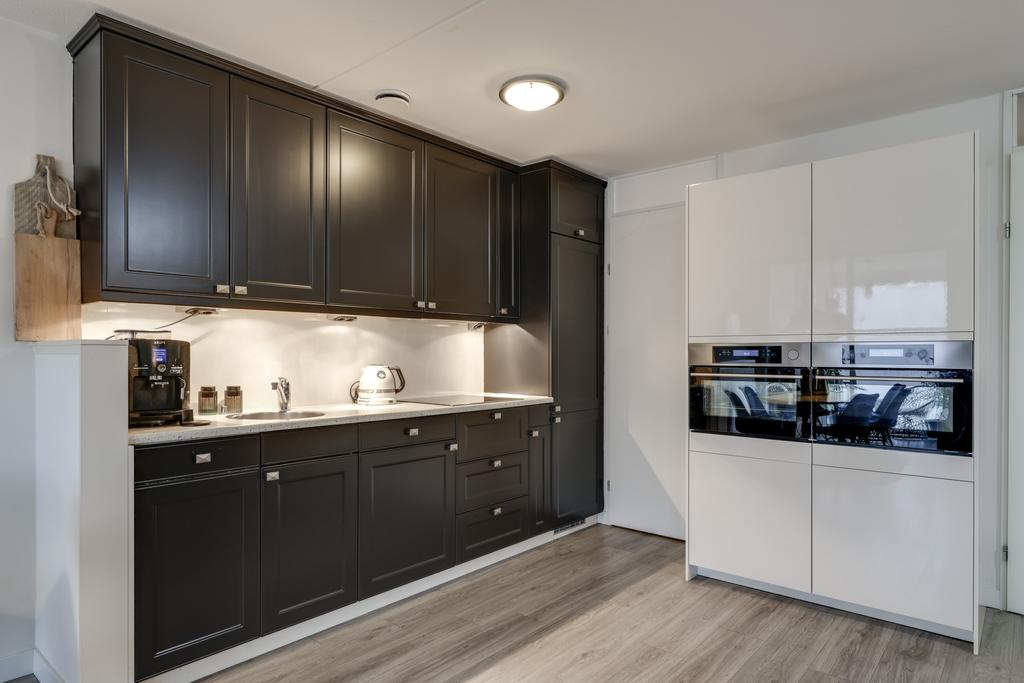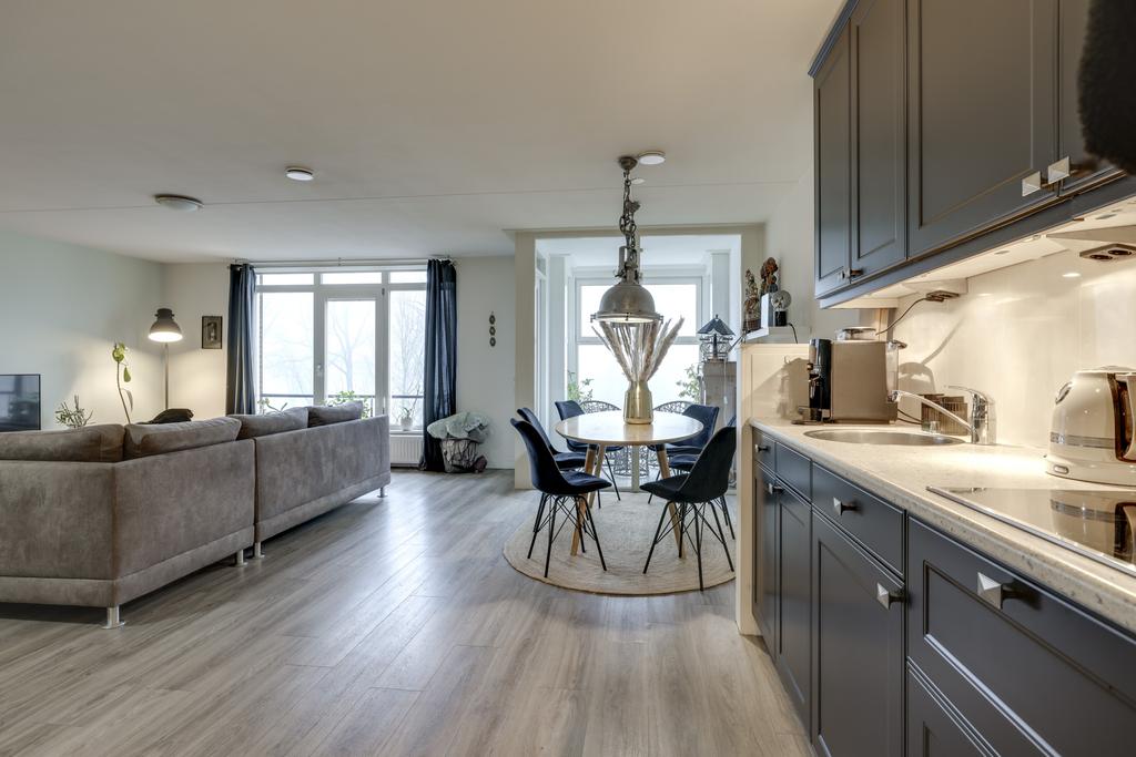 Dit appartement heeft een open keuken waardoor je tijdens het koken in contact blijft met je gasten. Er is gekozen voor 2 losse keukenblokken wat zorgt voor een speels effect. Een hoog keukenblok met veel kastruimte en een laag keukenblok met veel werkruimte. Alle wenselijke inbouwapparatuur is tevens aanwezig, zijnde een 4-pits inductiekookplaat, een afzuigkap, een koelkast, een vriezer, een stoomoven, een combi-oven/magnetron en een vaatwasser.