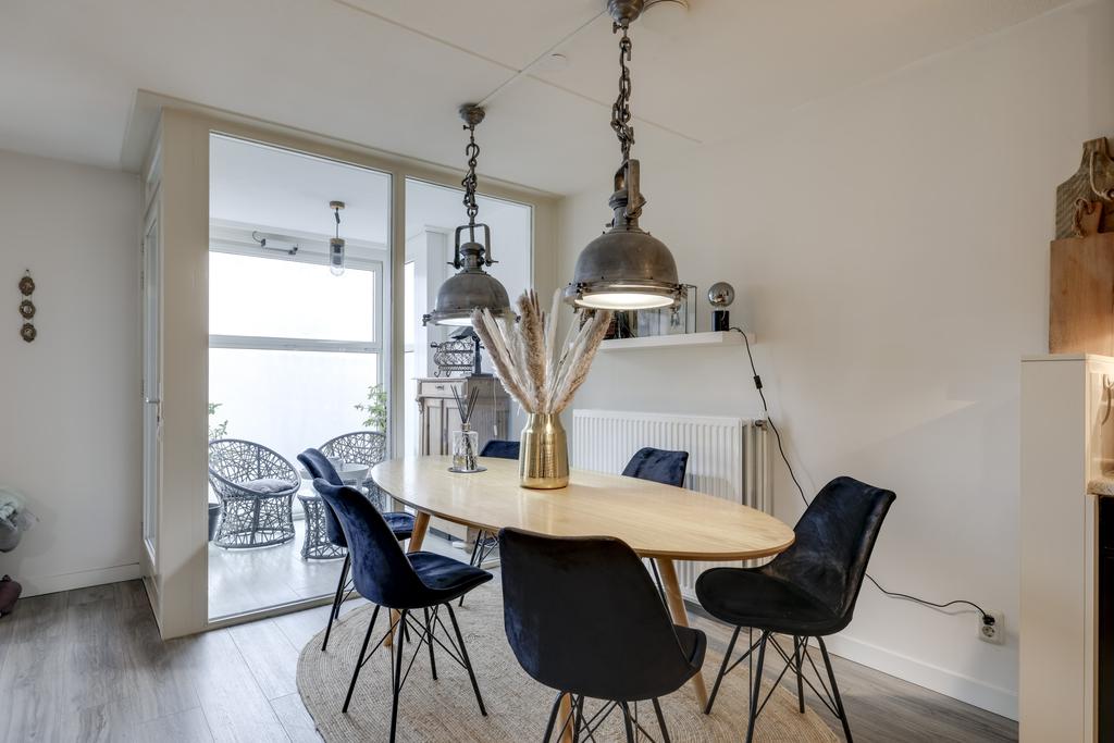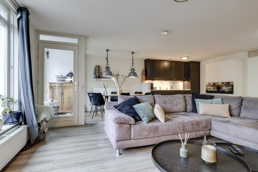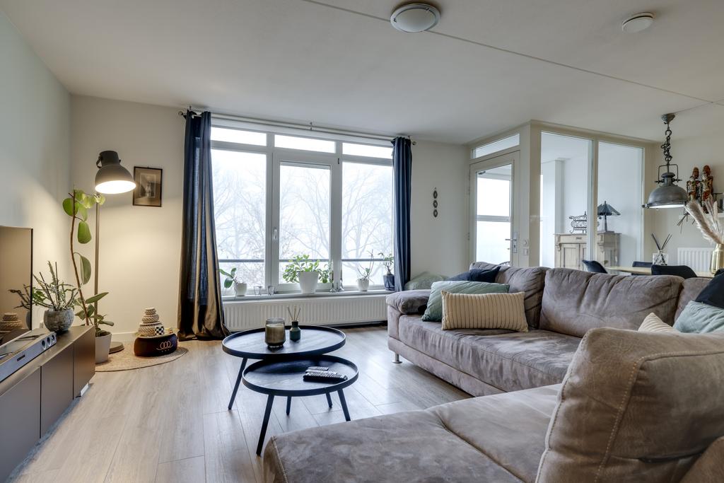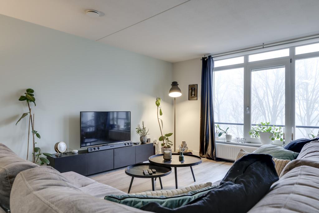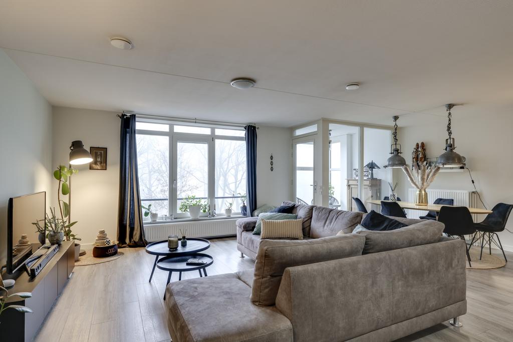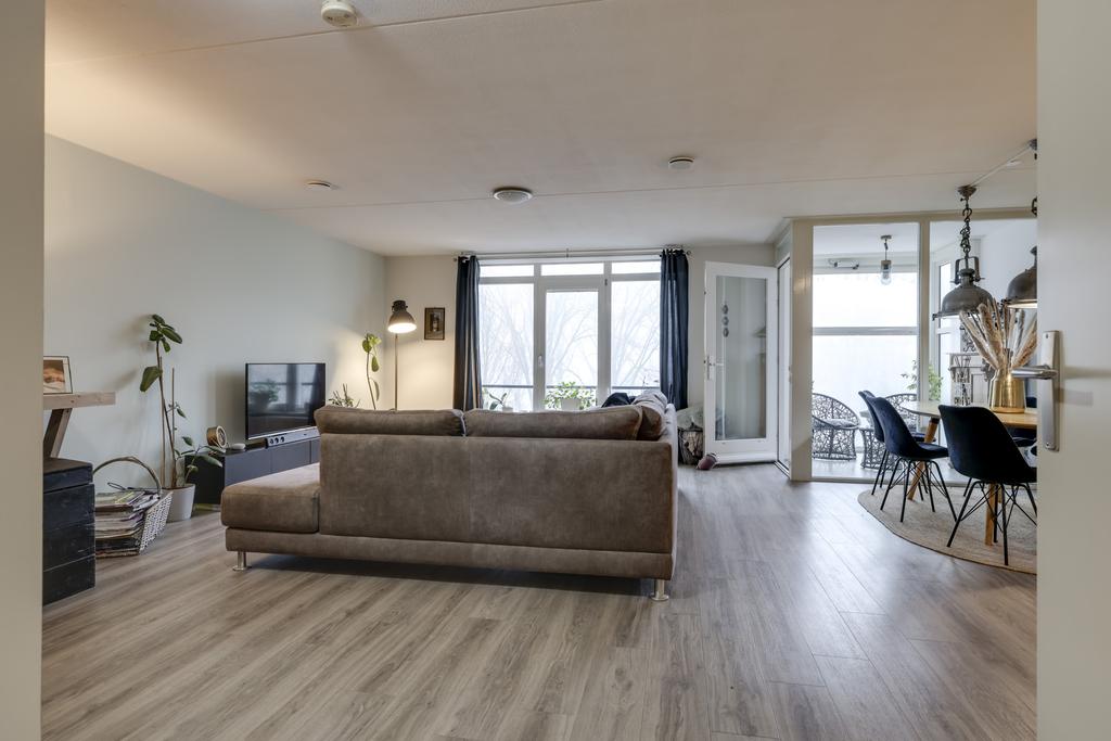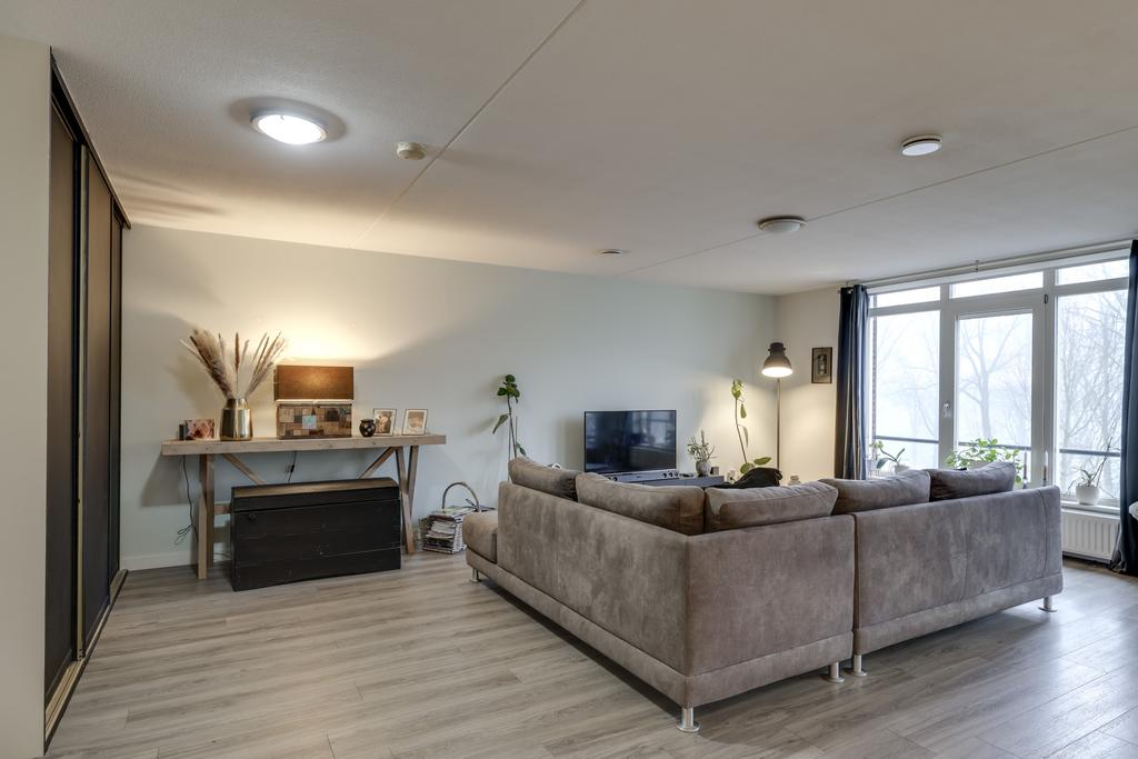 Wanneer je de woonkamer van dit appartement betreedt valt je gelijk op hoe ruim deze ruimte is opgezet. Je kan hier dan ook met gemak een grote zithoek en een 6-persoons eethoek kwijt. In de hoek van de woonkamer is een grote kastenwand geplaatst wat zorgt voor extra veel praktische opbergruimte. Op de vloer ligt een pvc-vloer welke drempelloos doorloopt in het gehele appartement. Doordat de woning zich op de 3e verdieping bevindt kijk je hier uit op de bomen en niet op de weg. Mocht je de kamer geheel willen verduisteren, dan is dat mogelijk middels het rolluik. Ongewilde insecten houd je buiten door middel van de hor.