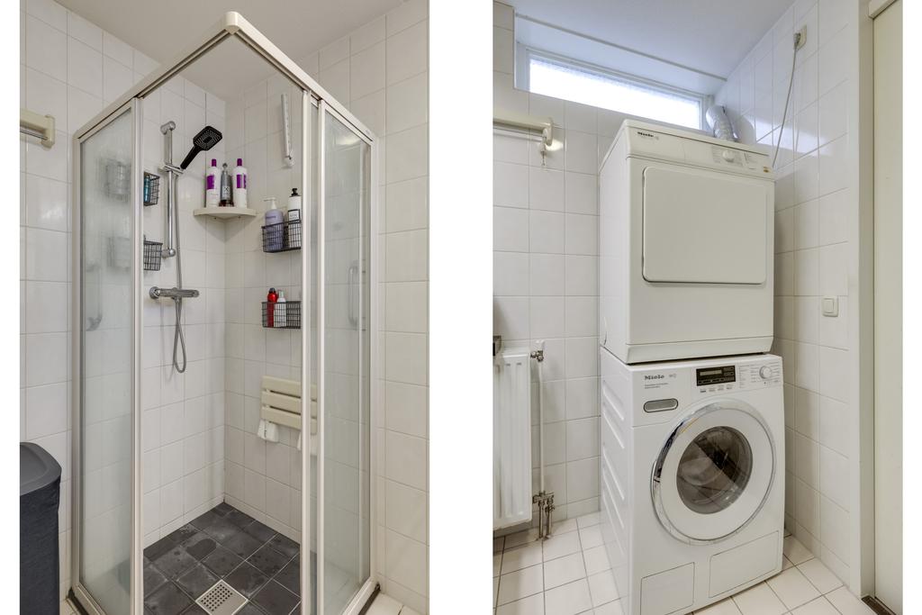De badkamer is net als het de rest van het appartement ook ruim opgezet. Erg prettig is dat het toilet separaat van de badkamer is gesitueerd. Dit betekent dat je gasten niet op de badkamer hoeven te komen. De ruimte is ingedeeld met een douche en een wastafelmeubel. Het wastafelmeubel is voorzien brede lades wat zorgt voor de nodige opbergruimte. Op de badkamer zijn tevens de witgoedaansluitingen terug te vinden. Een hooggeplaatst raam zorgt hierbij voor de nodige lichtinval.