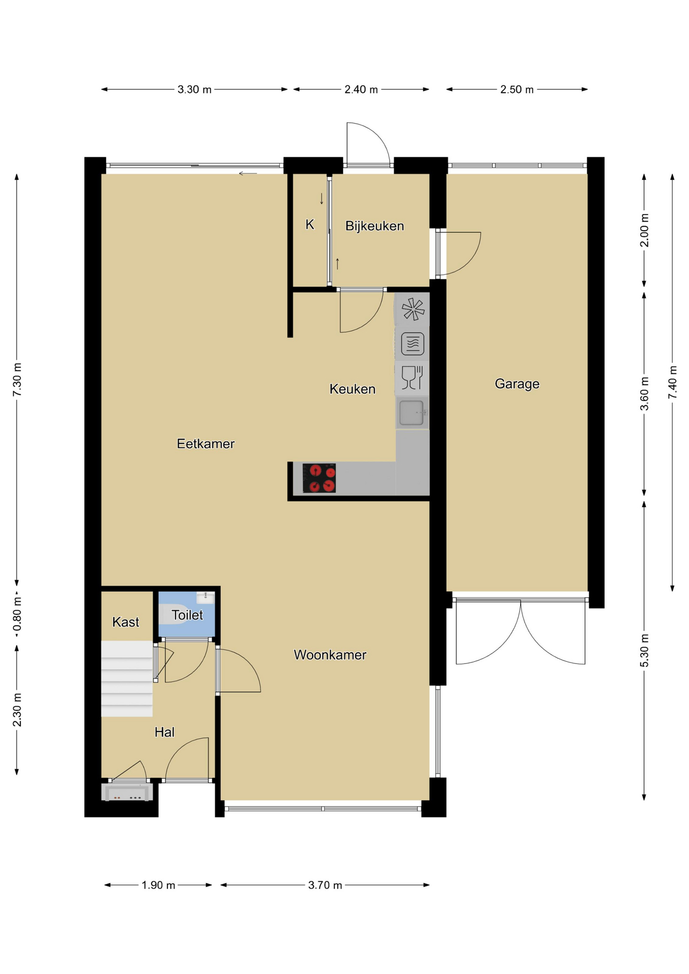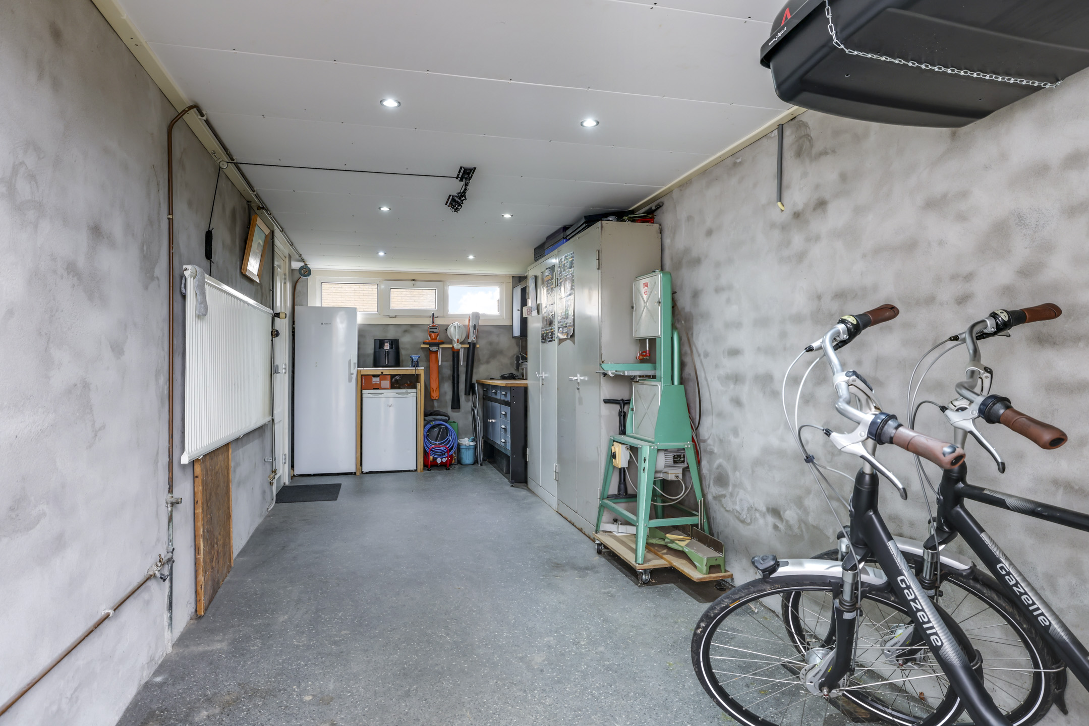 Een groot pluspunt van deze woning is de garage die van binnenuit toegankelijk is. Hierdoor betrek je de garage net even wat sneller bij de woning. En deze garage is ook langer dan gemiddeld. Waar een doorsnee garage bij 5,5 meter of 6 meter stopt, loopt deze tot 7,4 meter door. Daardoor kun je de garage ook voor meerdere doeleinden gebruiken, bijvoorbeeld wanneer je de ruimte opdeelt in een stallingsruimte voor (elektrische) fietsen en/of een motor en een hobby/klushoek. Je zou er zelfs een werkkamer kunnen creëren aangezien er in de achtergevel ook een raam (kunststof kozijn v.v. isolatieglas) met daglicht aanwezig is. Wanden zijn gestuct, het plafond is vervangen door gipsplaten v.v. inbouwspots en de ruimte is verwarmd middels een radiator. Aan de voorzijde zijn dubbele deuren geplaatst in plaats van een stalen kanteldeur die vaak minder handig is en aan alle kanten kiert.