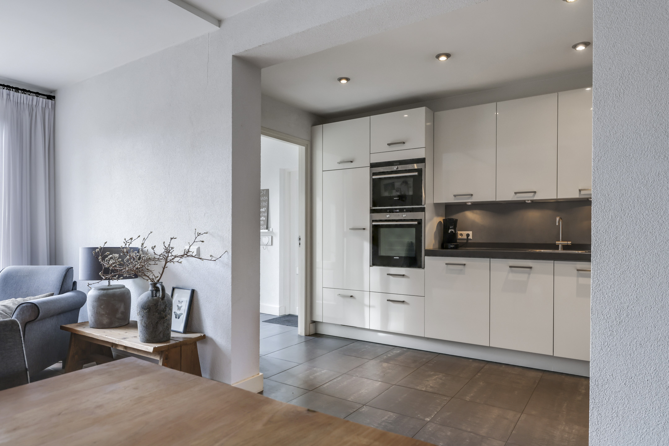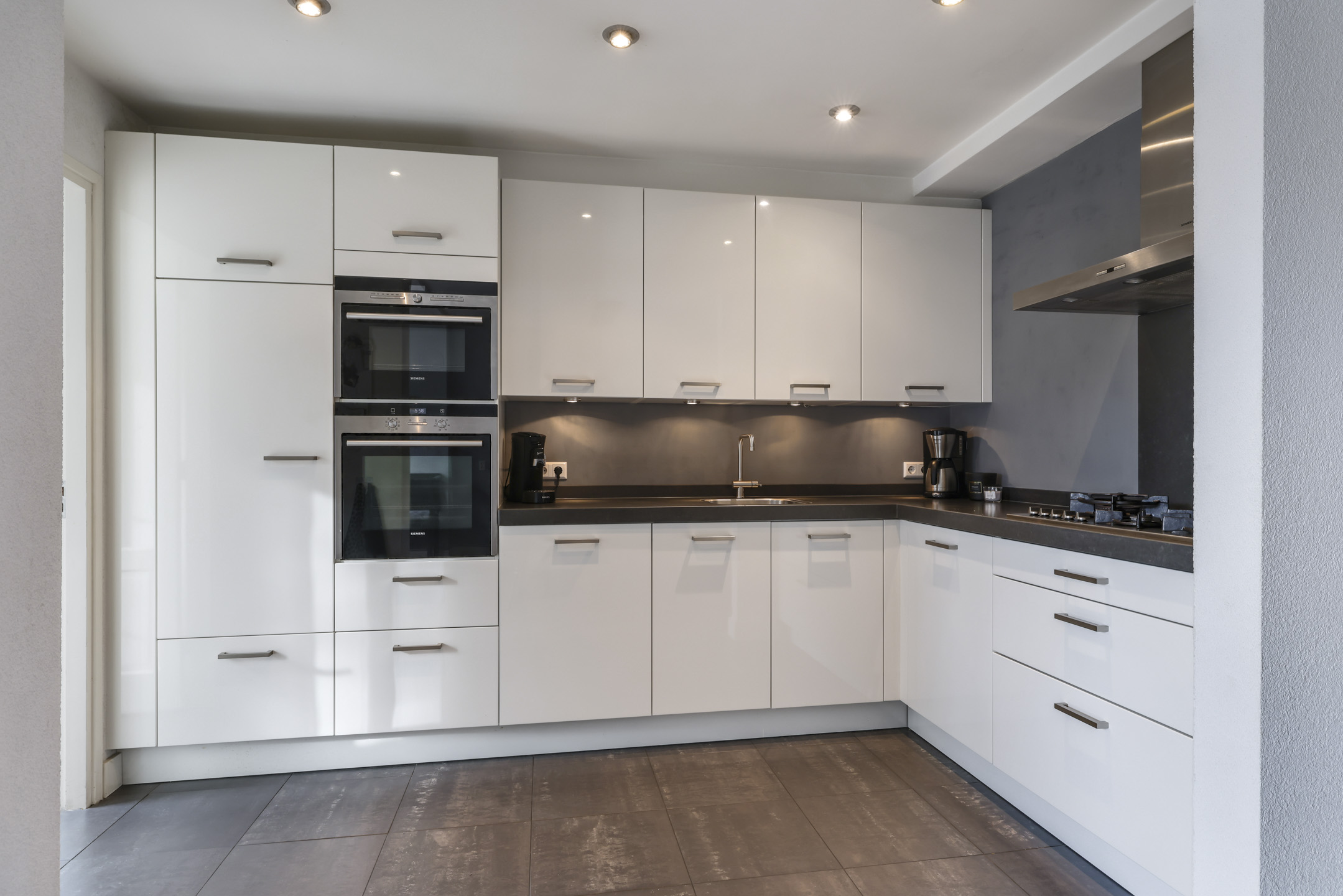 De keuken heeft een open verbinding met de woonkamer hetgeen het ruimtelijke gevoel verder versterkt. De keuken is daarbij in een hoekopstelling geplaatst en voorzien van alle gebruikelijke inbouwapparatuur zoals een vaatwasser, een brede 5-pits gaskookplaat met afzuigschouw, een hoge koelkast, een grote heteluchtoven en een separate magnetron. Hoogglans witte fronten en een zwart aanrechtblad van composiet (natuursteen) geven de keuken een neutrale en luxe uitstraling. Deze keuken heeft tevens veel kastruimte waaronder brede ladekorven en een luxe Le-man-slede die je helemaal uit de hoekkast schuift. Een close-in-boiler zorgt voor een stukje comfort doordat je direct warm water hebt. Inbouwspots en een plavuizen vloer met vloerverwarming maken het plaatje compleet.