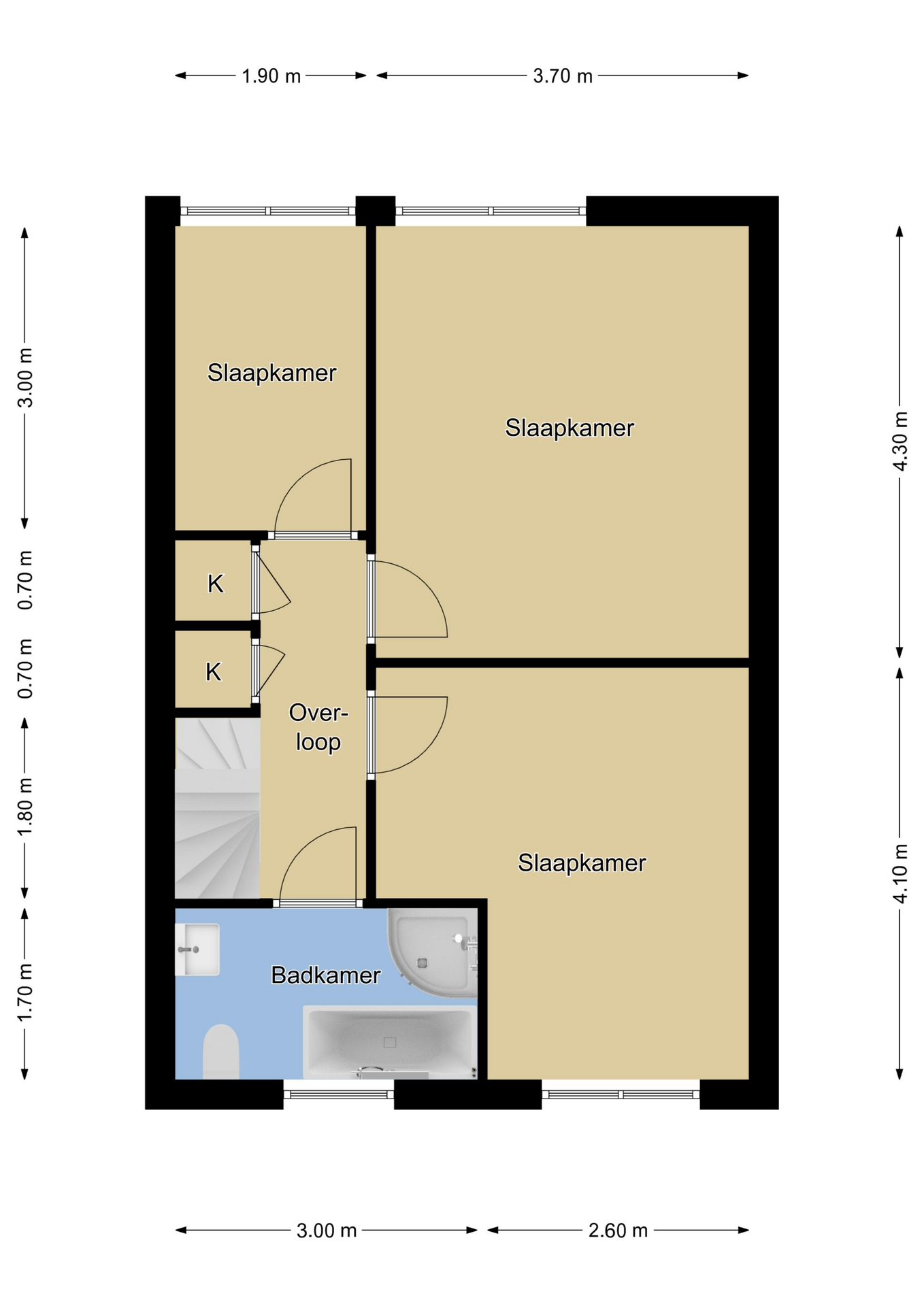 Via een prettige hal met o.a. een zwevend wandcloset en trapopgang komen we op de 1e verdieping terecht. Doordat deze woning breed is opgezet met een beukmaat van maar liefst 5,7 meter (inpandig), zijn alle 3 de slaapkamers goed bemeten. Er zijn geen schuine dakvlakken waardoor de kamers praktisch in te richten zijn. Alle kamers zijn v.v. kunststof kozijnen met draai/kiepramen waarbij de ramen aan de achterzijde zijn v.v. zonwering (screens). Noemenswaardig is de laminaatvloer die eenduidig en drempelloos van de ene kamer via de overloop naar de andere kamer doorloopt. Handig zijn de 2 grote inbouwkasten op de overloop. Hier kun je bijvoorbeeld bedlinnen, een winterdekbed en handdoeken opbergen.