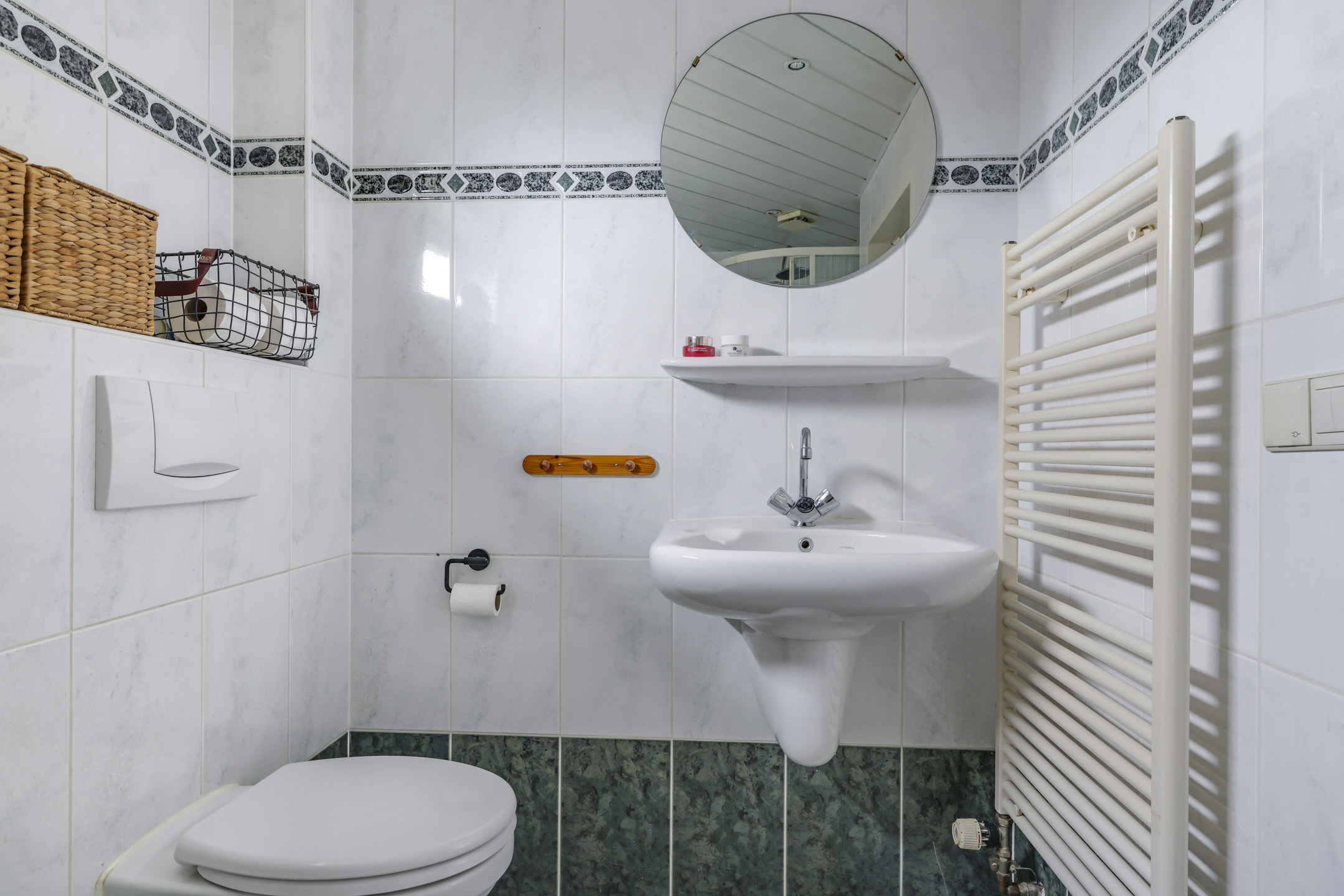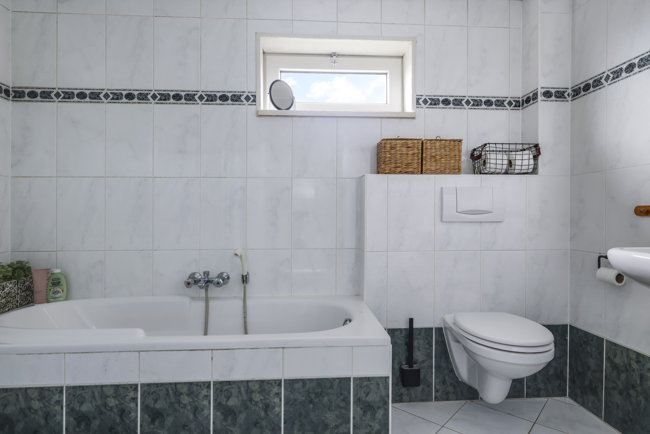 De badkamer is aanzienlijk vergroot zonder dat dit ten koste is gegaan van het ruimtelijke gevoel van één van de slaapkamers. Door de extra ruimte is de badkamer compleet ingericht met o.a. een ligbad en een aparte douchecel. Uiteraard ontbreekt het 2e zwevend wandcloset niet en is er een wastafel aanwezig. De handdoekradiator is met name erg praktisch. Een kiepraam zorgt voor de ideale ventilatiemogelijkheid, maar er is ook mechanische ventilatie geïnstalleerd. Verder is de badkamer degelijk betegeld en zijn er inbouwspots in het plafond aangebracht.