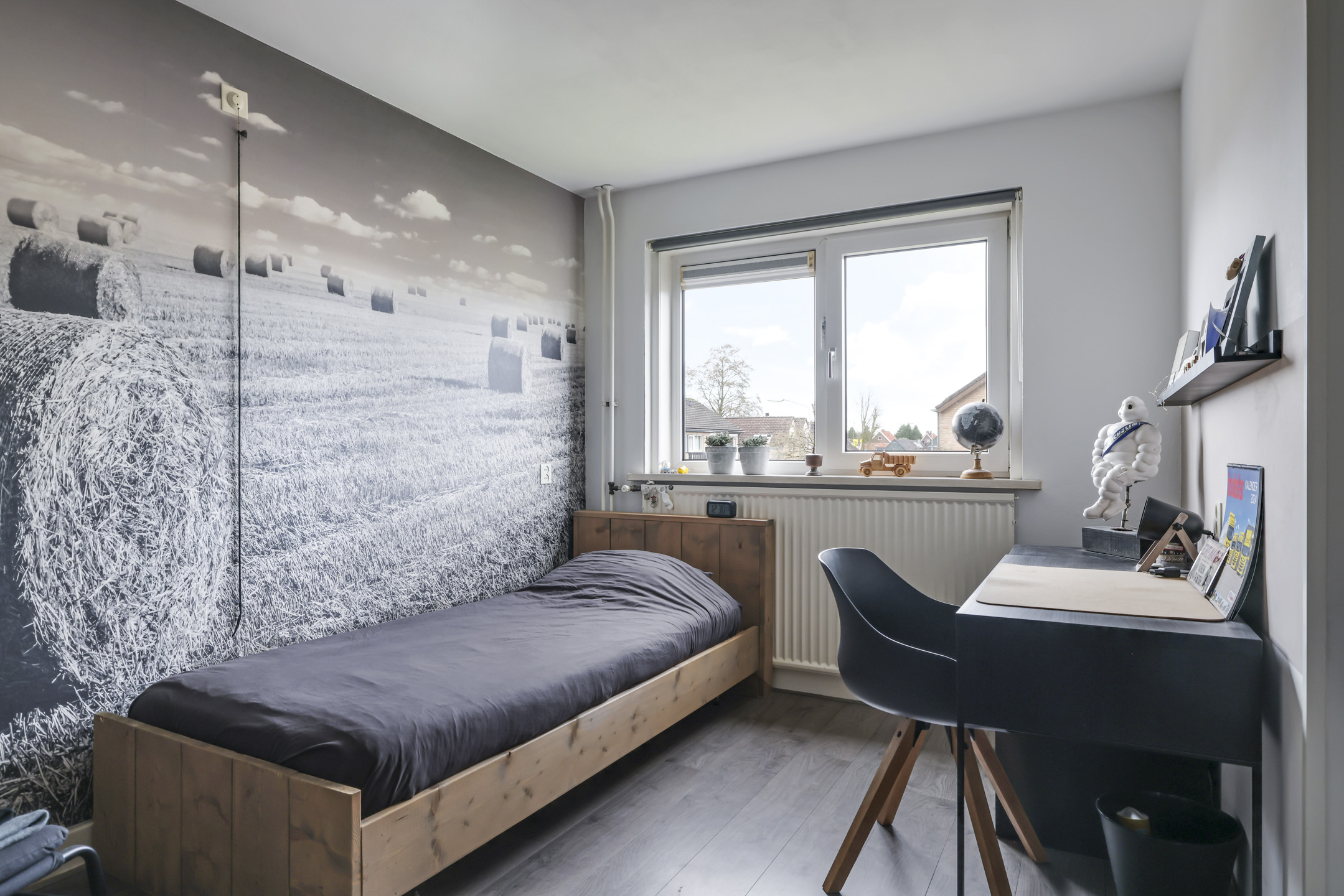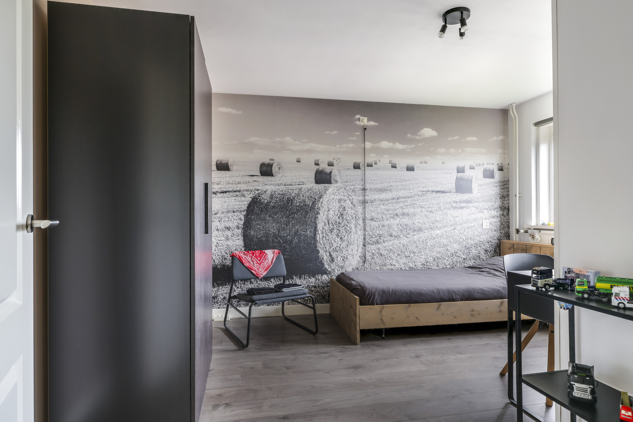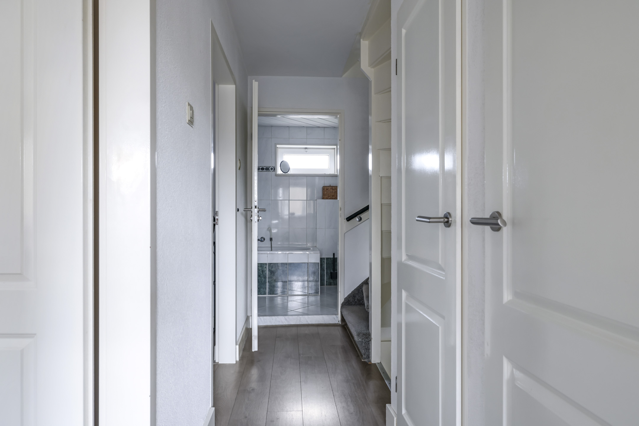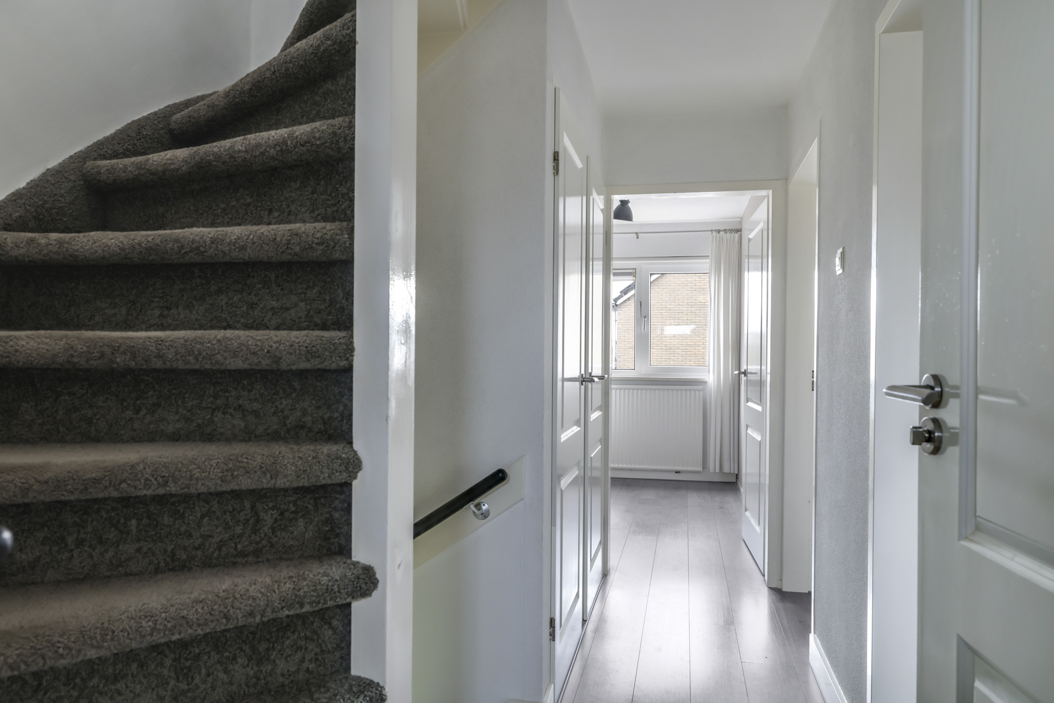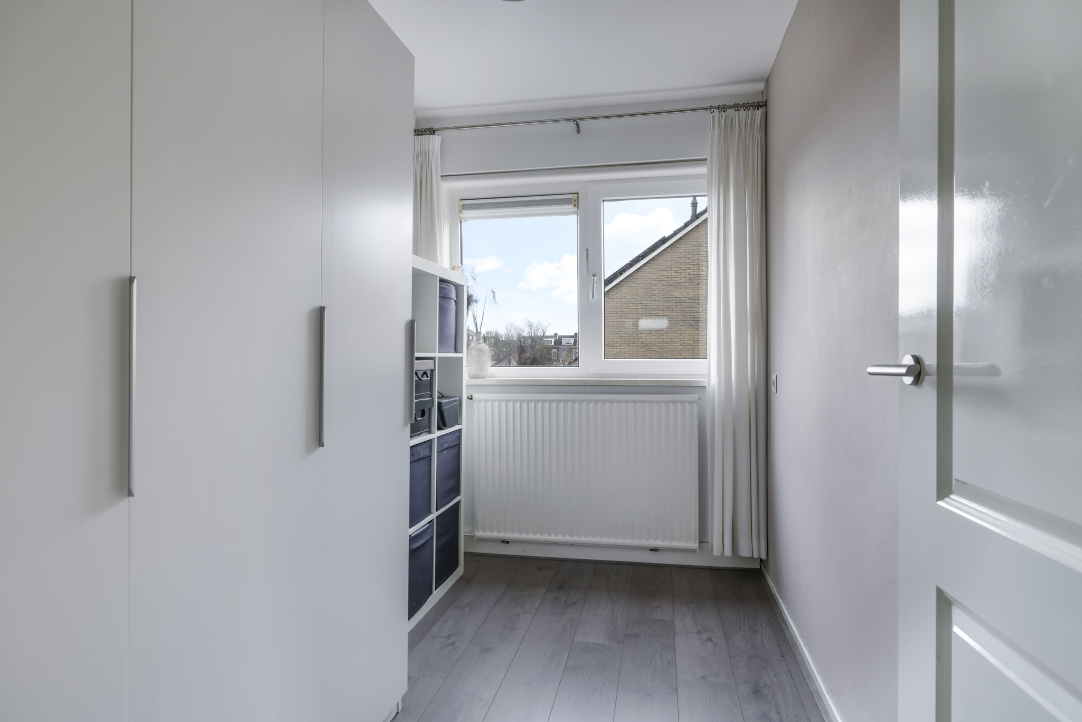 Overloop met dubbele inbouwkasten en zijgevelraam