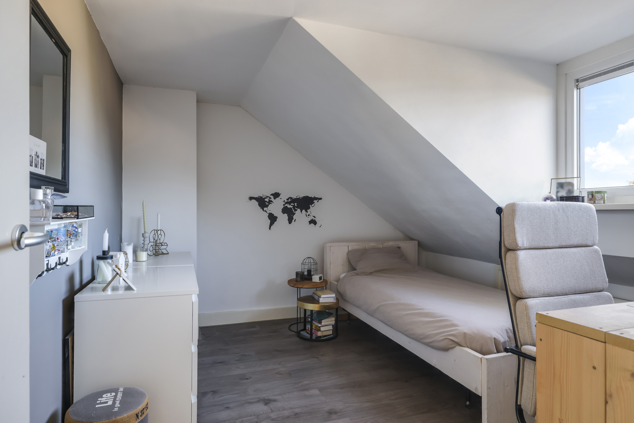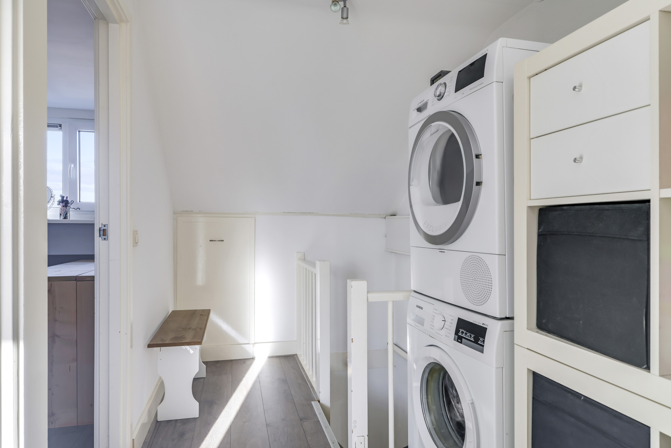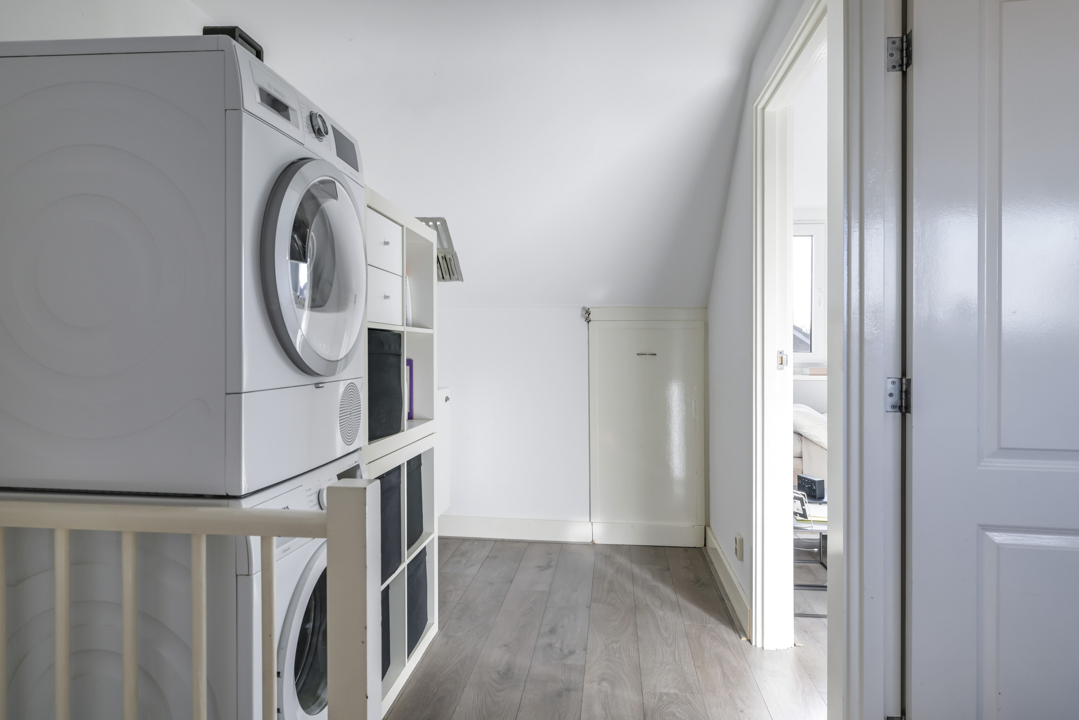 Op de voorzolder vind je zowel de wasmachine- als wasdrogeraansluiting. Deze kun je naast elkaar plaatsen terwijl er nog ruimte over is voor een droogrek. Mocht je nog een studiehoek zoeken, dan kun je hier ook een bureau kwijt. Onder de schuine kanten zijn aan beide zijden nog knieschotten (opbergruimte) te vinden.