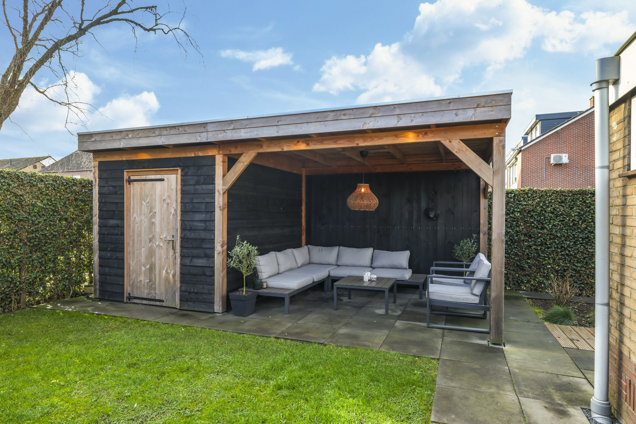 Achter de veranda is een extra schuur gebouwd (7m2), hetgeen één geheel vormt met de veranda. De schuur is ideaal voor het opbergen van tuinmeubilair, buitenspeelgoed van kinderen en/of tuingereedschap.