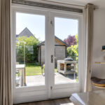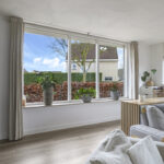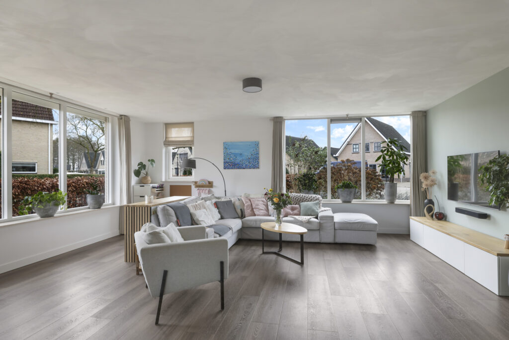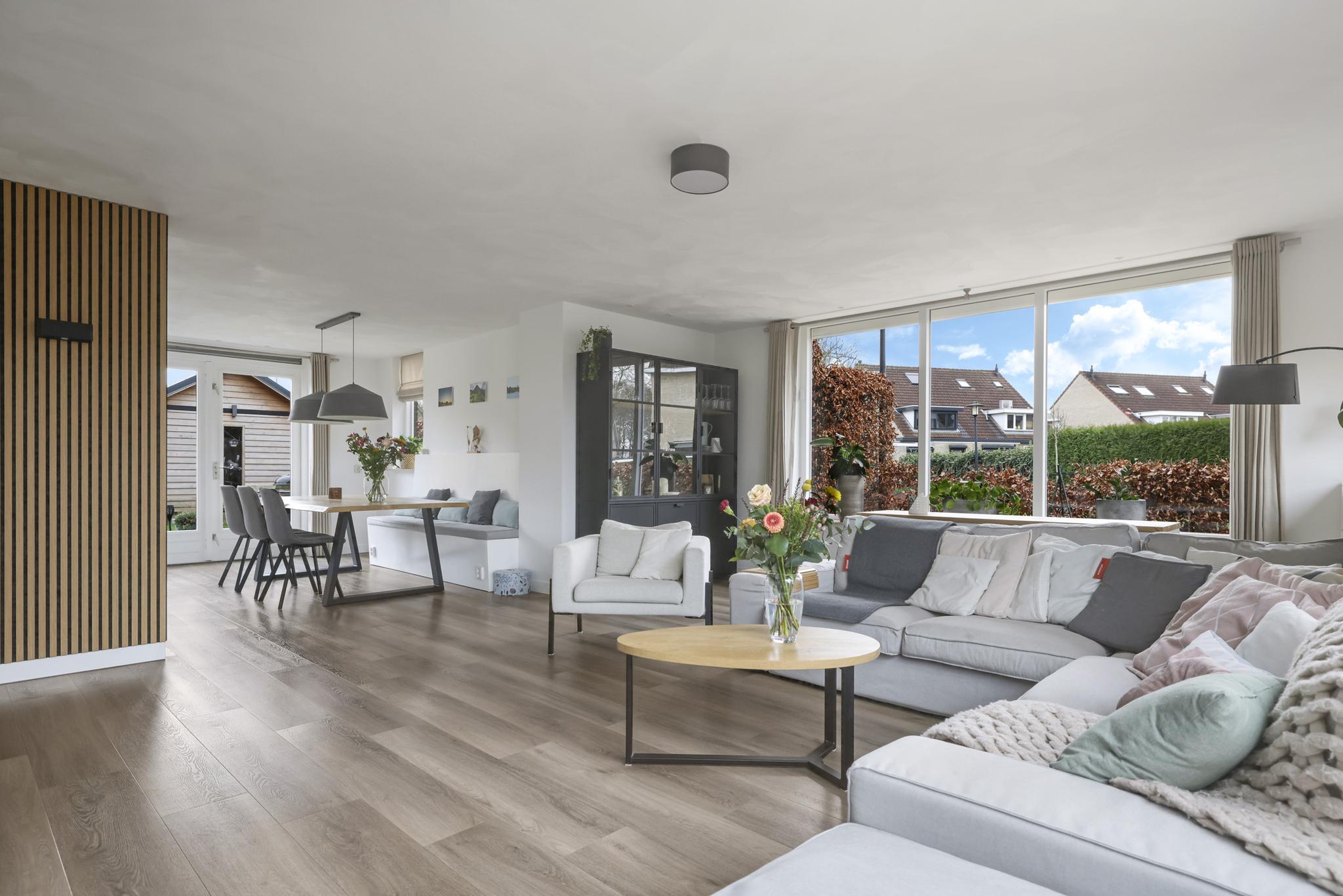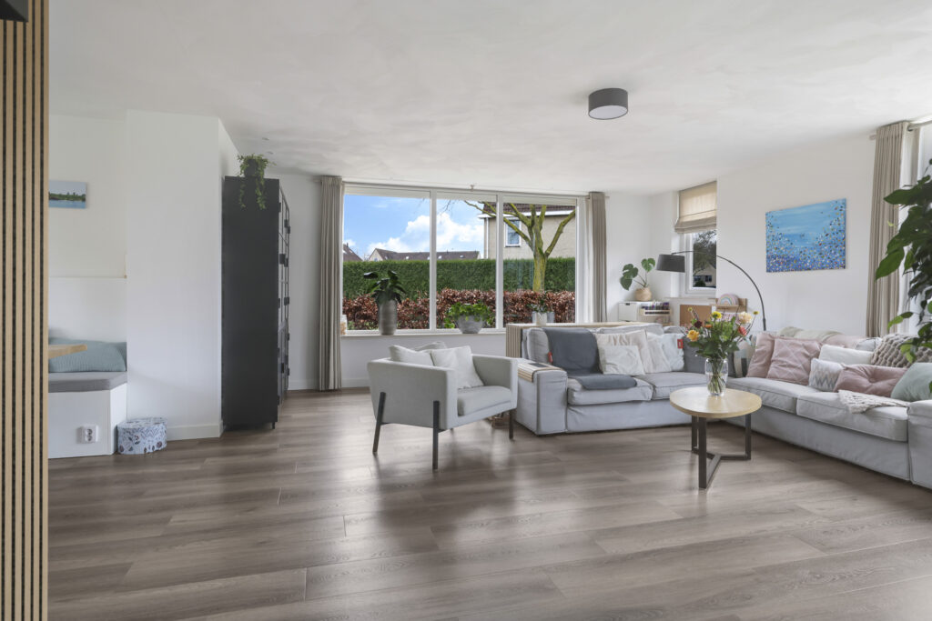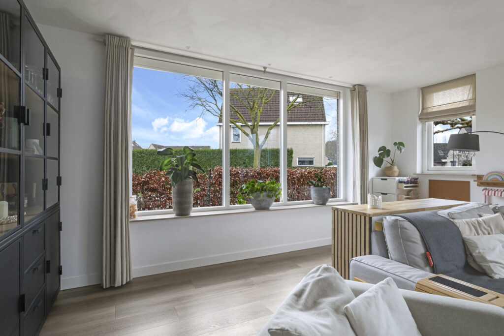 Woonkamer met veel lichtinval en dubbele terrasdeuren en grote trapkast