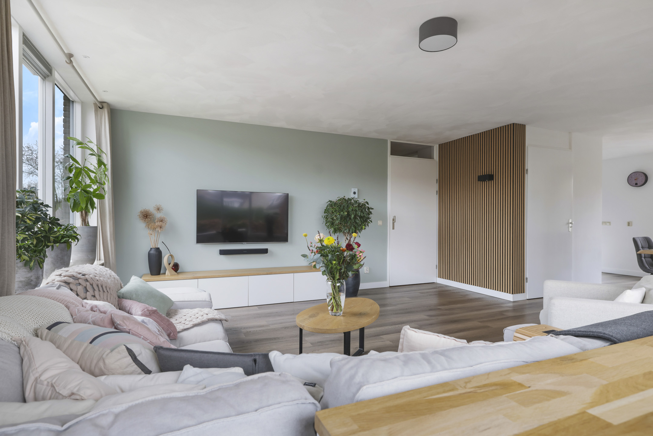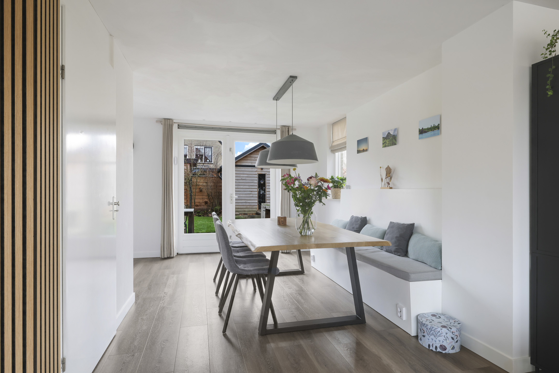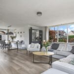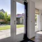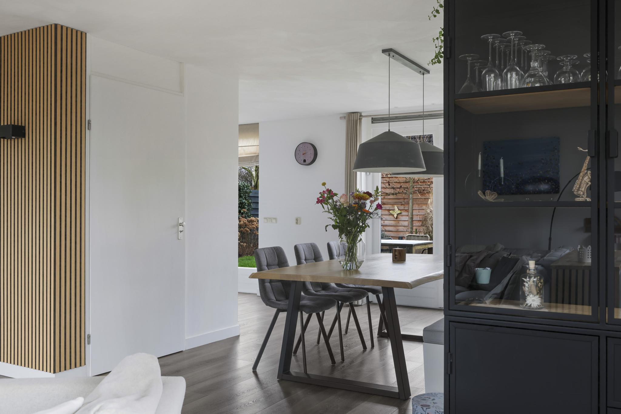 Woonkamer met veel lichtinval en dubbele terrasdeuren en grote trapkast