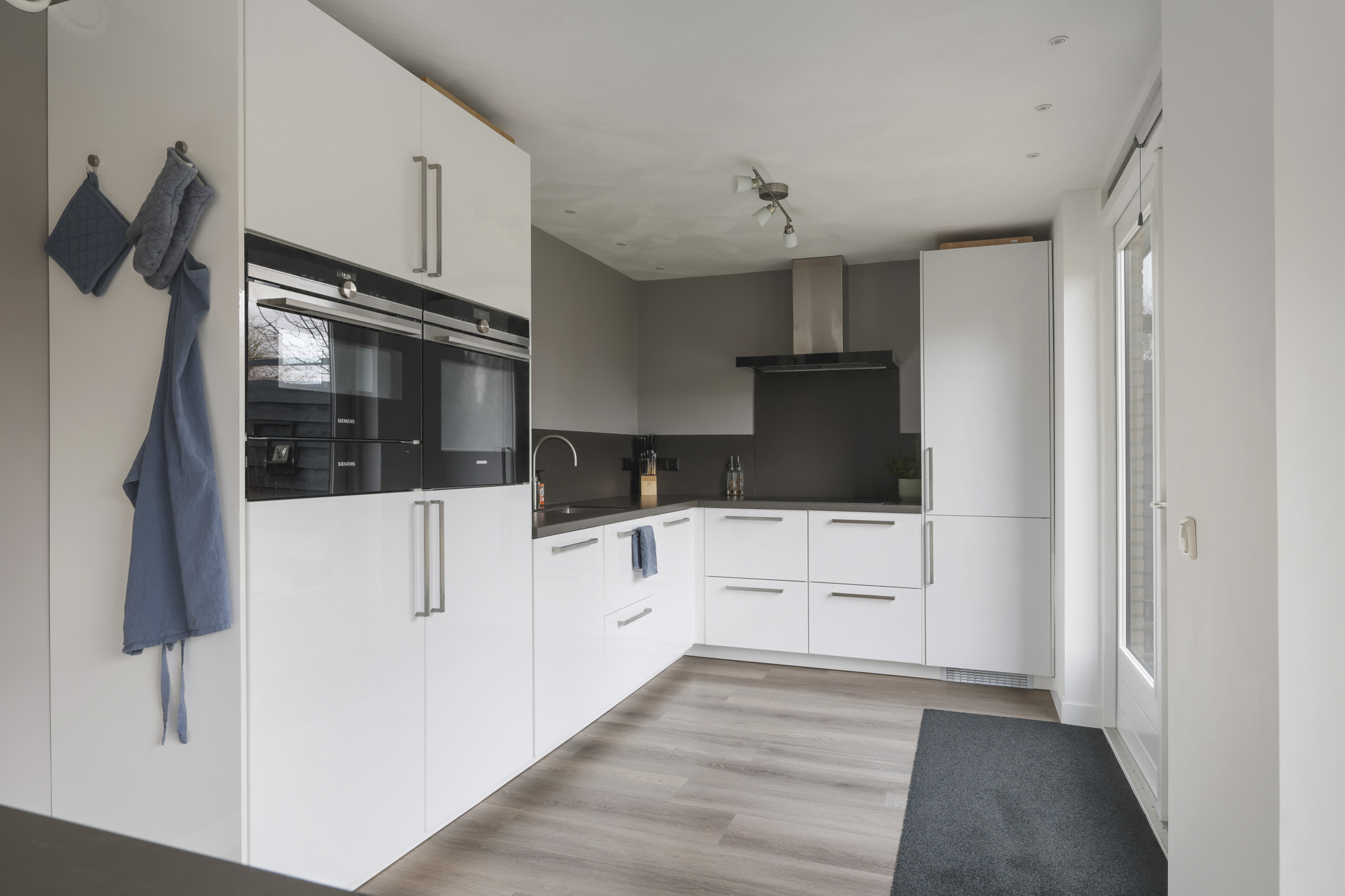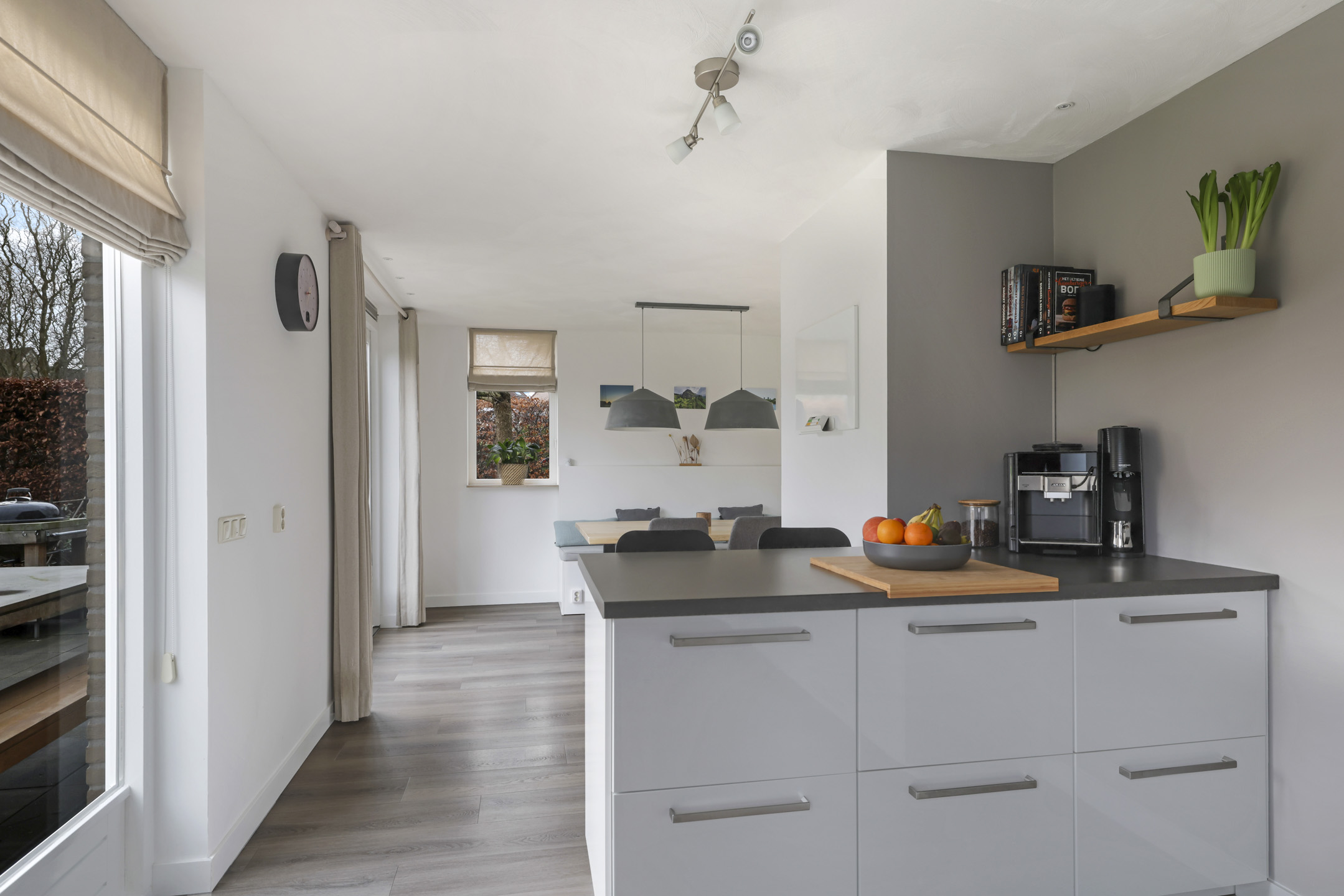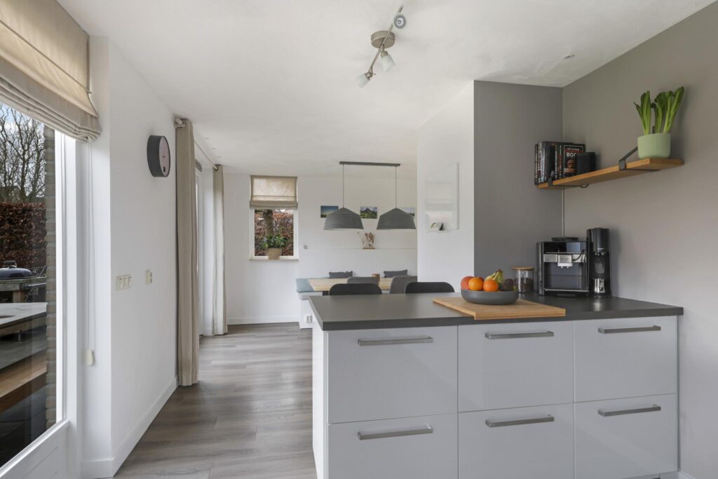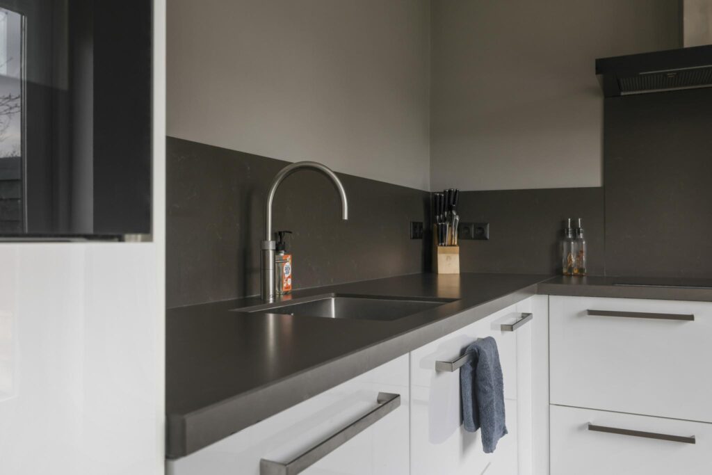 Een van de grote pluspunten van deze woning is dat een gedeelte van de garage is gebruikt om een grotere keuken te realiseren. Samen met de dubbele openslaande tuindeuren is ook dit een erg aangenaam lichte ruimte. Door de royale ruimte is er ook gekozen om 2 keukenblokken te plaatsen: een grote hoekopstelling én een schiereiland met ontzettend veel geïntegreerde kastruimte. Wanneer je van koken houdt is deze keuken dan ook zeker ideaal. Zo heb je hier een stoomoven, een combi-oven/magnetron en zelfs een warmhoud-lade. Het koken zelf doe je op een inductiekookplaat. Uiteraard is er ook een vaatwasser, koelkast en vriezer aanwezig. Een Quooker complementeert het luxe comfort en zorgt ervoor dat er altijd direct kokend water uit te kraan beschikbaar is: een kop thee is dan ook snel gezet! Voor beide keukenblokken is gekozen voor een tijdloze uitstraling van witte fronten en een antracietkleurig kwarts composiet maatwerkblad, hierdoor is de keuken altijd passend.