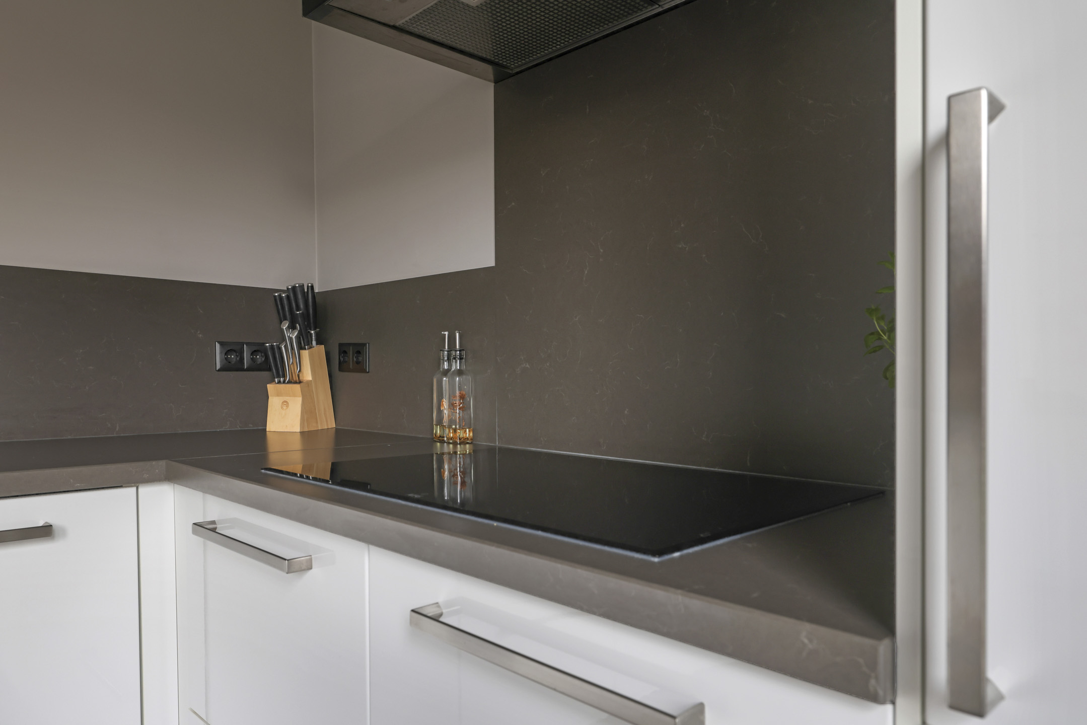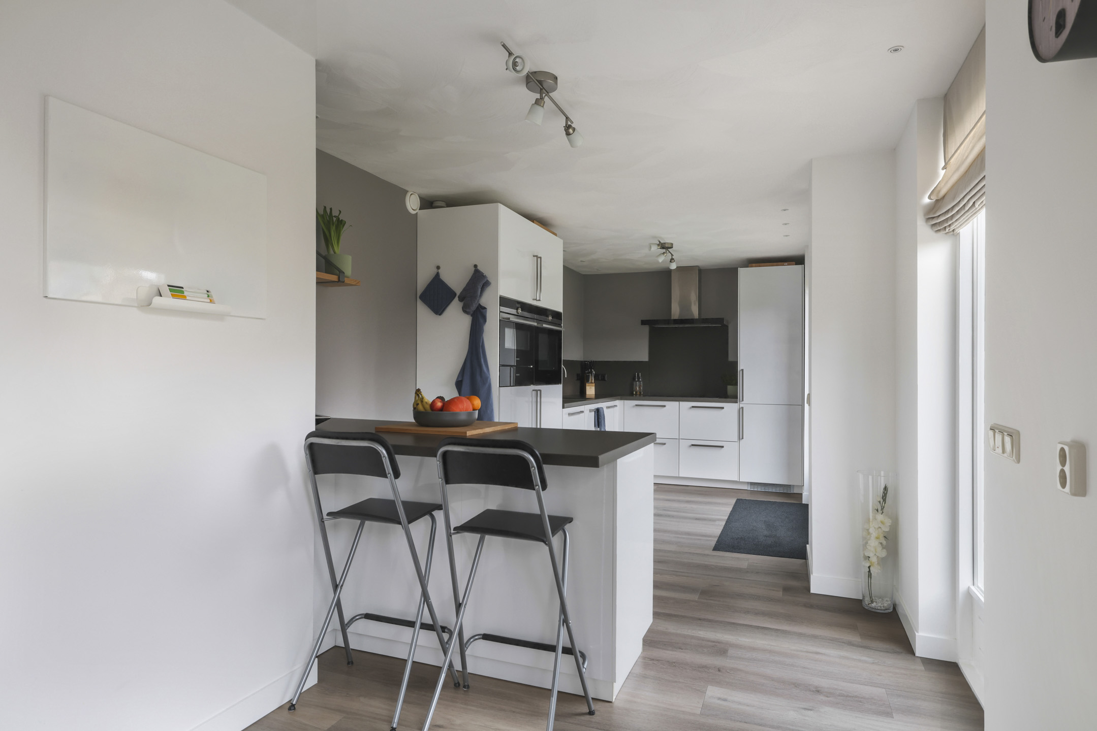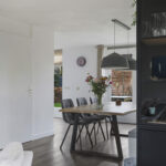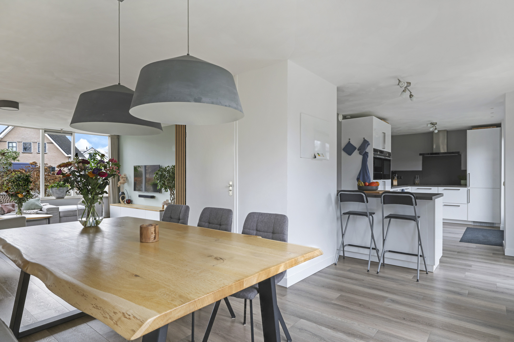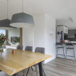Een van de grote pluspunten van deze woning is dat een gedeelte van de garage is gebruikt om een grotere keuken te realiseren. Samen met de dubbele openslaande tuindeuren is ook dit een erg aangenaam lichte ruimte. Door de royale ruimte is er ook gekozen om 2 keukenblokken te plaatsen: een grote hoekopstelling én een schiereiland met ontzettend veel geïntegreerde kastruimte. Wanneer je van koken houdt is deze keuken dan ook zeker ideaal. Zo heb je hier een stoomoven, een combi-oven/magnetron en zelfs een warmhoud-lade. Het koken zelf doe je op een inductiekookplaat. Uiteraard is er ook een vaatwasser, koelkast en vriezer aanwezig. Een Quooker complementeert het luxe comfort en zorgt ervoor dat er altijd direct kokend water uit te kraan beschikbaar is: een kop thee is dan ook snel gezet! Voor beide keukenblokken is gekozen voor een tijdloze uitstraling van witte fronten en een antracietkleurig kwarts composiet maatwerkblad, hierdoor is de keuken altijd passend.