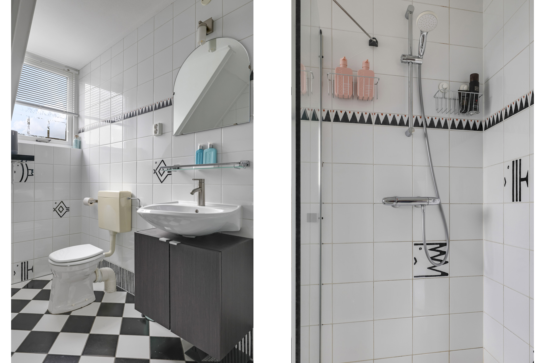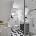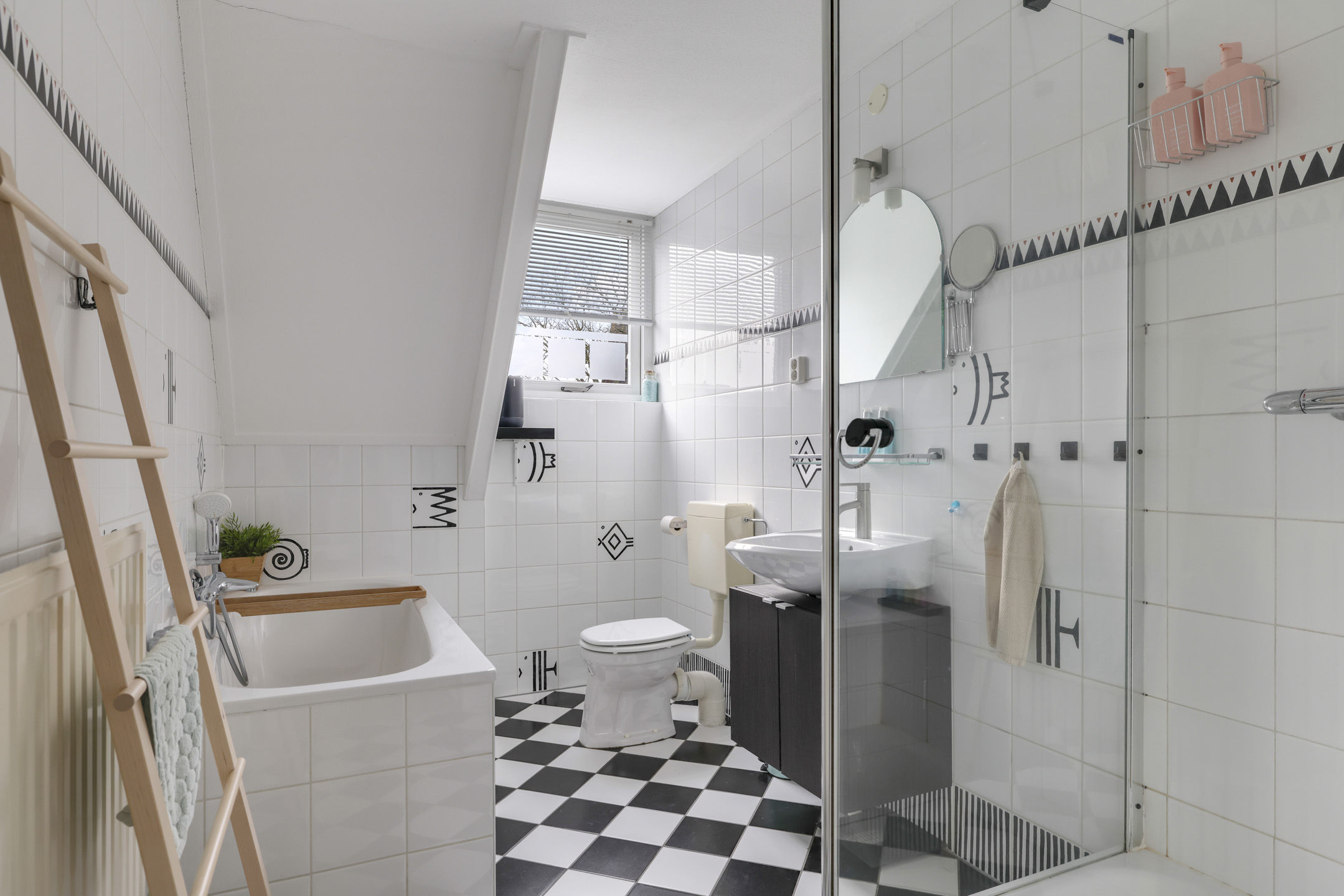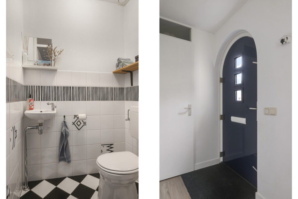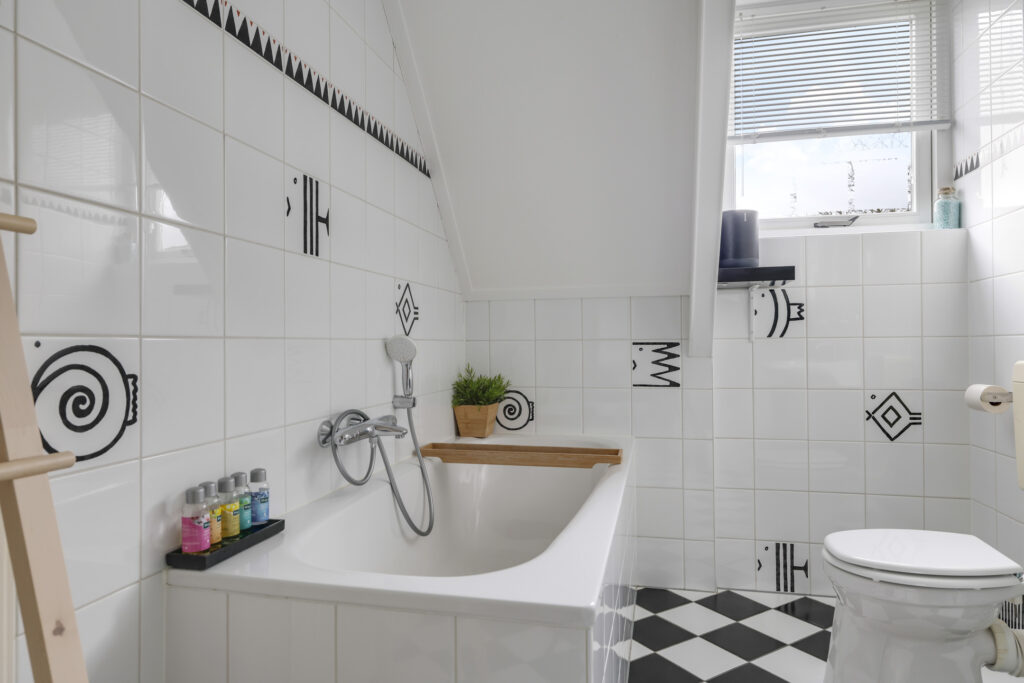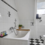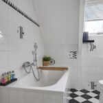 Tussen de slaapkamers in, is de badkamer gelegen. Deze ruimte is in lijn met de rest van de woning ruim opgezet. Door de dakkapel is de ruimte zelfs nog iets groter geworden. Het zal dan ook niet verbazen dat alle wenselijke sanitair aanwezig is, zijnde een ligbad, een douche, een 2e toilet en een wastafelmeubel. Ondanks al het sanitair is er ook nog voldoende bewegingsruimte over. Het tegelwerk is in een neutrale en tijdloze zwart/wit kleurstelling uitgevoerd.