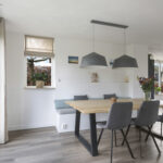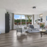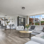 Wanneer je de woonkamer binnenkomt zie je direct dat dit een comfortabele en zeer prettige ruimte is. De ruime en speelse indeling zorgt ervoor dat je hier niet vast zit aan een standaard opstelling. Je hebt hier meer dan genoeg ruimte voor een lekkere grote hoekbank en een 6-persoons eettafel. Aan 3 zijden zijn grote raampartijen te vinden die zorgen voor veel lichtinval in de kamer. Erg prettig is de PVC-vloer welke is voorzien van vloerverwarming. Een pluspunt: in de zomer kan de vloerverwarming ook koelen waardoor de woonkamer zowel in de winter als in de zomer een comfortabele temperatuur heeft. Dit comfort wordt verder doorgetrokken door hoogwaardige elektrisch (solar) bedienbare zonwering op diverse plaatsen rondom de woning. Het grote terrasscherm beschikt hierbij bovendien ook over een windsensor. De fraaie en geheel gestucte benedenverdieping heeft aan opbergruimte overigens ook geen gebrek, want de trapkast is hier namelijk groter dan gemiddeld waardoor je hier veel in kwijt kunt.