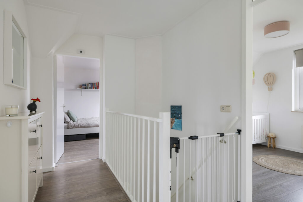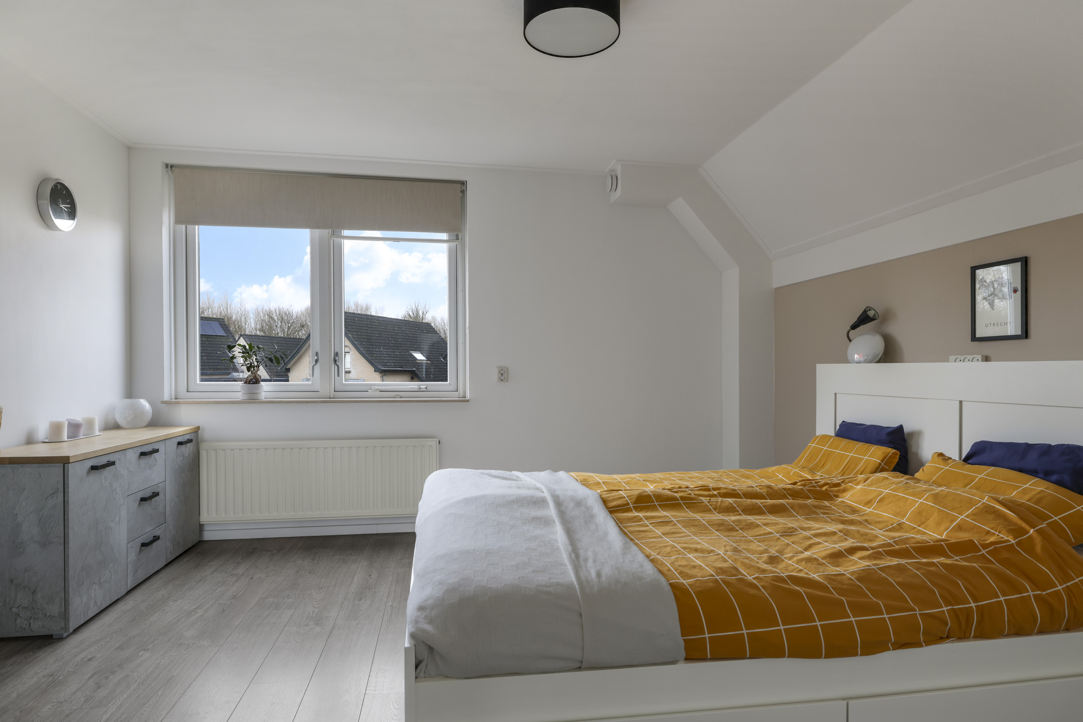 Wanneer je via de trapopgang op de 1e verdieping komt valt de ruime opzet hier direct op. Vanaf de centrale overloop zijn maar liefst 4 slaapkamers en de badkamer bereikbaar. De slaapkamers zijn eveneens ruim opgezet en zijn respectievelijk 15m², 14m², 11m² en 9m² groot. Er zit dan ook geen kleine kamer tussen. Noemenswaardig is dat elke kamer voorzien is van een UTP-kabel, ideaal wanneer je een kamer wilt gebruiken om thuis te werken. De hoofdslaapkamer aan de voorzijde van de woning is voorzien van een riante walk-in-closet. De slaapkamer boven de ‘garage’ heeft een brede kastenwand wat voor veel opbergruimte zorgt. De kinderkamers aan de achterzijde (zonkant) zijn voorzien van elektrisch (solar) bedienbare rolluiken, waardoor de kamers prettig qua klimaat blijven en geheel te verduisteren zijn.