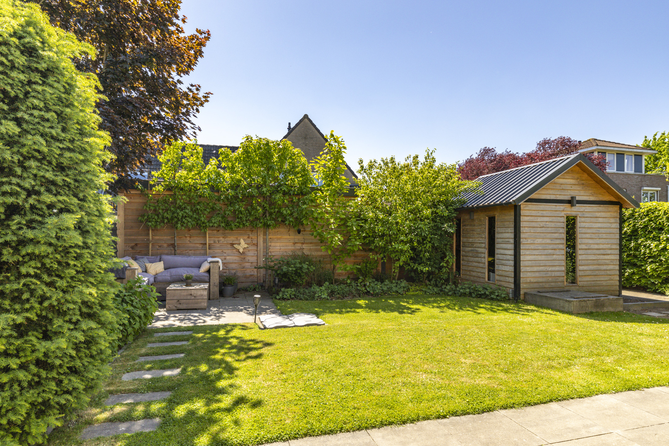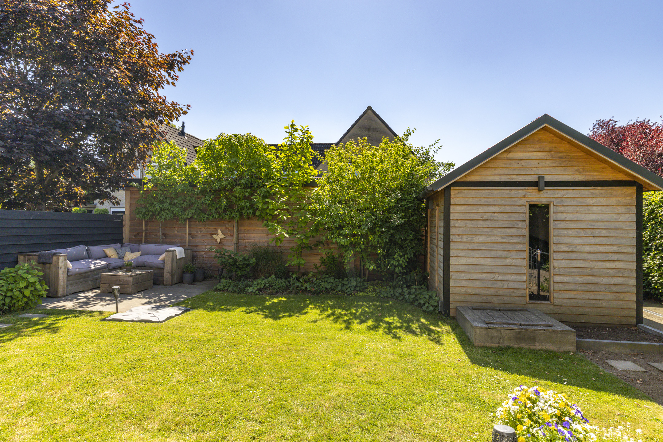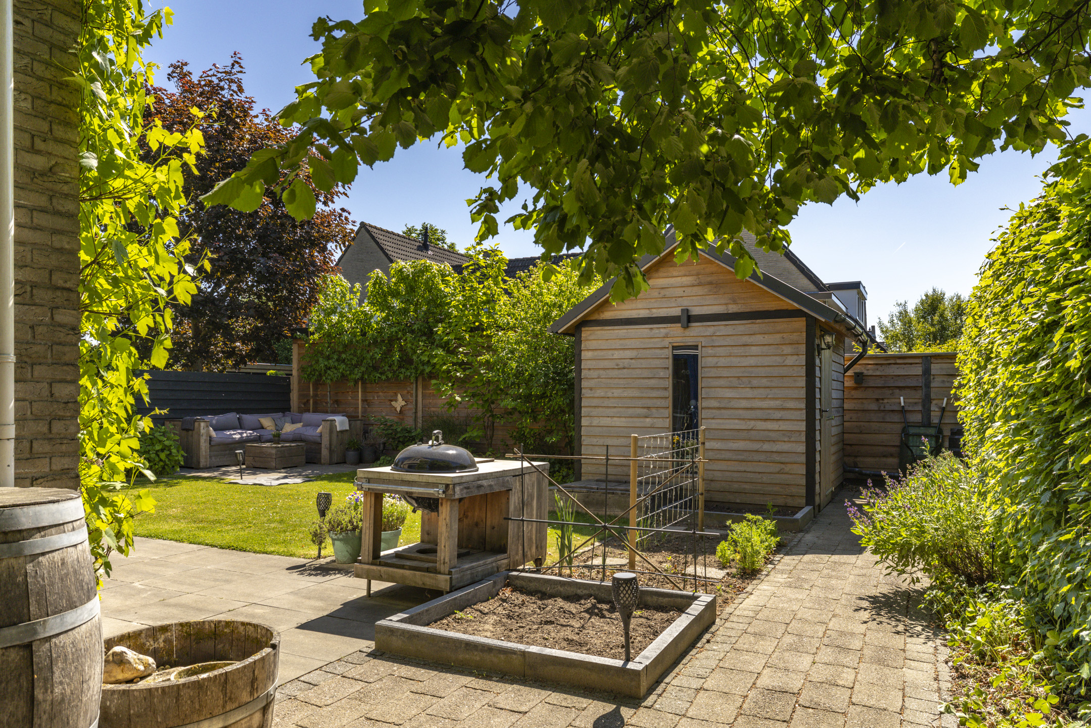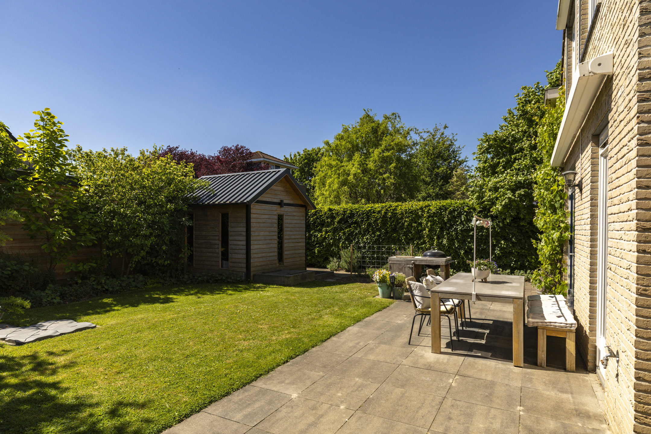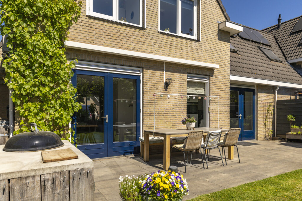 Net als de woning zelf, ligt de tuin er keurig verzorgd bij. De tuin is groen aangelegd met een beukenhaag, een grasveld, volwassen beplanting en enkele (lei)bomen. Zowel bij de woning als achterin de tuin is een terras aangelegd waardoor je diverse zithoeken kwijt kunt en op elk moment van de dag kunt genieten van de zon. In de tuin zijn meerdere elektrische aansluitingen. De schuur zorgt voor een fijne opbergruimte en heeft met het zadeldak en de ramen ook een moderne uitstraling.