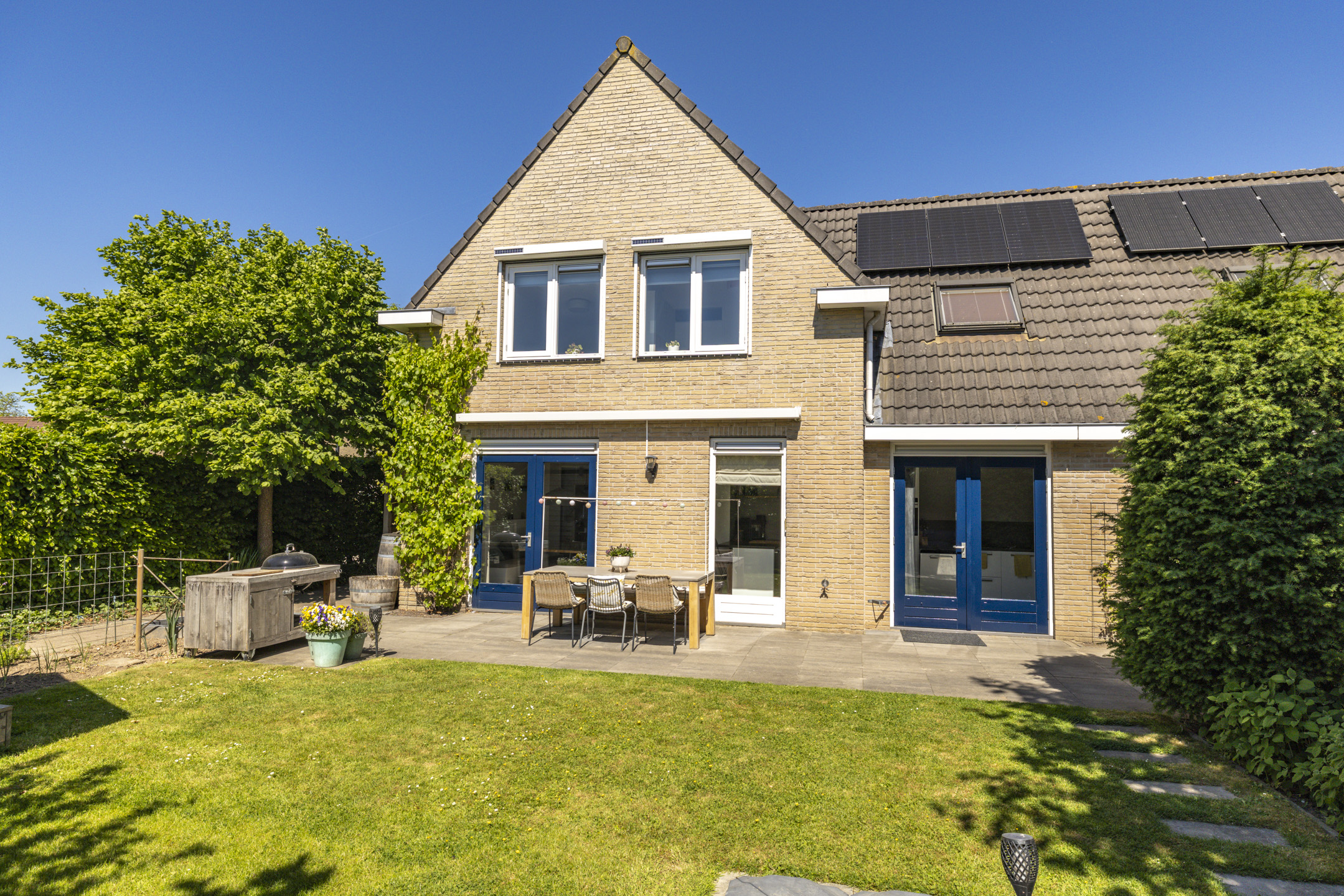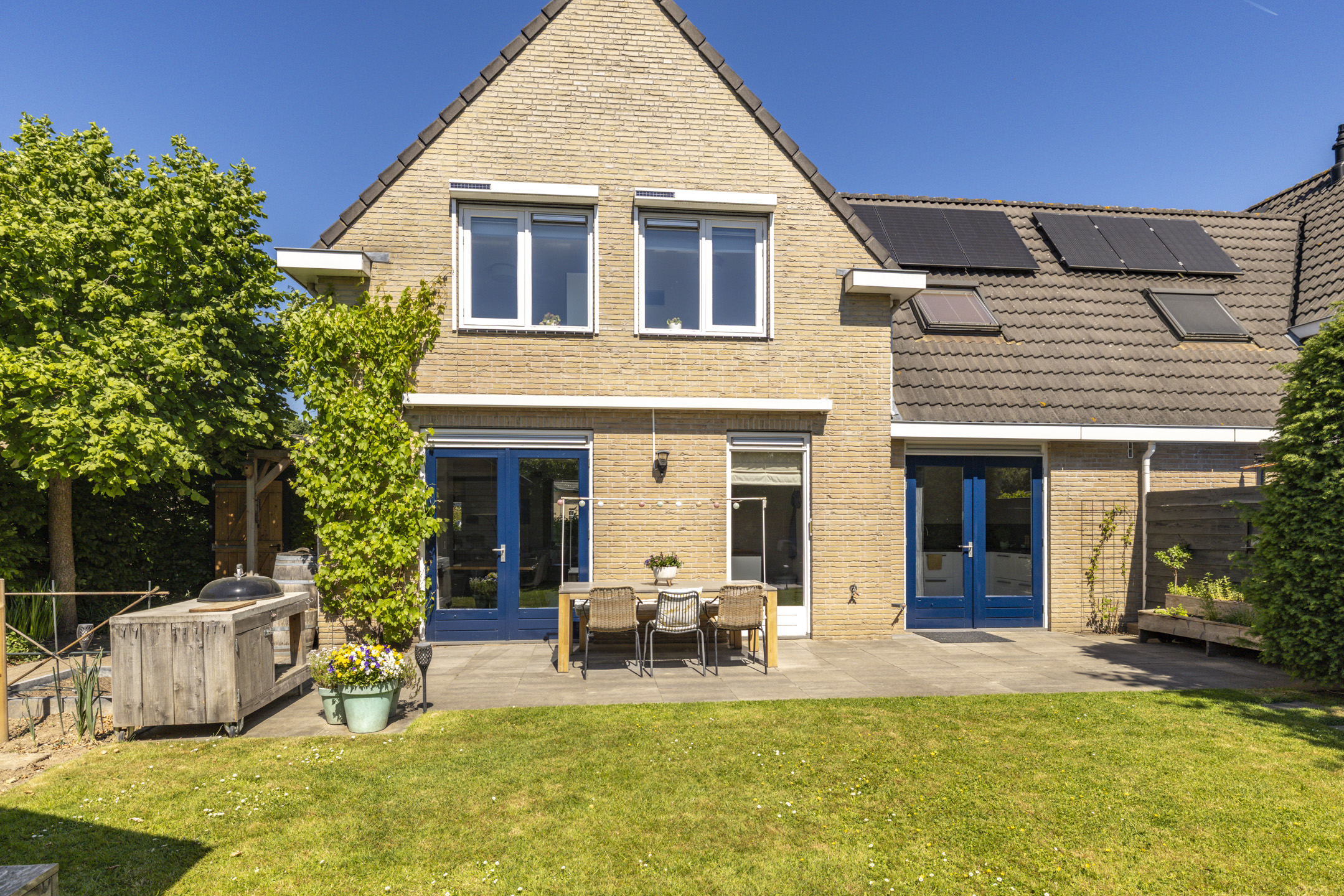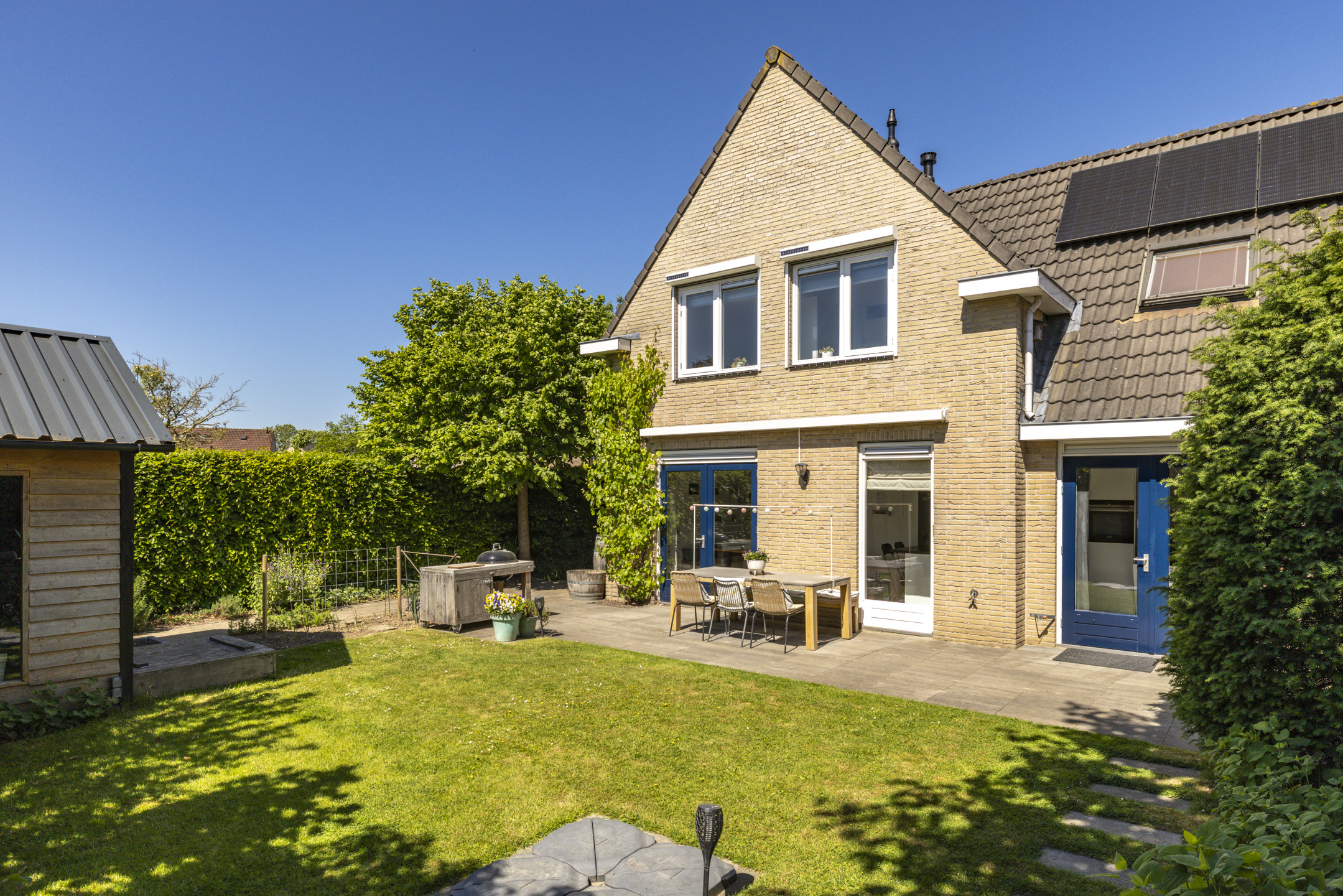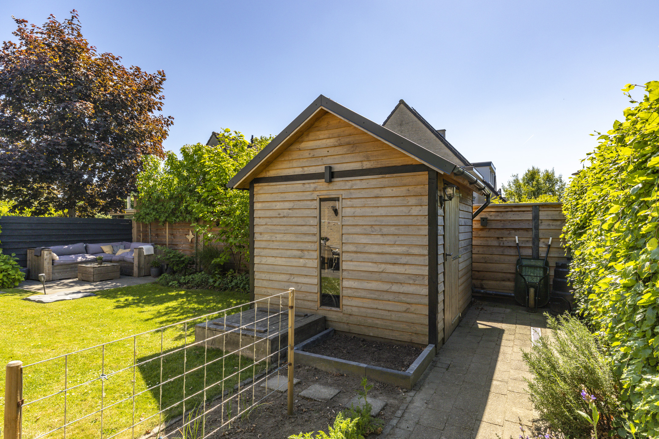 Net als de woning zelf, ligt de tuin er keurig verzorgd bij. De tuin is groen aangelegd met een beukenhaag, een grasveld, volwassen beplanting en enkele (lei)bomen. Zowel bij de woning als achterin de tuin is een terras aangelegd waardoor je diverse zithoeken kwijt kunt en op elk moment van de dag kunt genieten van de zon. In de tuin zijn meerdere elektrische aansluitingen. De schuur zorgt voor een fijne opbergruimte en heeft met het zadeldak en de ramen ook een moderne uitstraling.