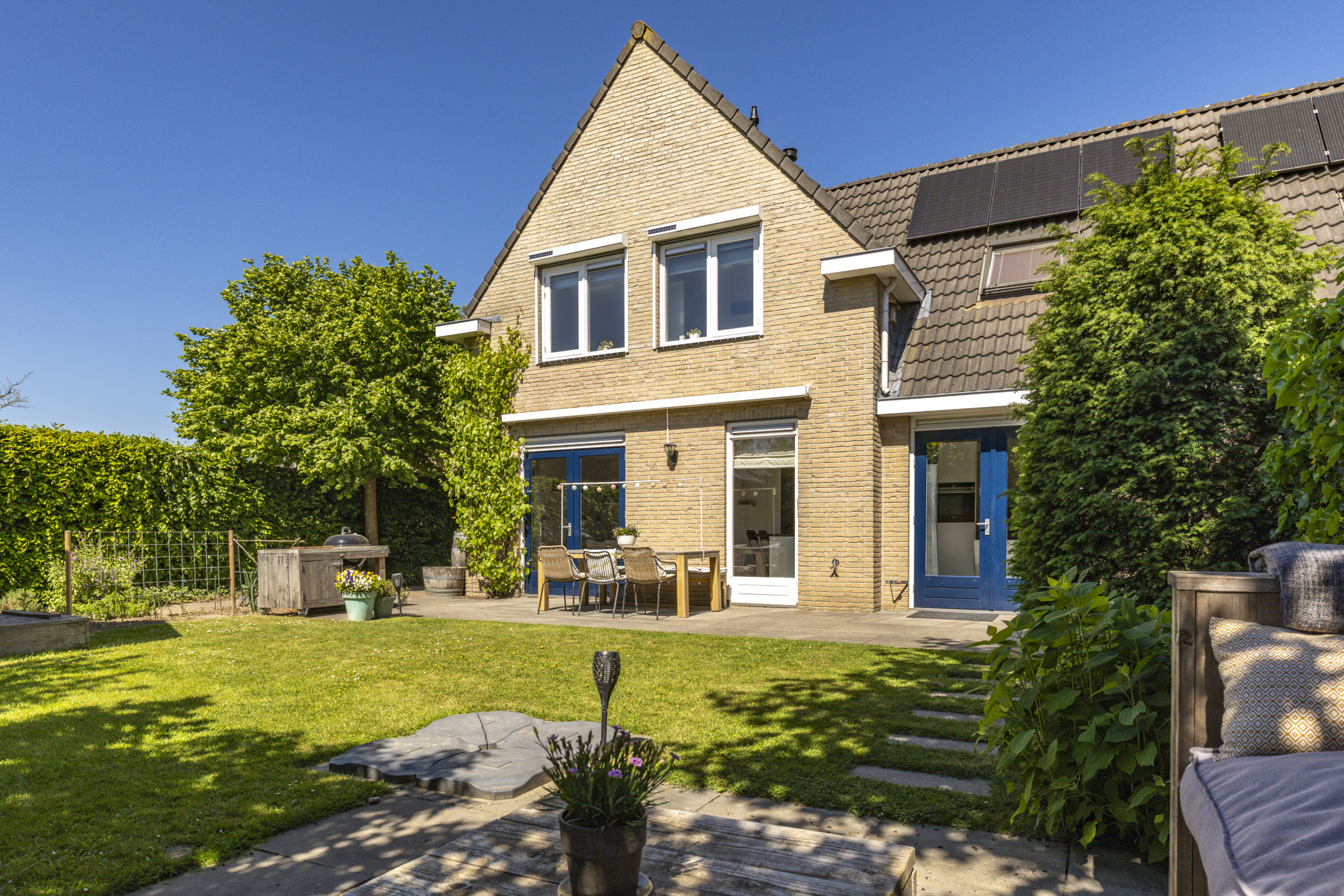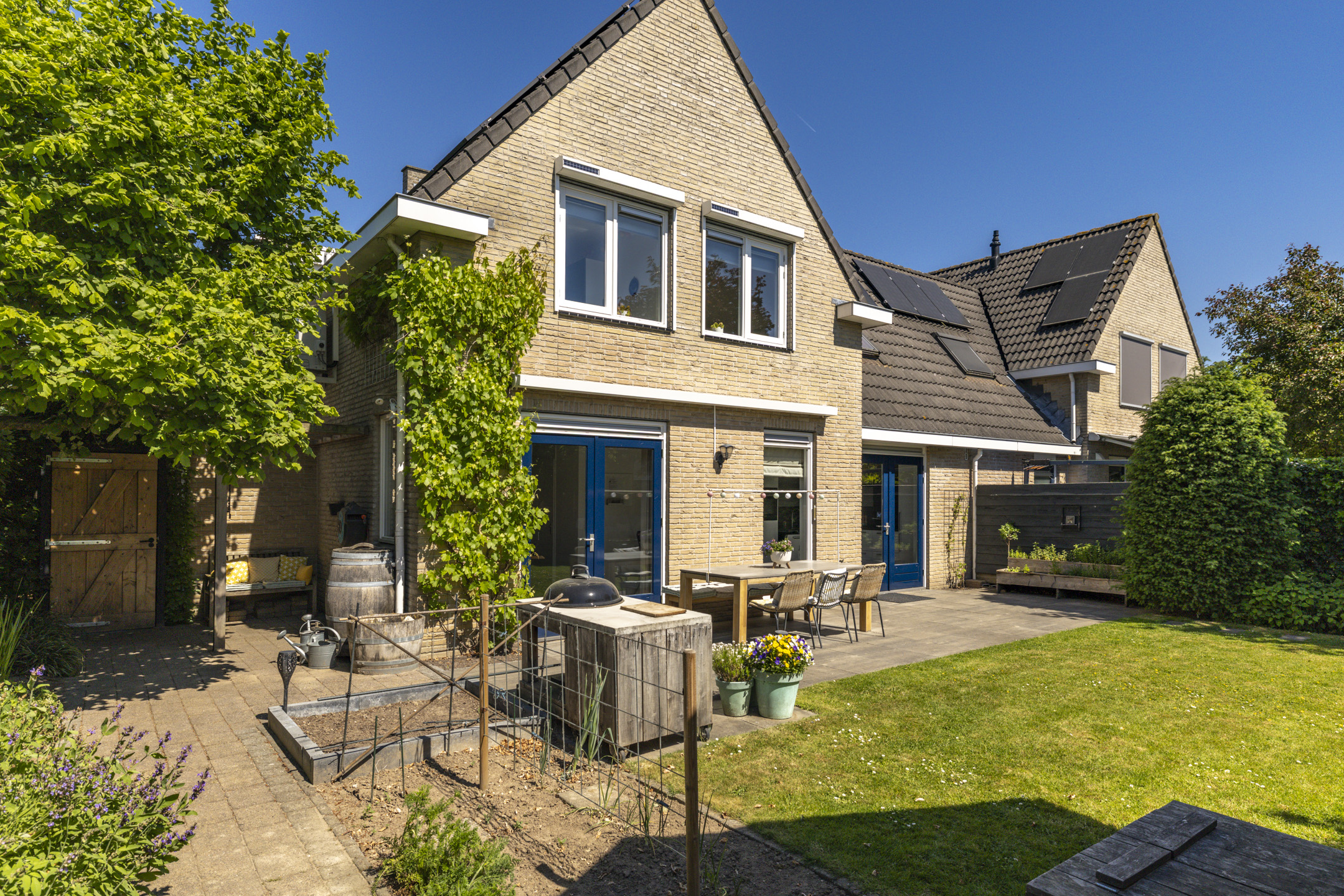 Ook de tuin ligt er opvallend verzorgd bij met aan de voorzijde een diepe en brede oprit met plaats voor 2-3 auto’s op eigen terrein. Langs de woning is een afsluitbare achterom gelegen met toegang tot de achtertuin. Hier vind je meerdere zonnige terrassen waarvan 1 met vaste zonwering en een vrijstaande schuur met zadelkap en vliering.