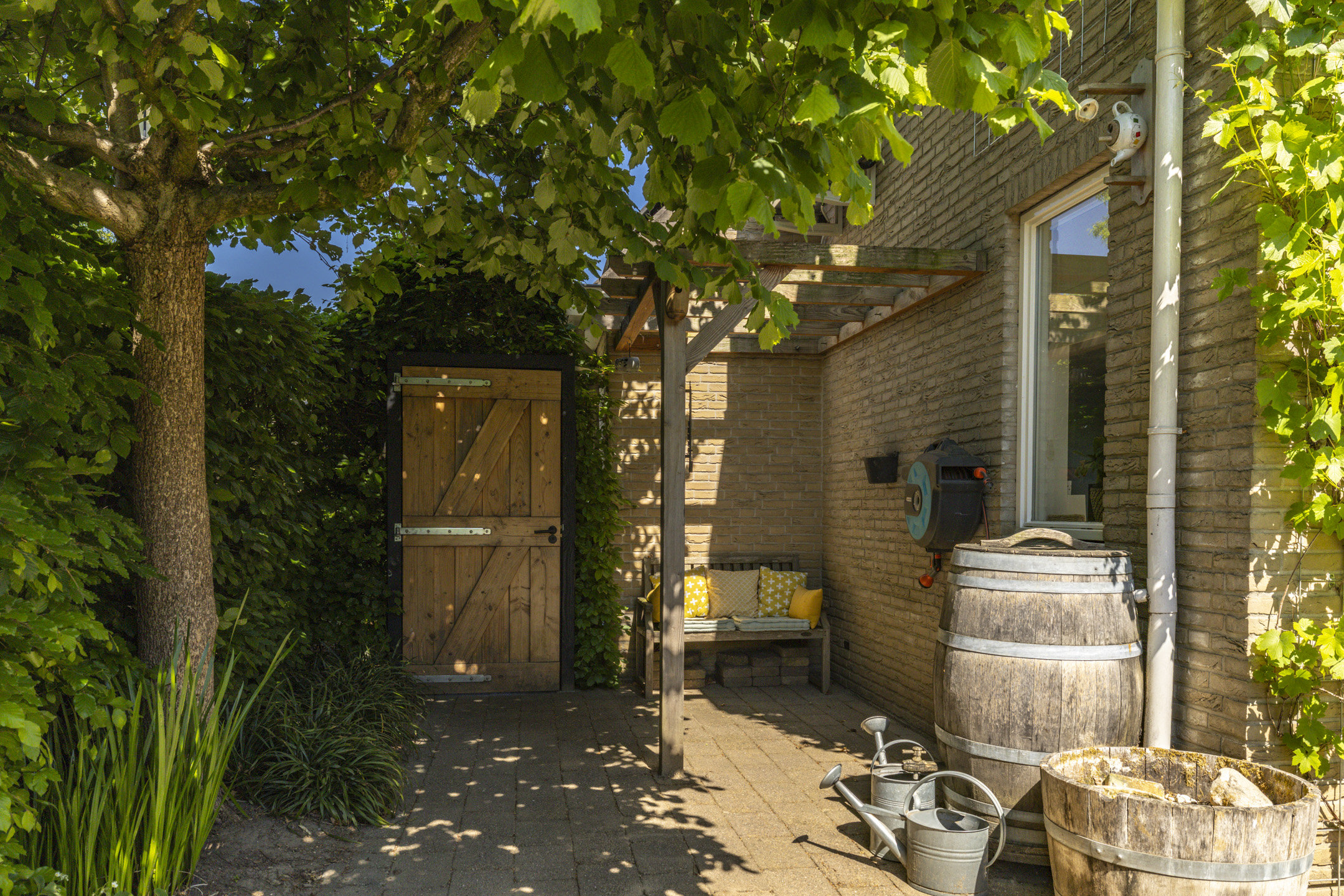Deze woning staat ook in het teken van het buitenleven. Ben je een tuinliefhebber en zit je graag buiten, dan zal deze afgeschermde tuin je zeker aanspreken. Wanneer alles vanaf het voorjaar in het blad staat, kun je in de achtertuin gelegen op het zuiden geweldig vrij zitten en genieten van behoorlijk wat privacy. De woning staat daarbij gunstig op het perceel waarbij de meeste tuin ook aan de achterzijde is (11,5m diep en 14m breed). Vanuit de voortuin loopt er een (afsluitbaar) pad om de woning heen naar de achtertuin.