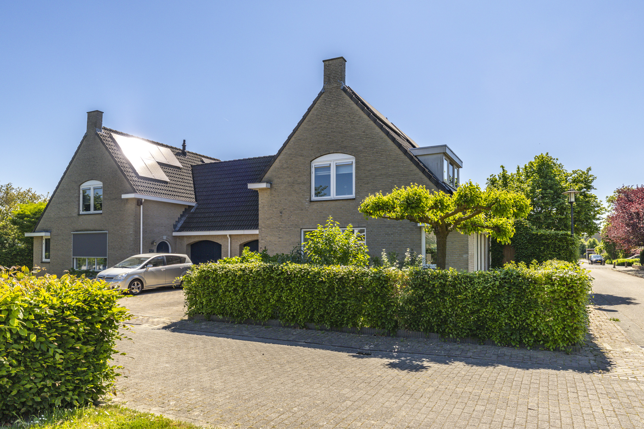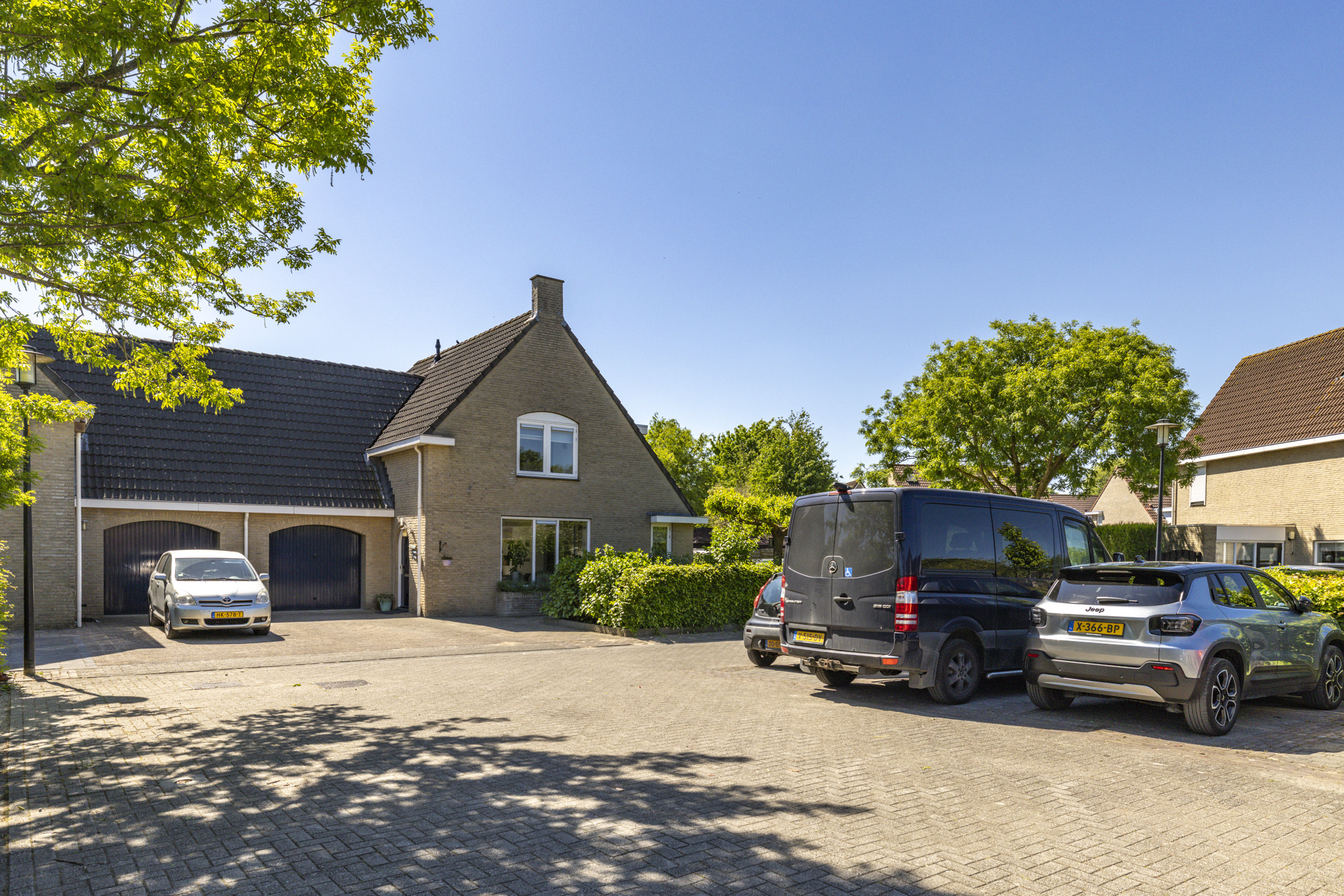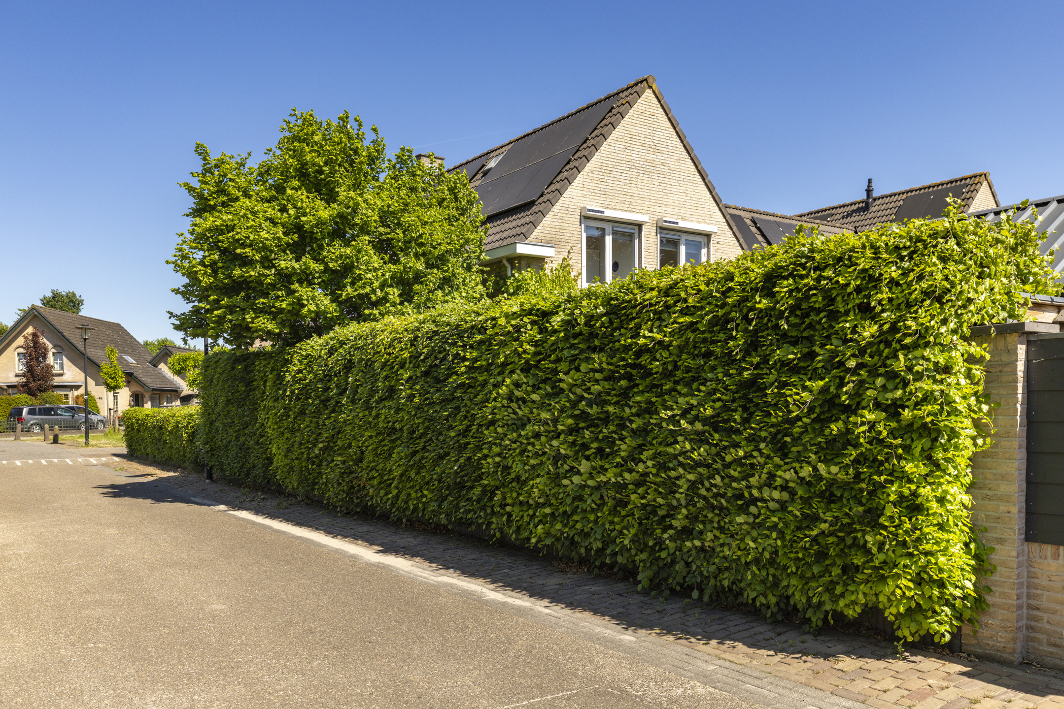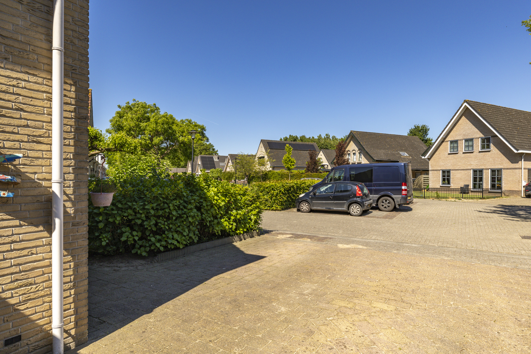 Ook de voortuin heeft een goed formaat. Door de breedte van de woning kunnen er 2-3 auto’s op de oprit zonder daarbij direct een auto voor het raam te hebben staan. Net als de achtertuin is ook de voortuin verzorgd aangekleed met een beukenhaag en diverse kleurrijke planten, waaronder hortensia’s, forsythia, philadelphus en ribes. Samen met de vlinderstruiken en een moerbeiboom zorgen ze in volle bloei ook weer voor een hoop extra privacy aan de voorkant van de woning.