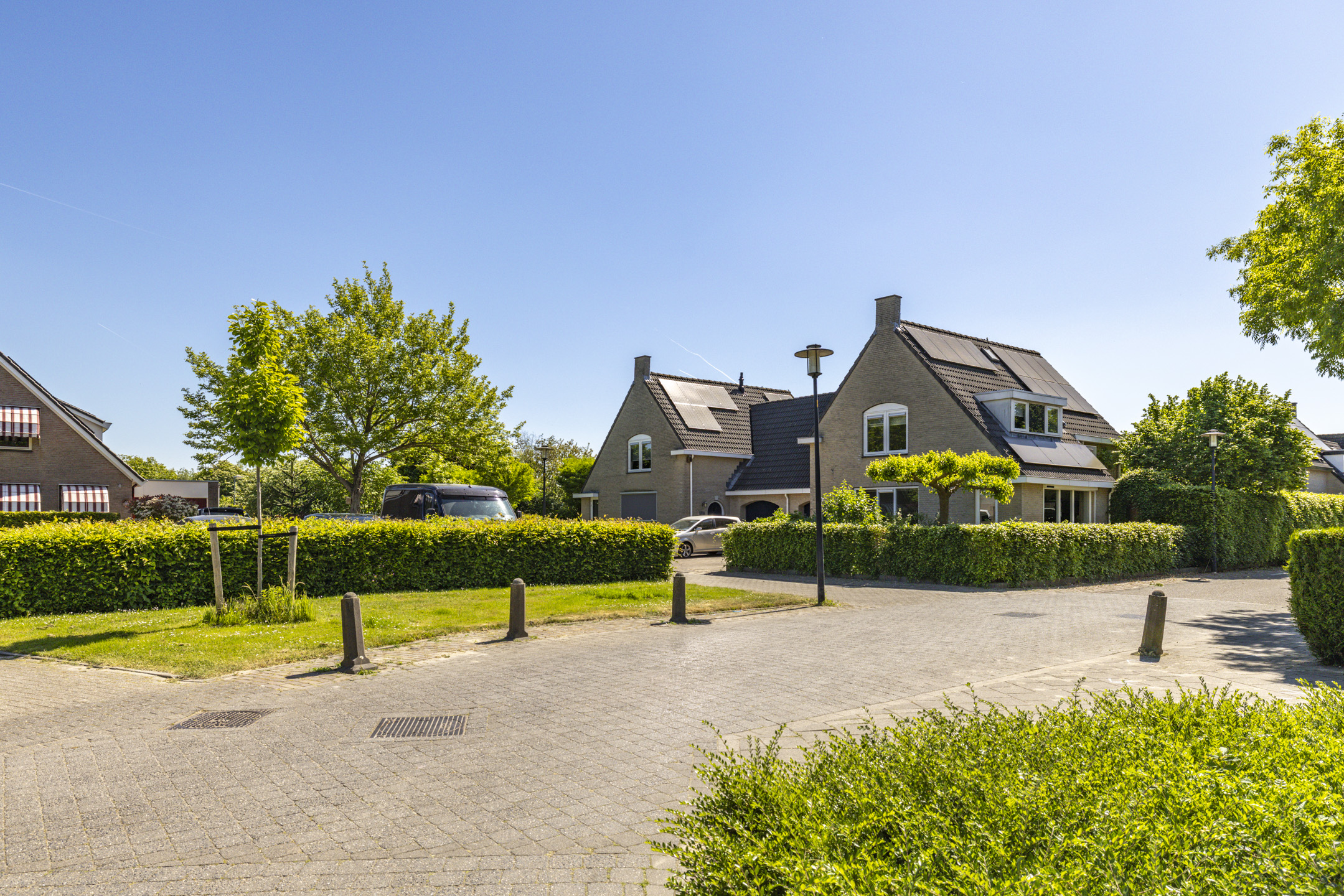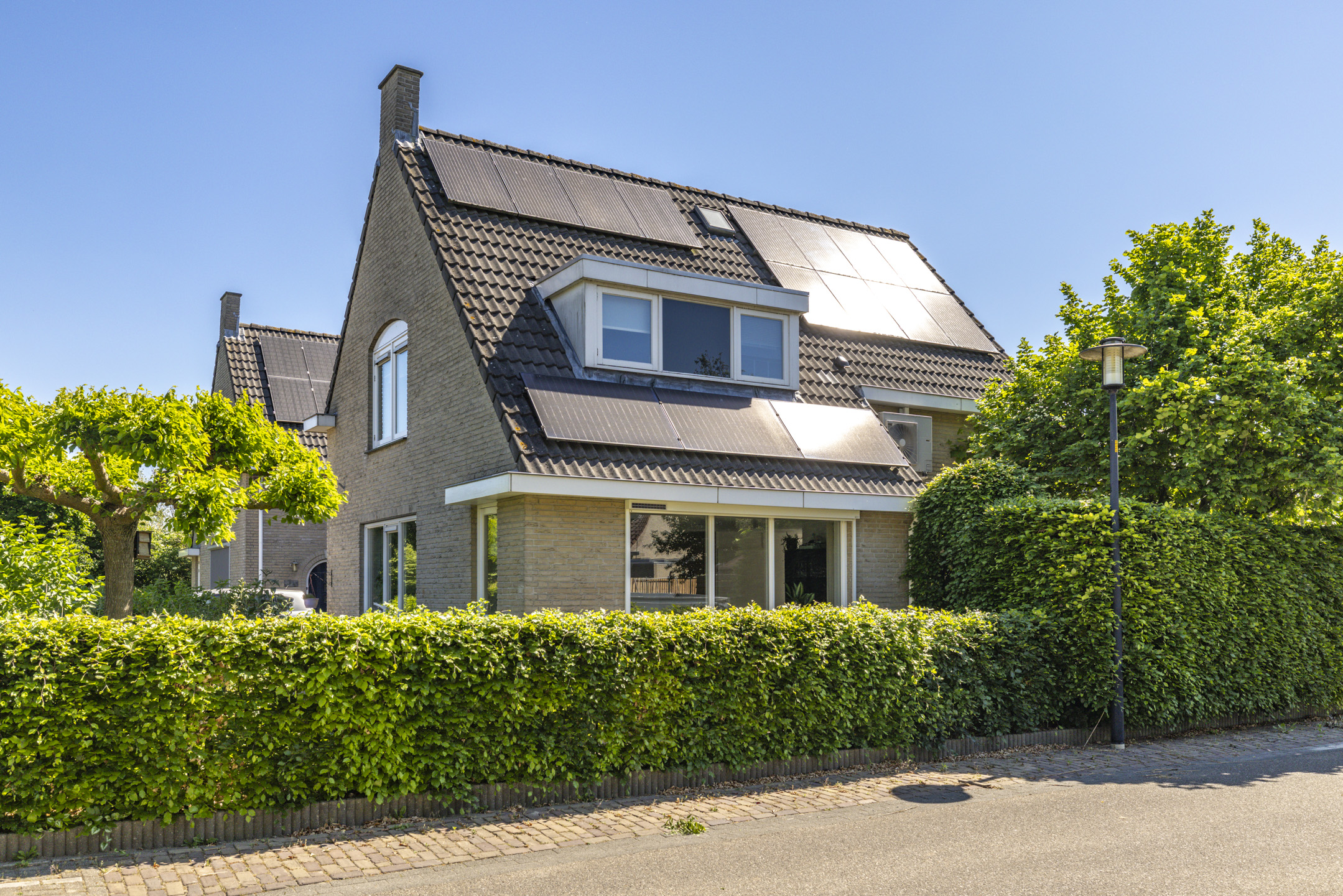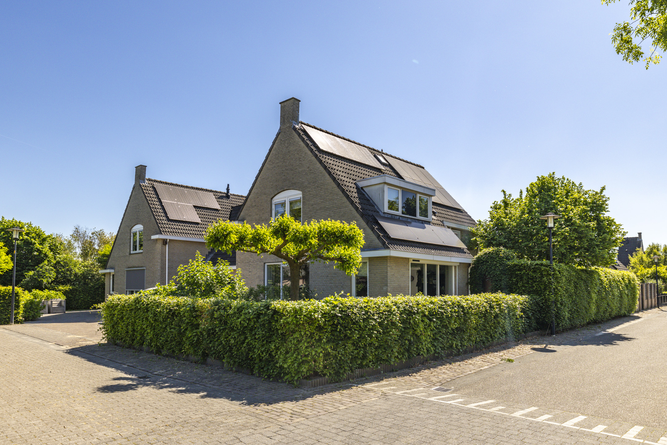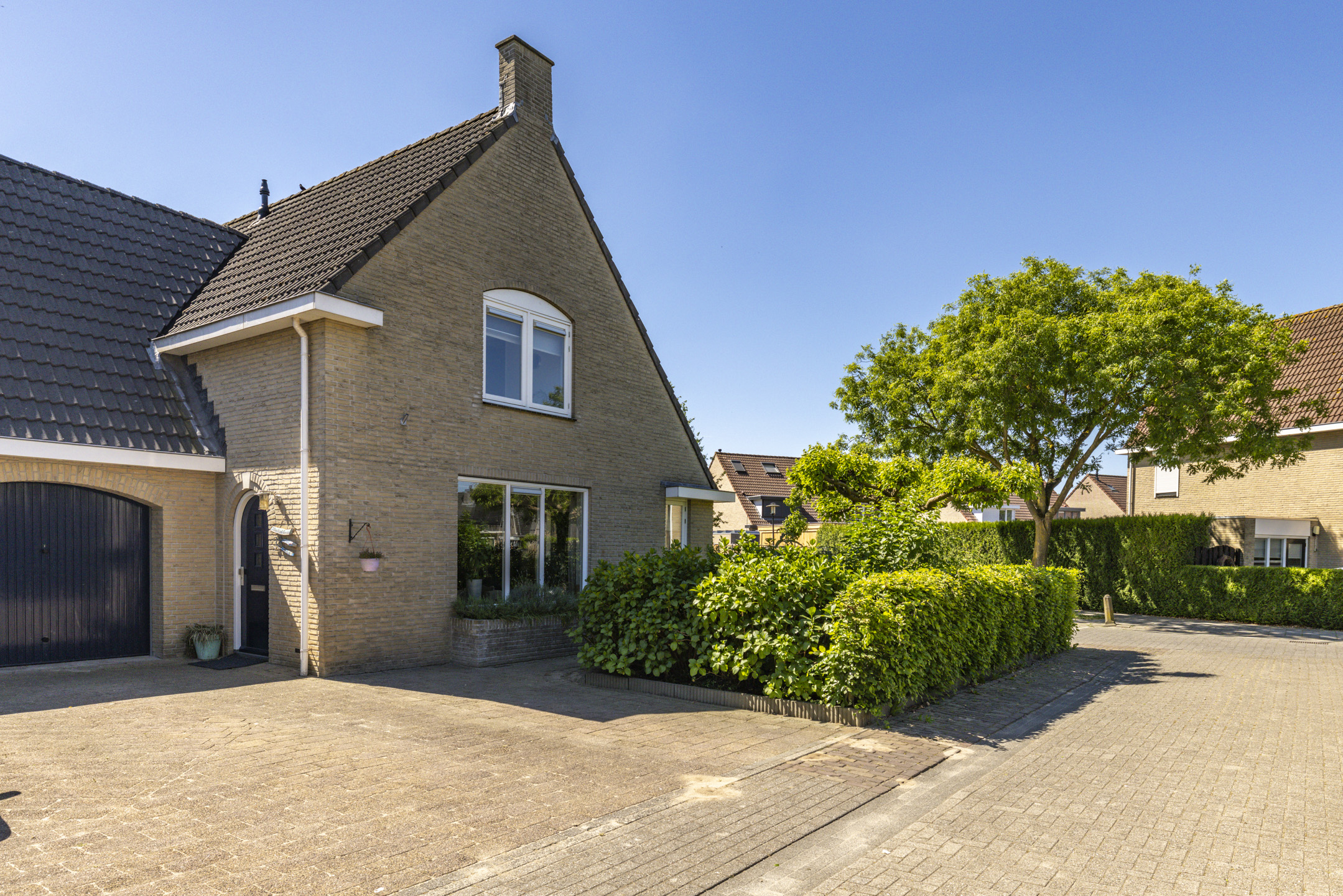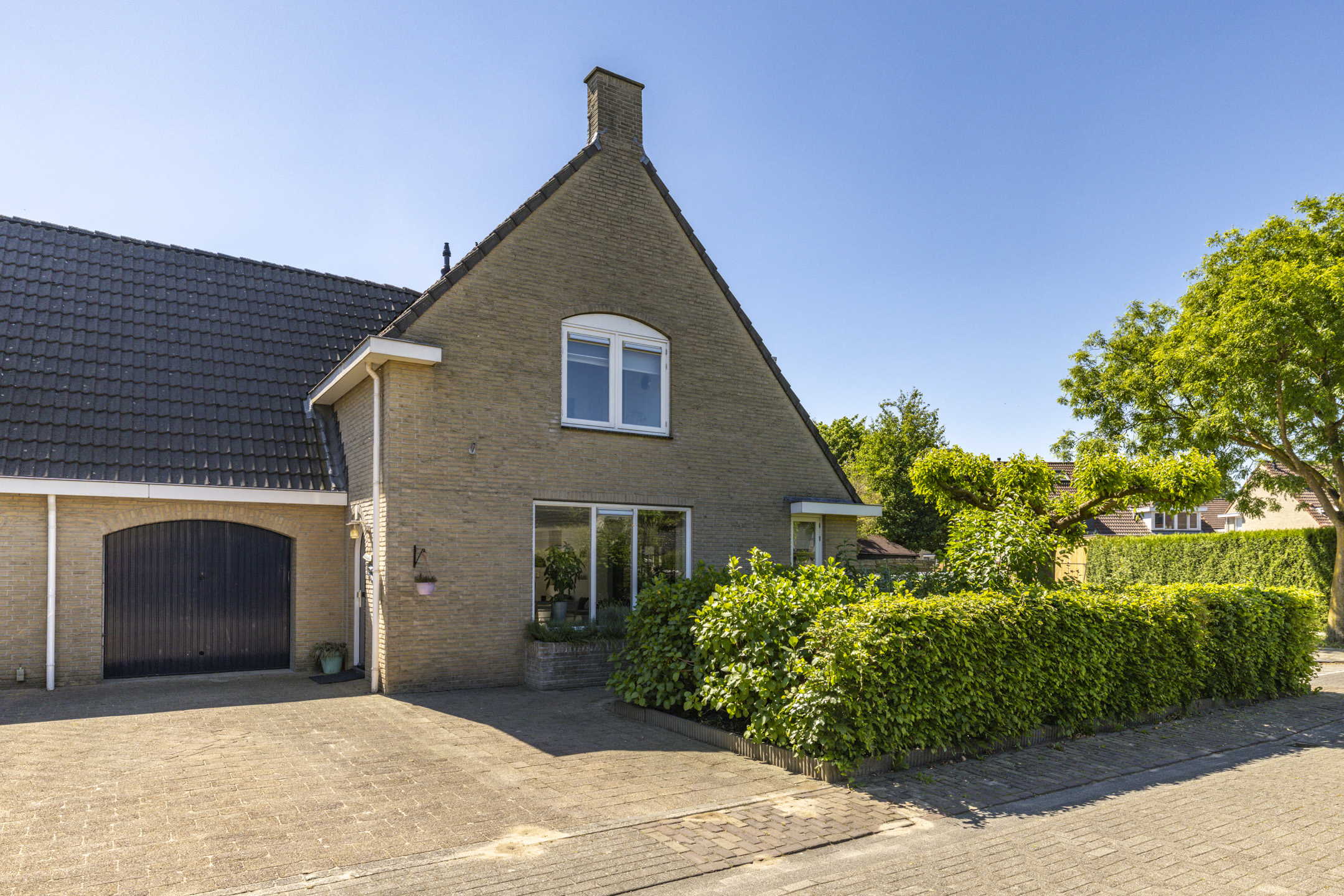 Ook de voortuin heeft een goed formaat. Door de breedte van de woning kunnen er 2-3 auto’s op de oprit zonder daarbij direct een auto voor het raam te hebben staan. Net als de achtertuin is ook de voortuin verzorgd aangekleed met een beukenhaag en diverse kleurrijke planten, waaronder hortensia’s, forsythia, philadelphus en ribes. Samen met de vlinderstruiken en een moerbeiboom zorgen ze in volle bloei ook weer voor een hoop extra privacy aan de voorkant van de woning.