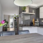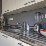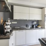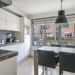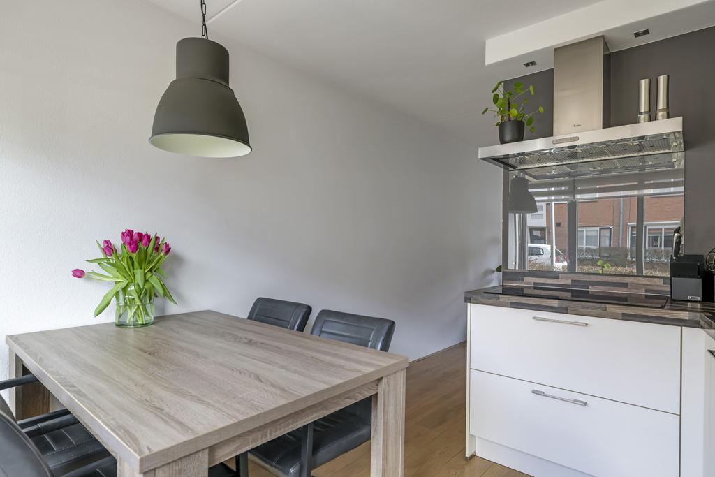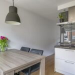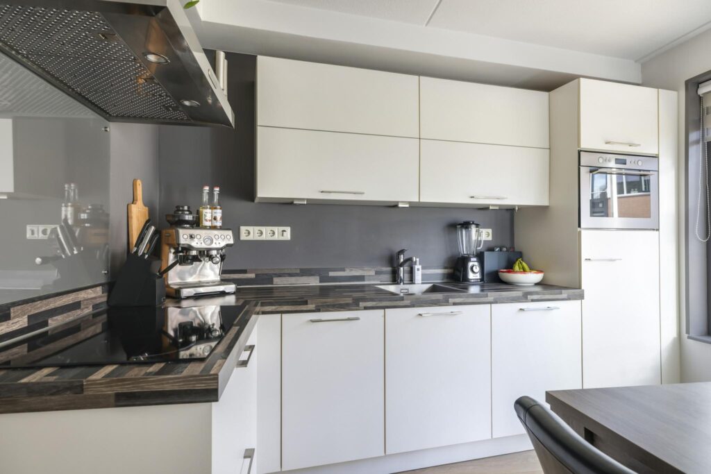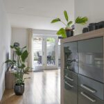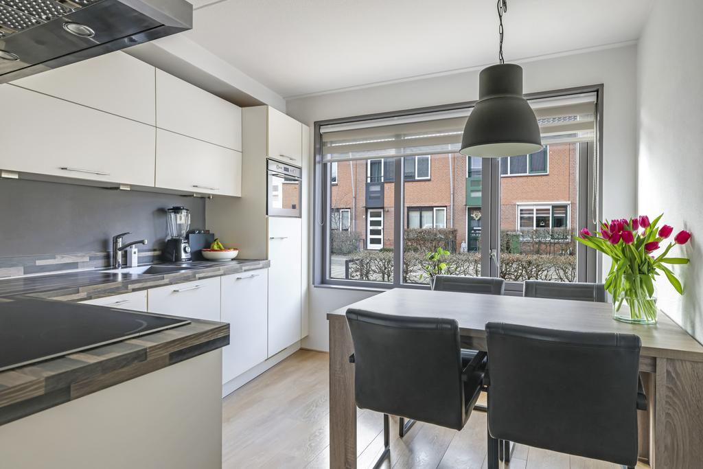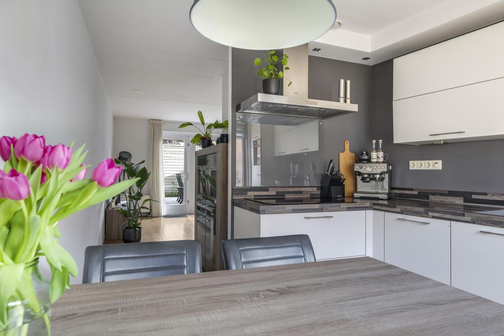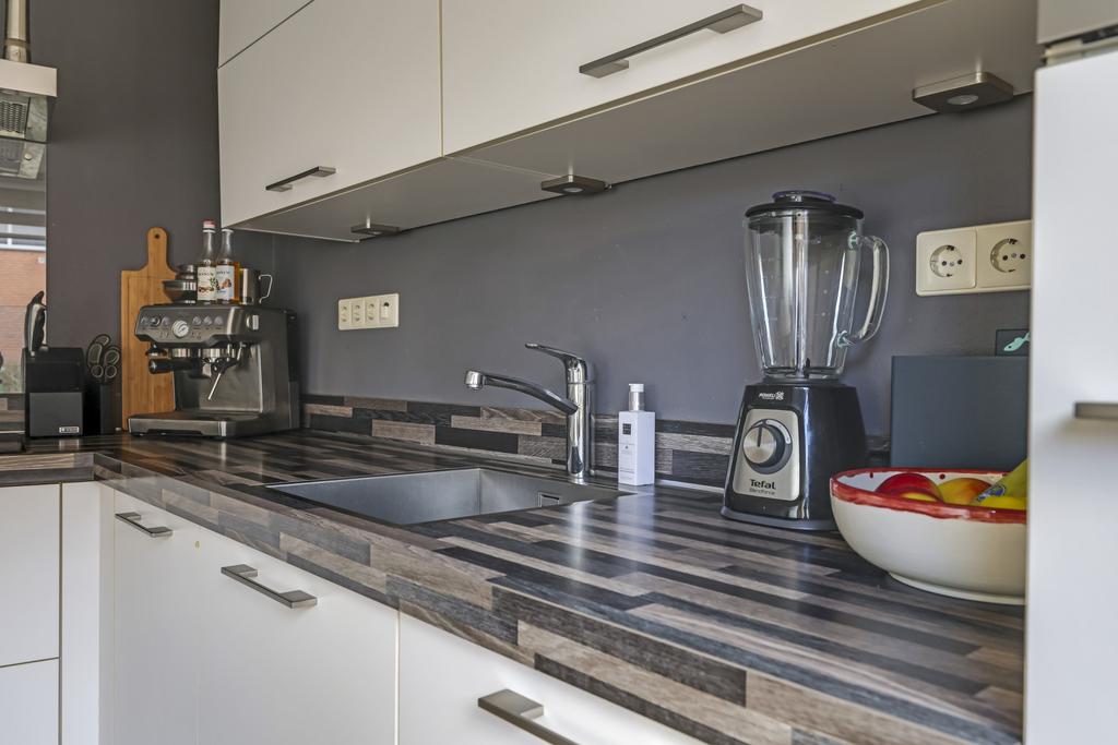 De keuken is aan de voorzijde van de woning gelegen en biedt tevens plaats voor een eettafel. Het keukenblok is voorzien van een prachtig aanrechtblad, boven- en onderkasten en diverse inbouwapparatuur. Daarbij moet je denken aan een vaatwasser, koelkast, combi-oven/magnetron, 4-pits inductie kookplaat en afzuigschouw. Voor extra verlichting zijn er spots in de bovenkastjes aangebracht die natuurlijk zorgen voor extra licht in de keuken, maar ook voor extra sfeer d.m.v. de dimmer.