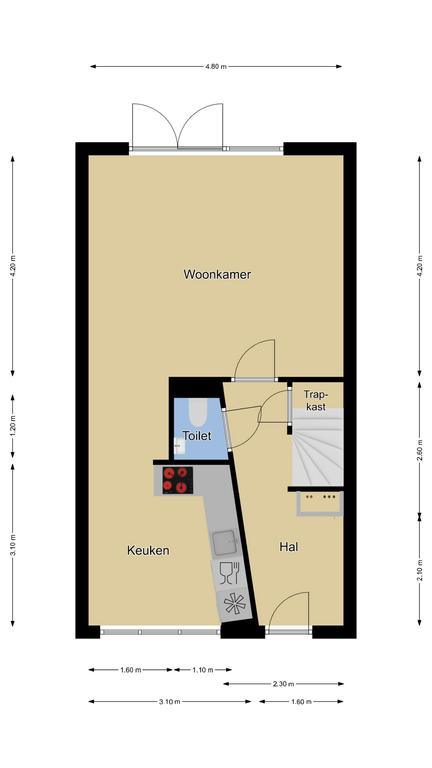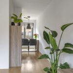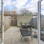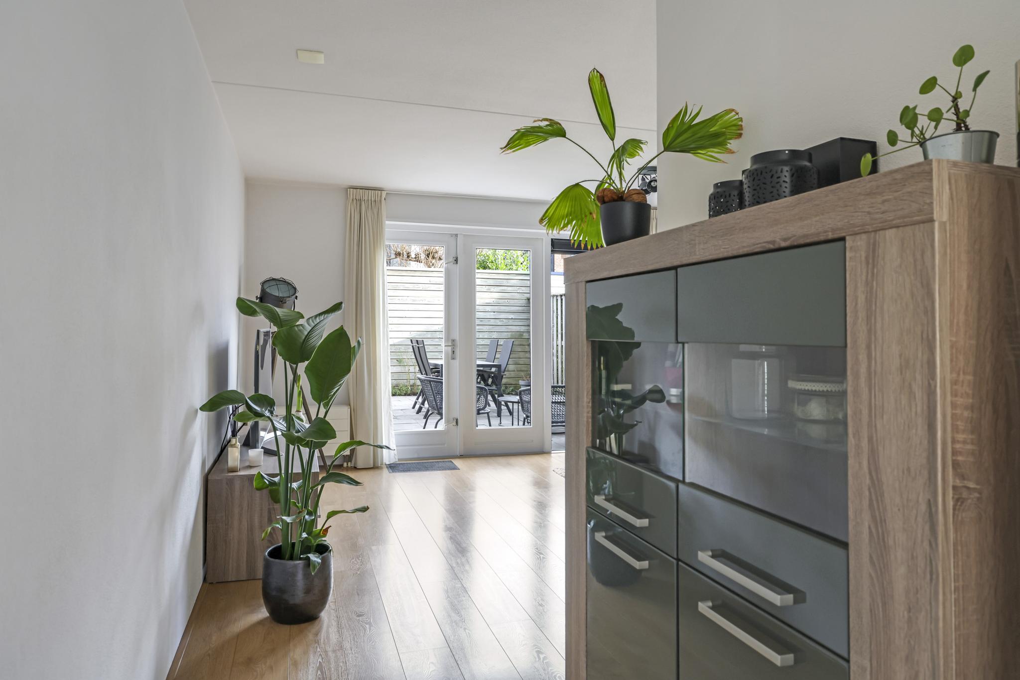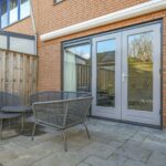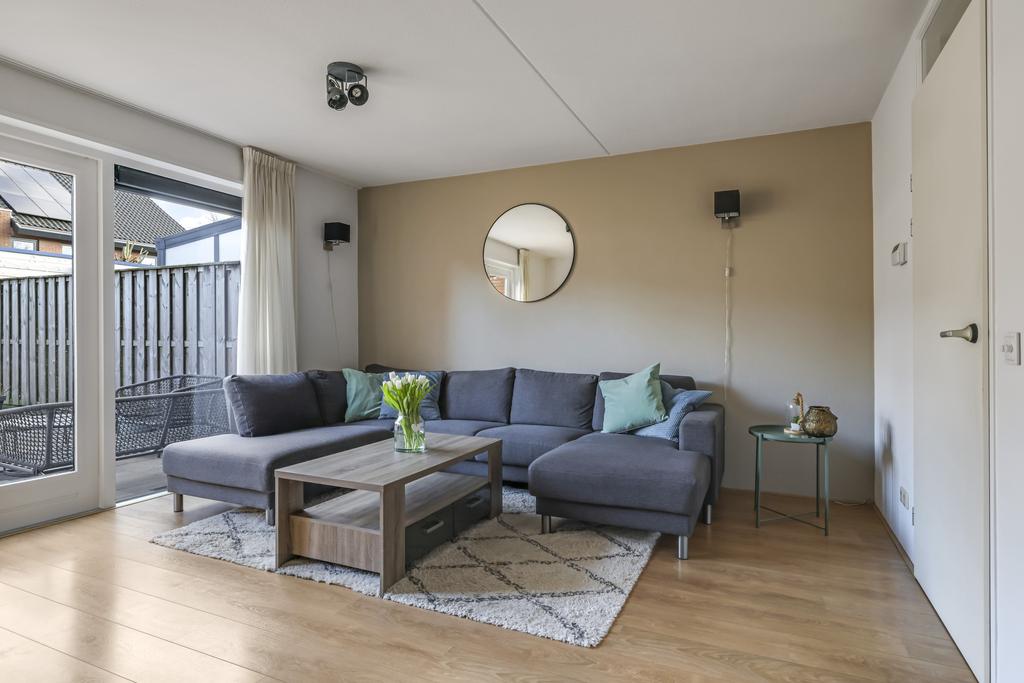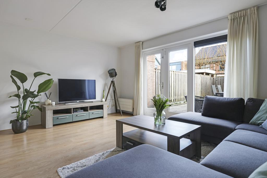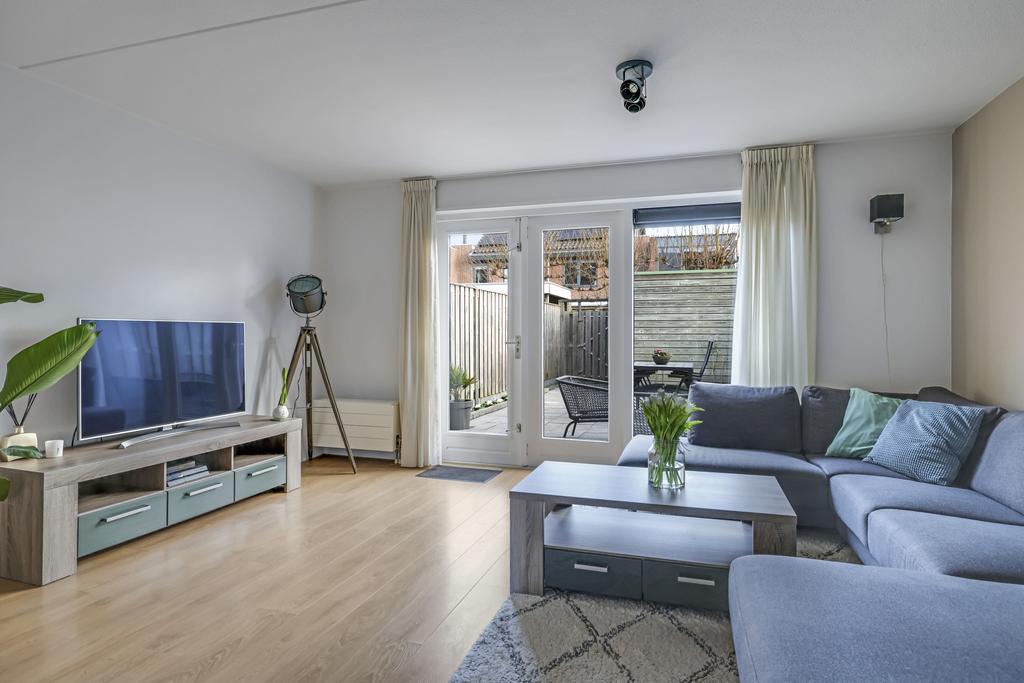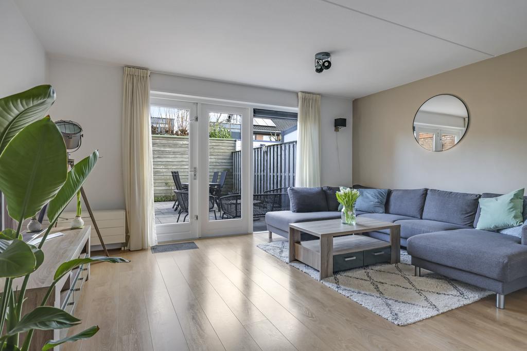 Woonkamer voorzien van openslaande tuindeuren en trapkast