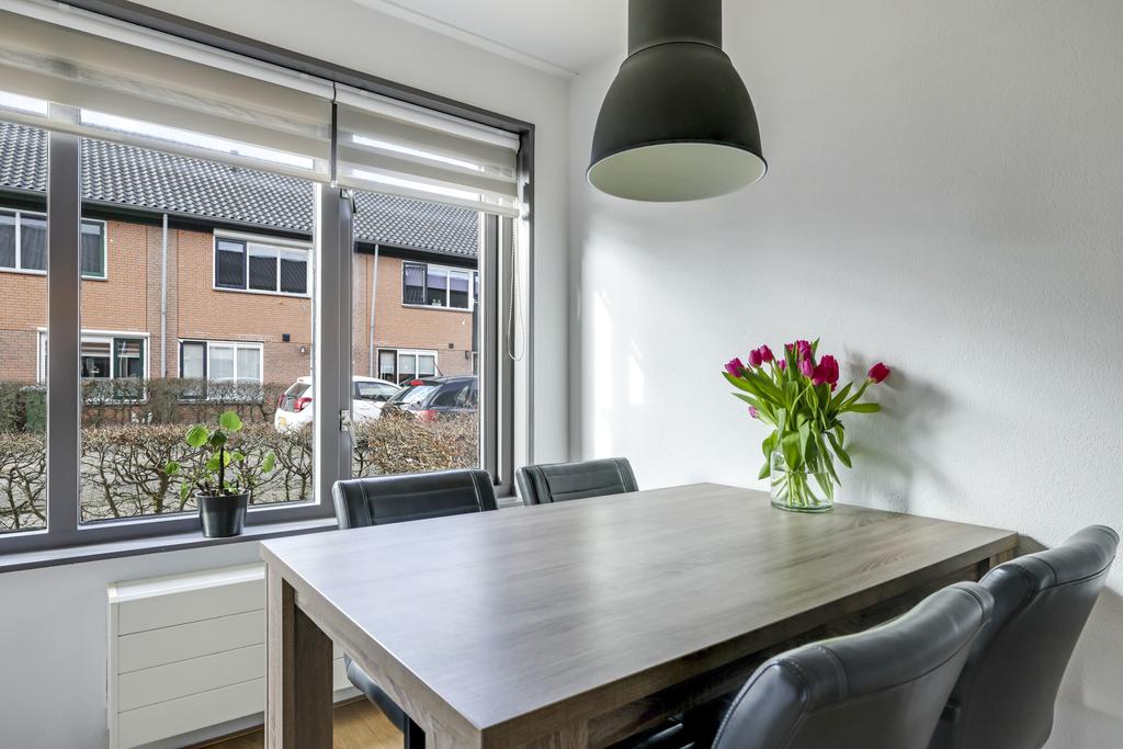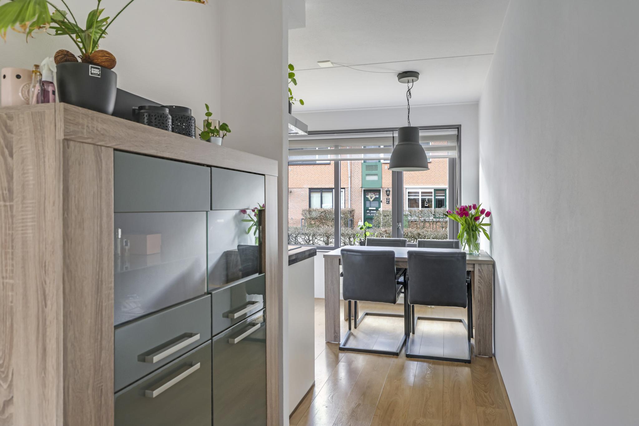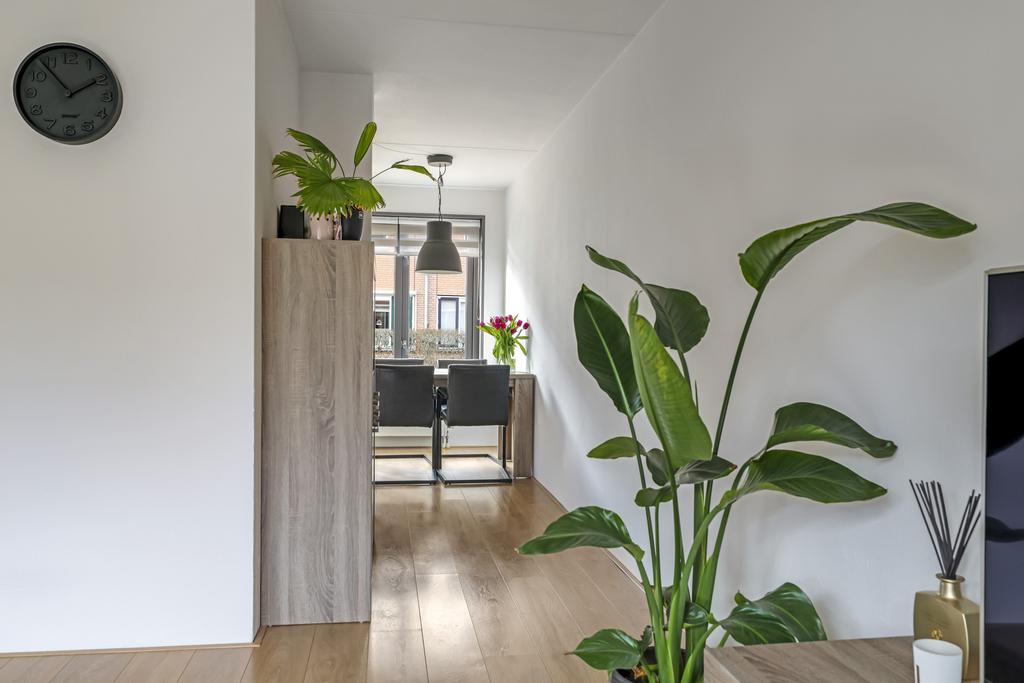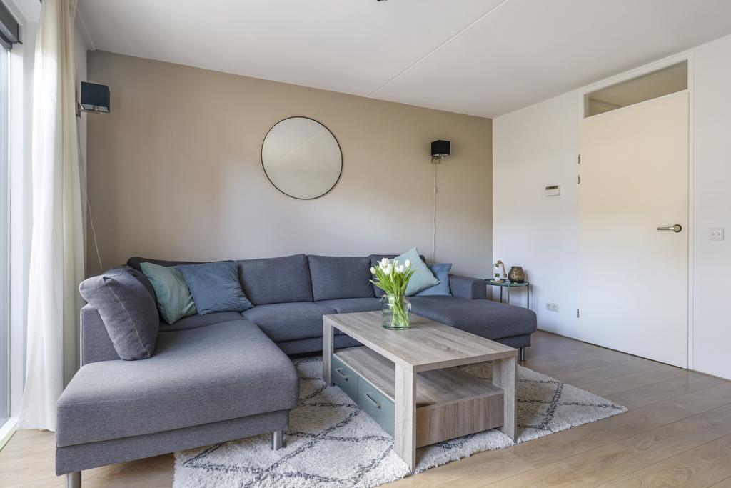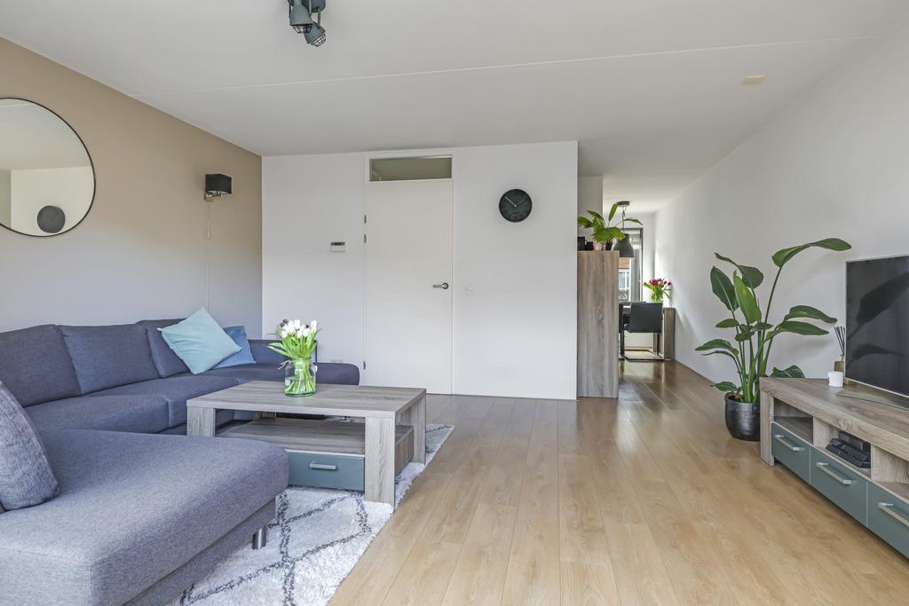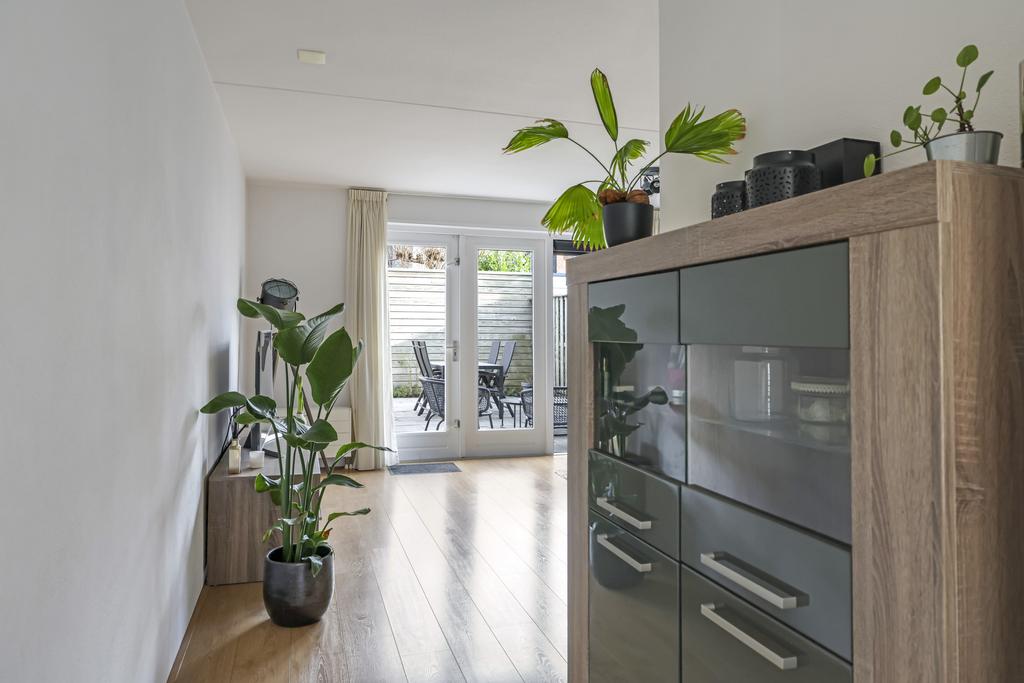 De woonkamer is aan de achterzijde en over de volle breedte van de woning gelegen. Openslaande tuindeuren geven het gemak om het buitenterras eenvoudig bij de leefruimte te betrekken. De grote glazen pui tot aan de vloer aan de achterzijde zorgt niet alleen voor veel daglicht, maar ook voor een ruimtelijk gevoel en een vrij gezichtsveld in de achtertuin. De lichtgekleurde wanden zorgen voor een ruimtelijk en fris effect. Dit samen met de lichte laminaatvloer, die over de gehele woonlaag is gelegd, maakt het geheel helemaal compleet. Aan opbergruimte geen gebrek door de aanwezige trapkast.