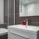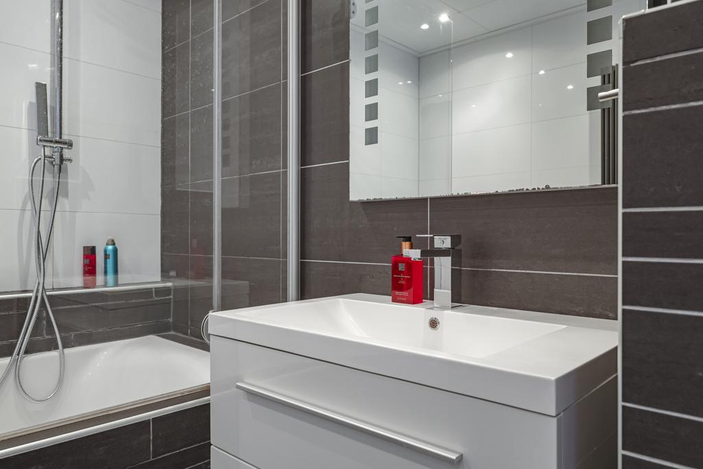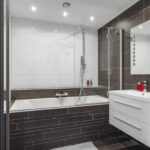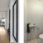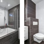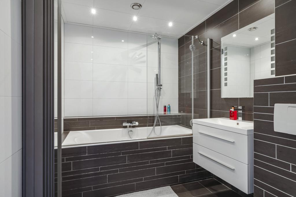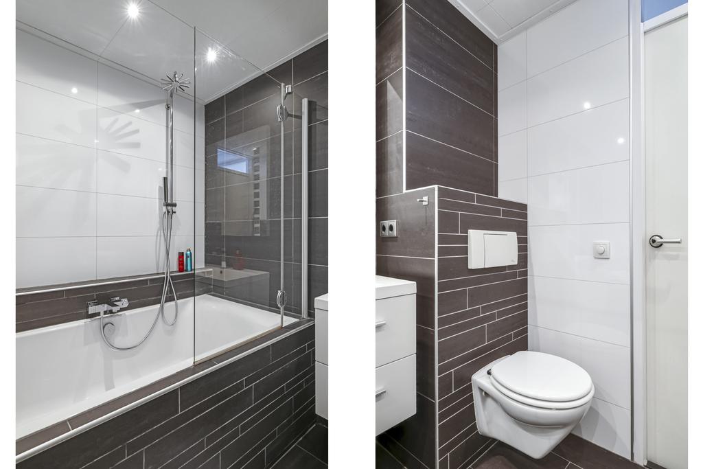 Tussen de slaapkamers in is de badkamer gelegen. Deze ruimte is afgewerkt met prachtig tegelwerk tot aan het plafond. De indeling bestaat uit een ligbad, 2e (zwevend) toilet, een modern wastafelmeubel met spiegel en mechanische ventilatie. Deze zorgt voor een prima ventilatiemogelijkheid, zeker omdat de badkamer in het midden van de woning gesitueerd is.