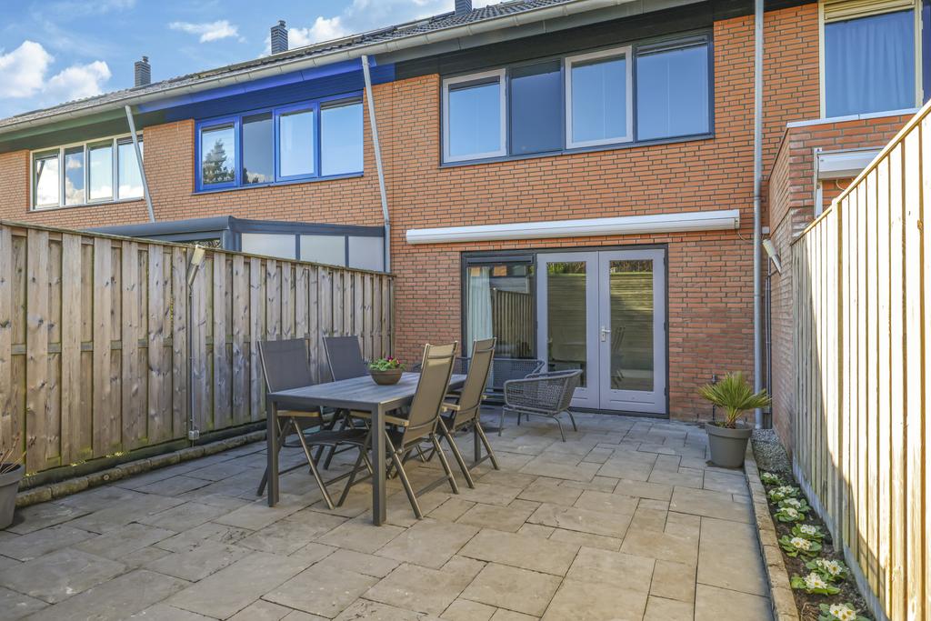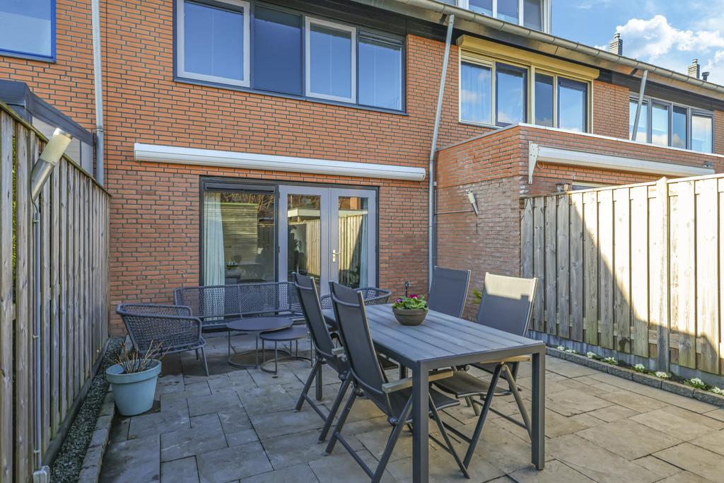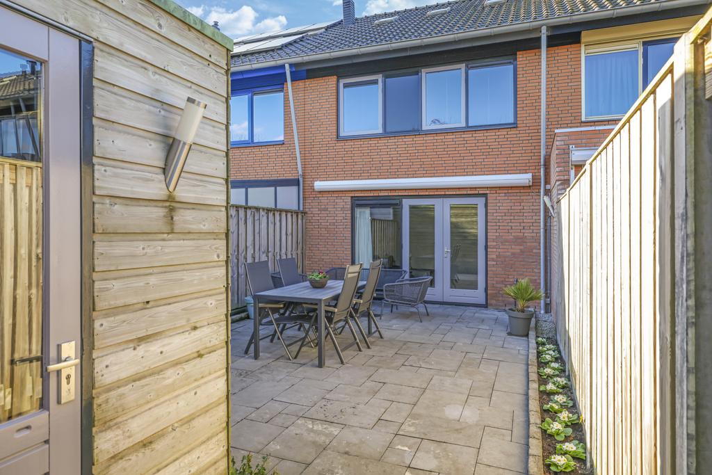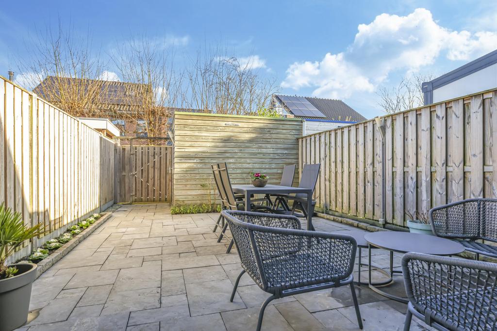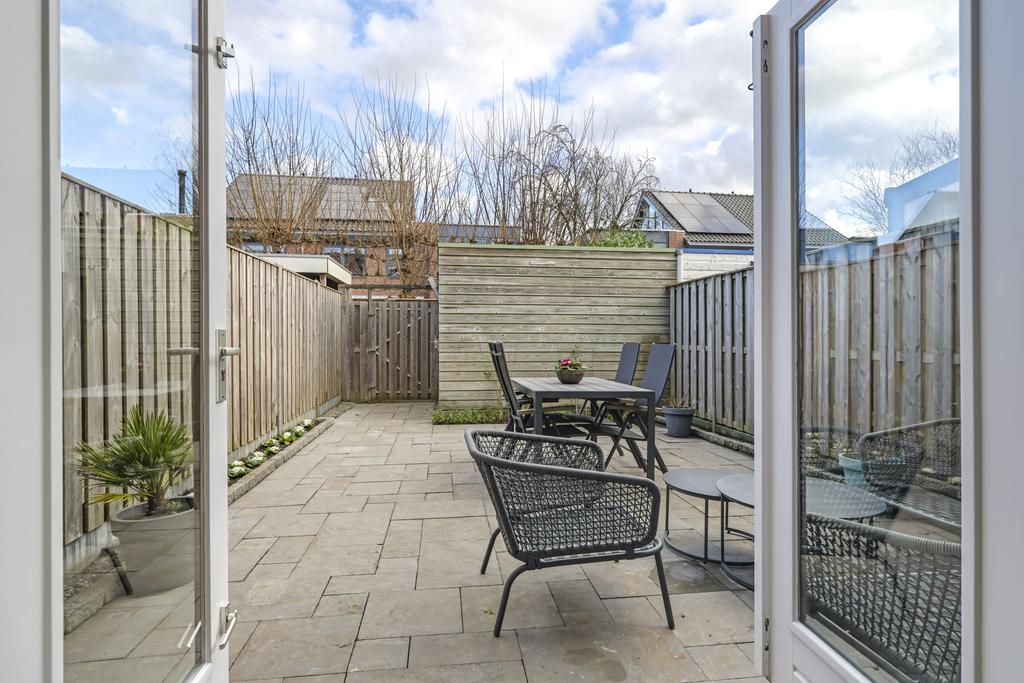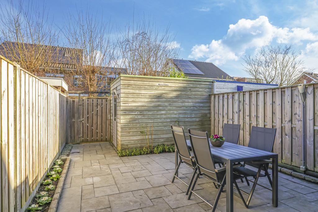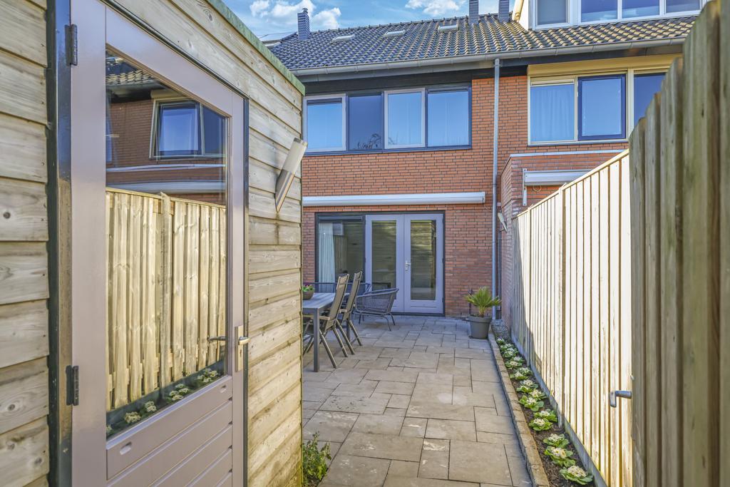 Via de openslaande deuren in de woonkamer is de achtertuin te bereiken. Deze is onderhoudsvriendelijk ingericht maar met wat plantenbakken toch heel fleurig gemaakt. Omdat de tuin op het oosten is gelegen, geniet je elke ochtend van de prachtige zonsopkomst en schijnt deze tot in de late middaguren door. Achter in de tuin is een houten berging geplaatst voor de fietsen. Via de poort loop je daarna zo het achterpad op.