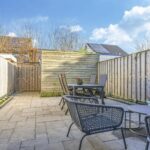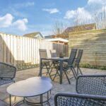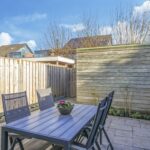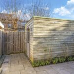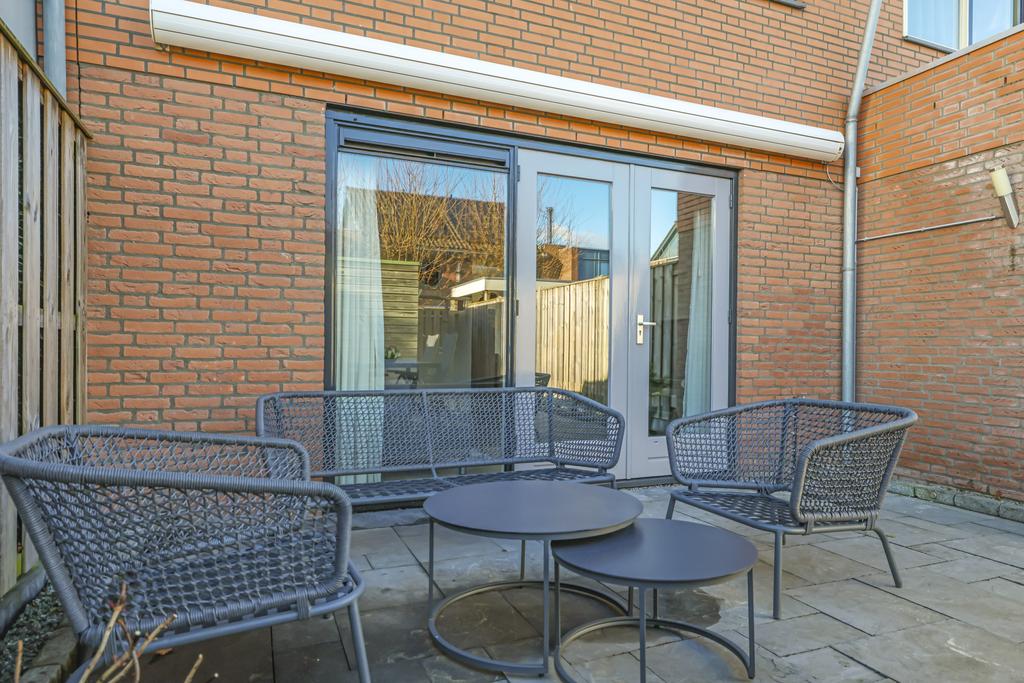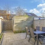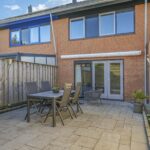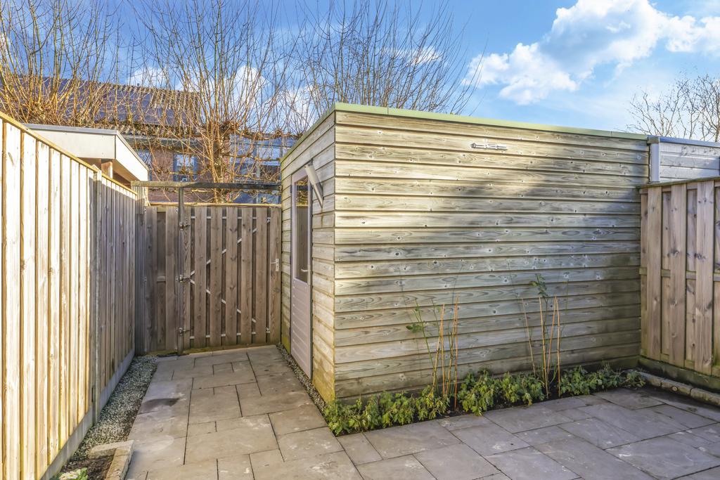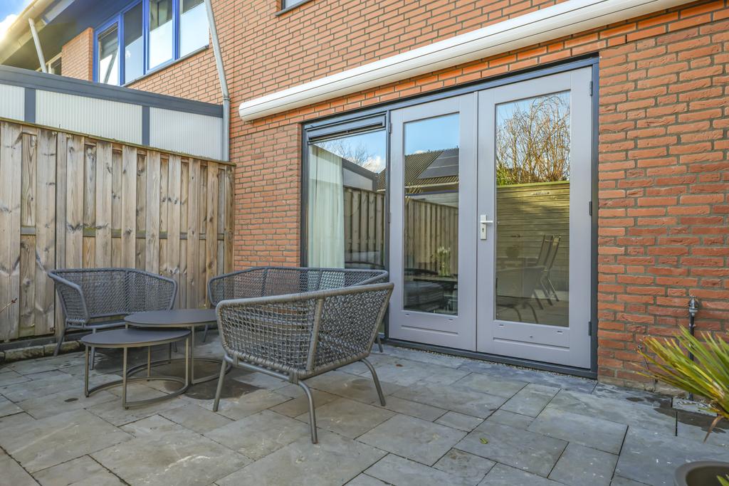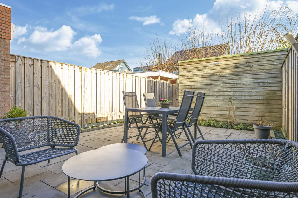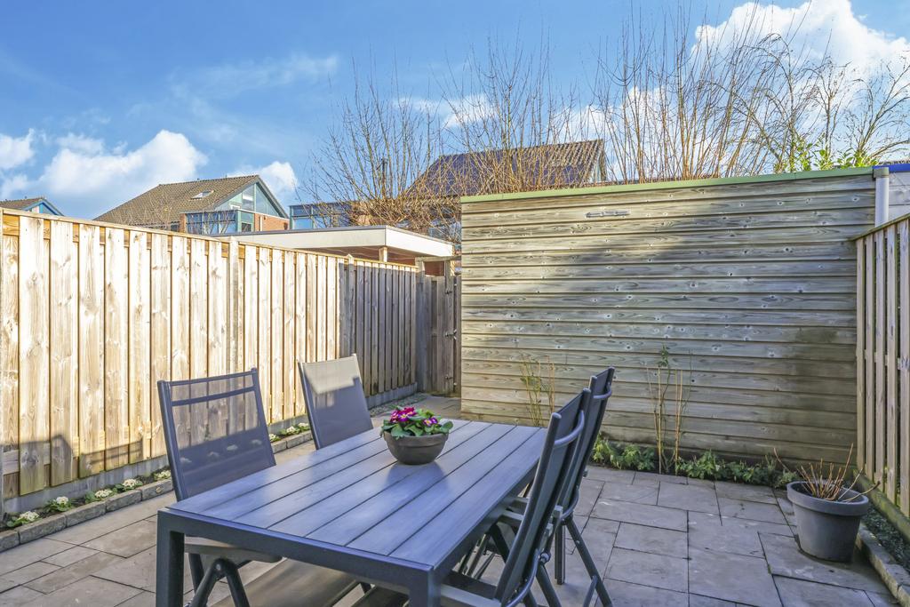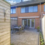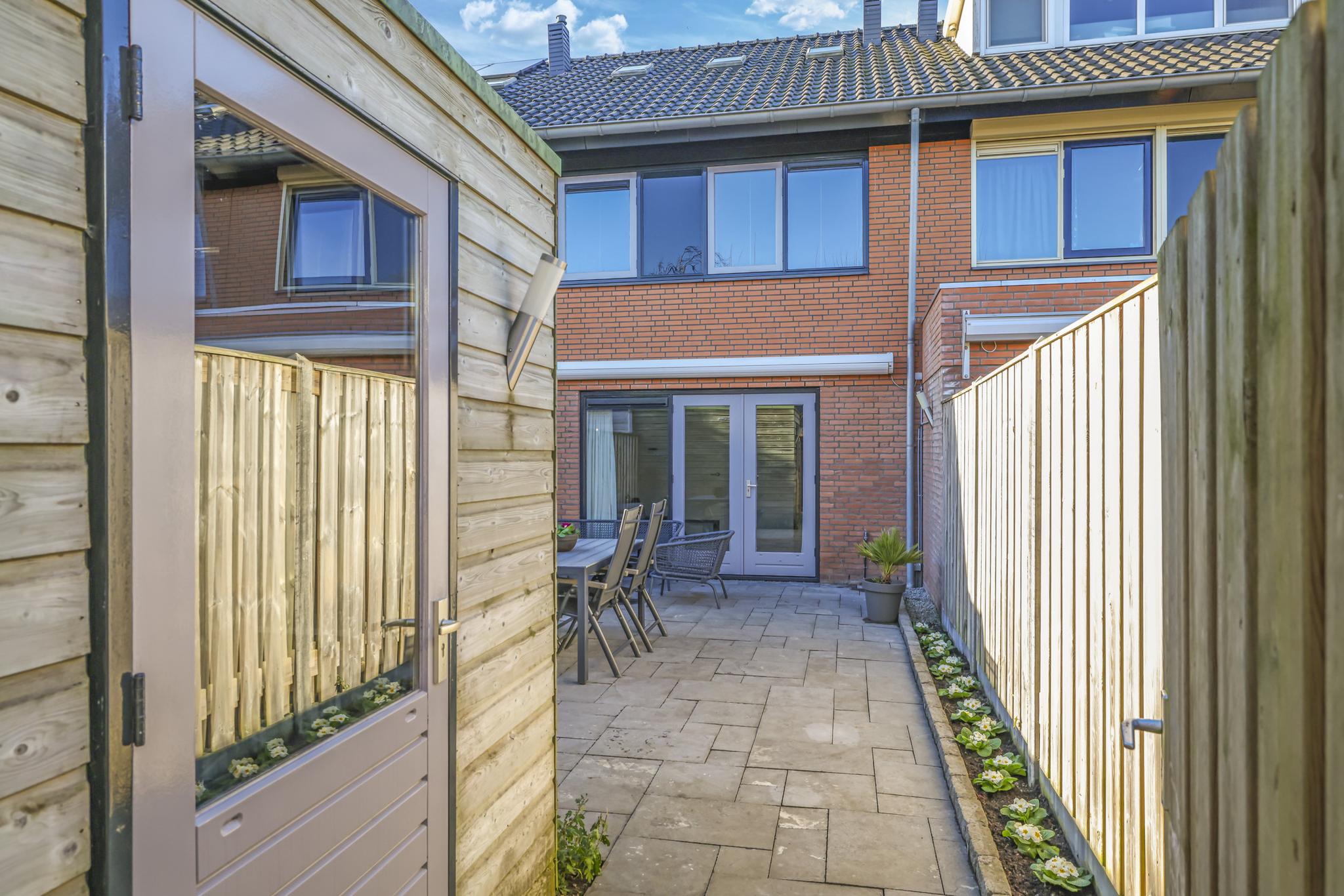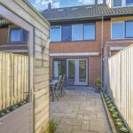 Via de openslaande deuren in de woonkamer is de achtertuin te bereiken. Deze is onderhoudsvriendelijk ingericht maar met wat plantenbakken toch heel fleurig gemaakt. Omdat de tuin op het oosten is gelegen, geniet je elke ochtend van de prachtige zonsopkomst en schijnt deze tot in de late middaguren door. Achter in de tuin is een houten berging geplaatst voor de fietsen. Via de poort loop je daarna zo het achterpad op.