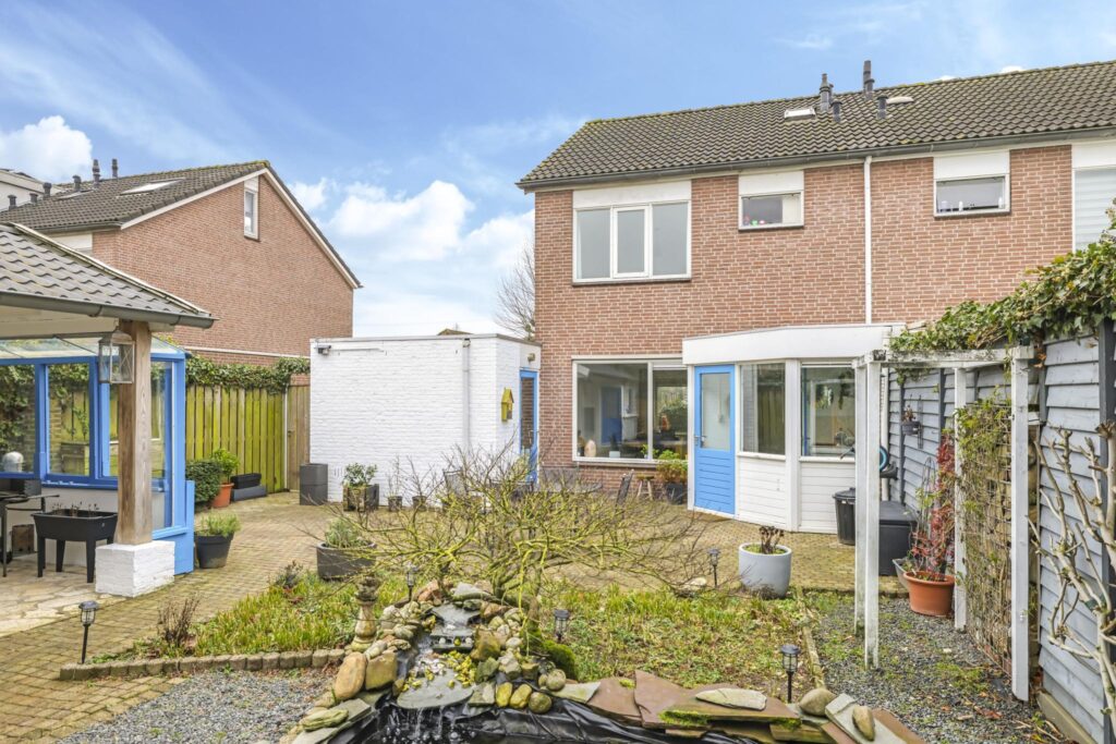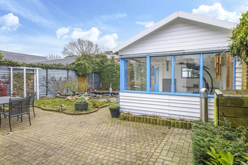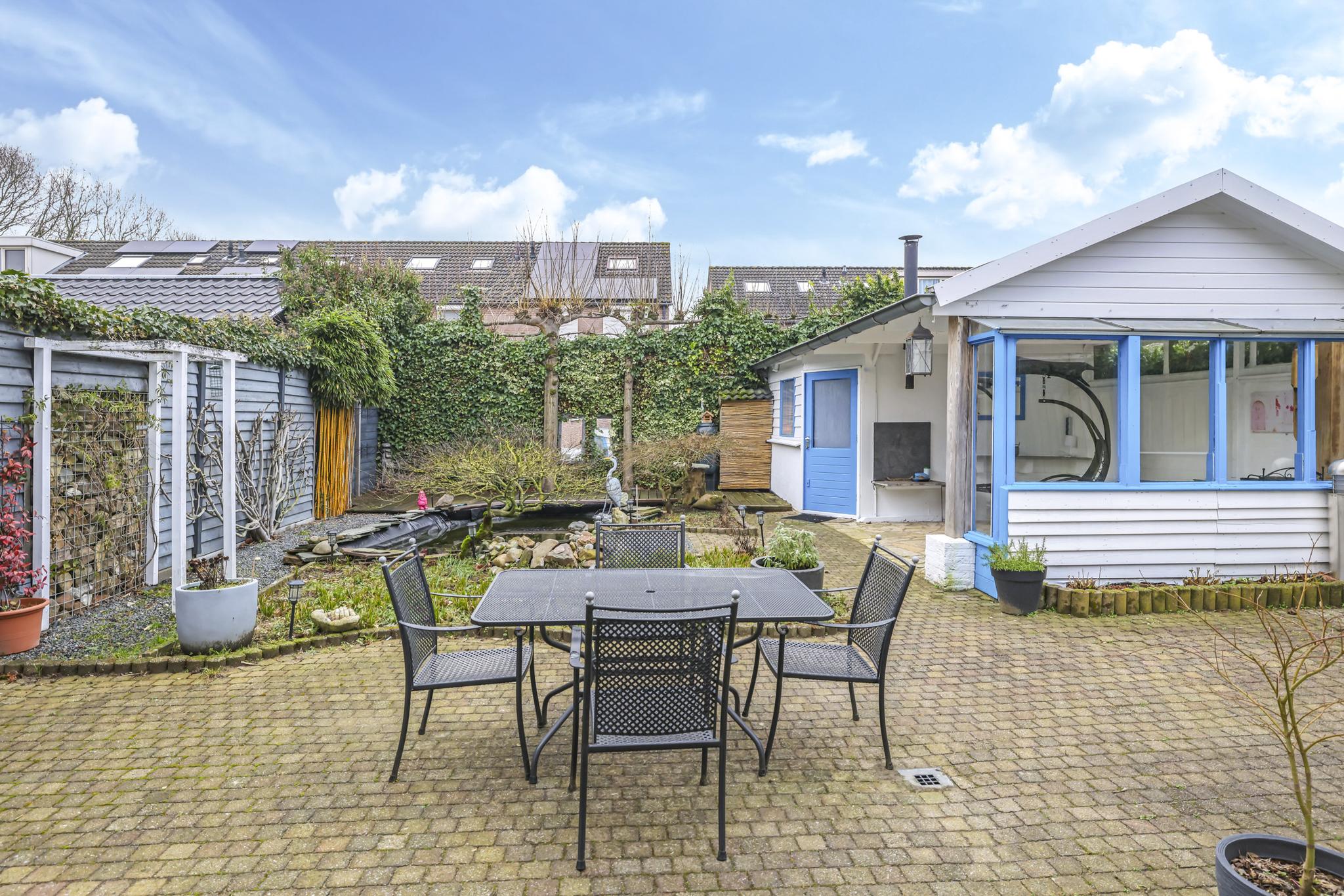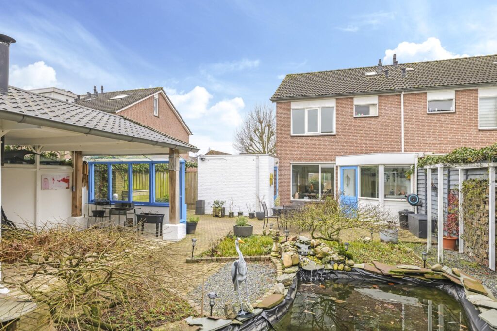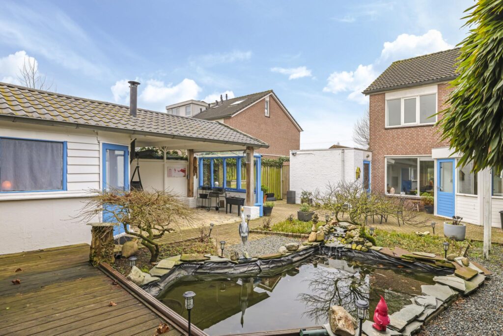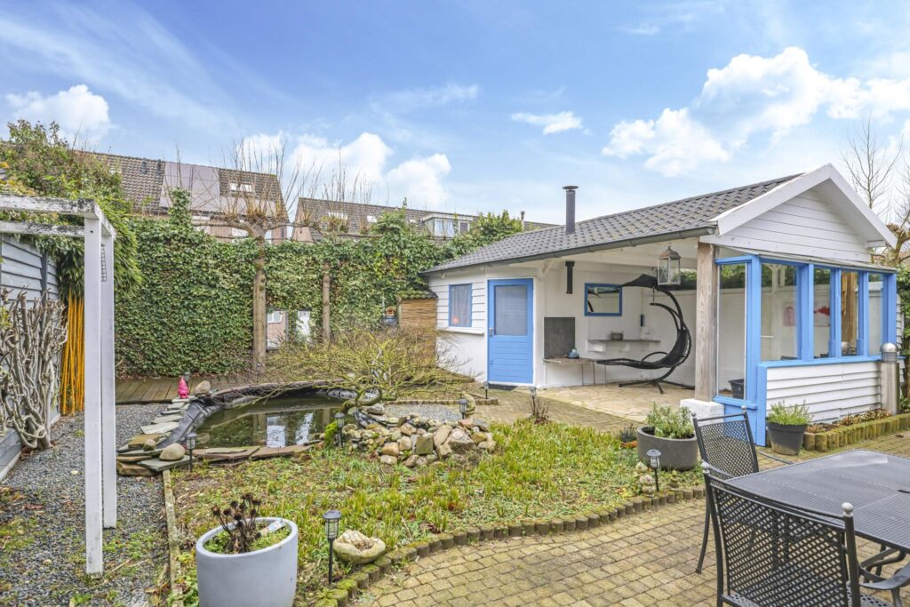 Bij deze woning hoort een heerlijke achtertuin. De tuin heeft een goed formaat, mede door de mooie breedte van het perceel. Geen wonder dat er hier meerdere terrassen zijn gecreëerd. Een groot terras direct aan de woning en een stijlvol vlonder terras achter in de tuin. Tussen de terrassen in is een vijver geplaatst met diverse planten en struiken. Achter in de hoek staat een ruime schuur welke met ca. 12m² grootte een stuk ruimer is dan gemiddeld. Naast het plaatsen van fietsen heb je hier veel ruimte om bijvoorbeeld te klussen. In de nok is nog extra opbergruimte aanwezig. Aan de schuur is een stijlvolle veranda geplaatst waar je heerlijk beschut kunt zitten. Wanneer het buiten afkoelt zit je hier nog heerlijk bij de houtkachel.