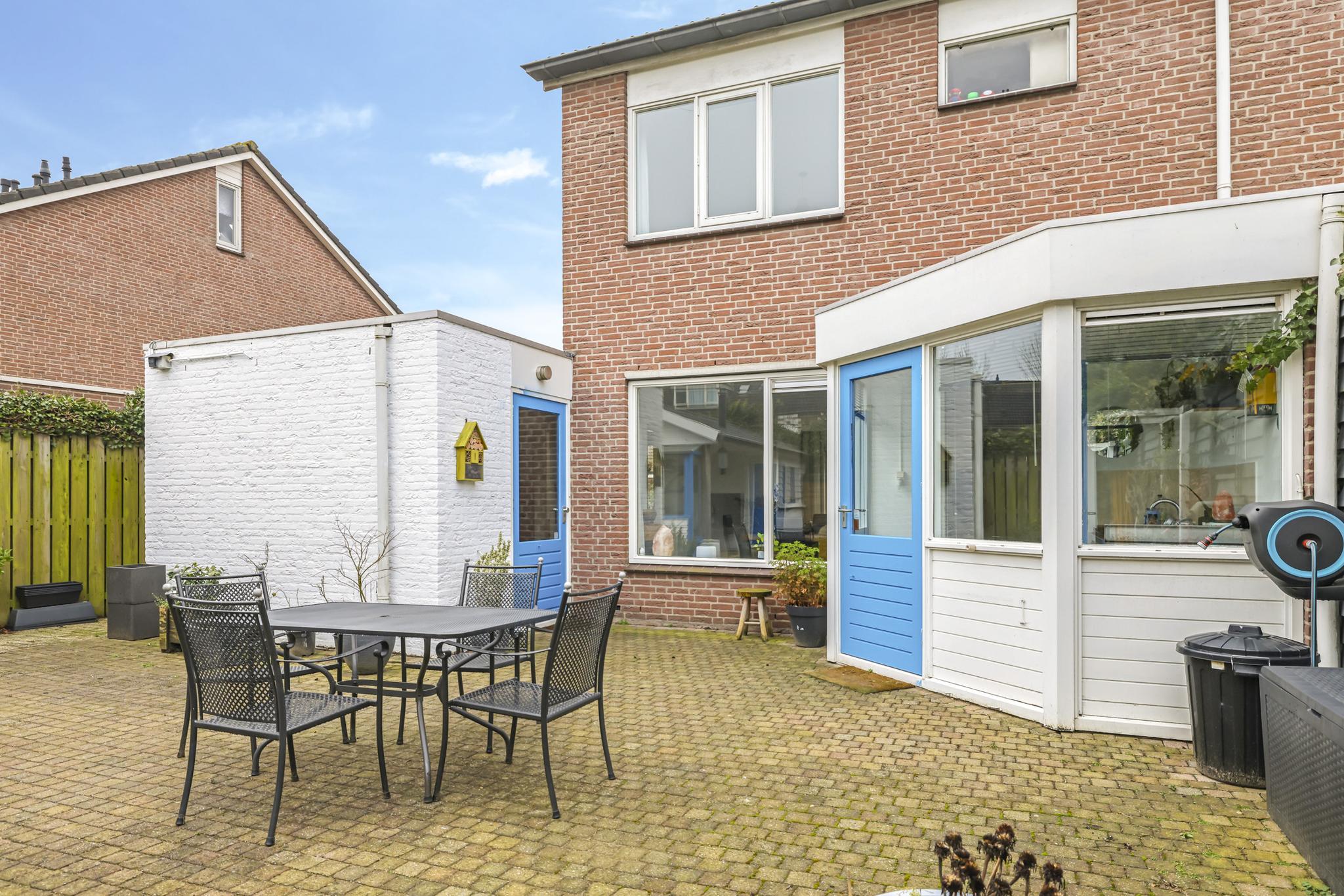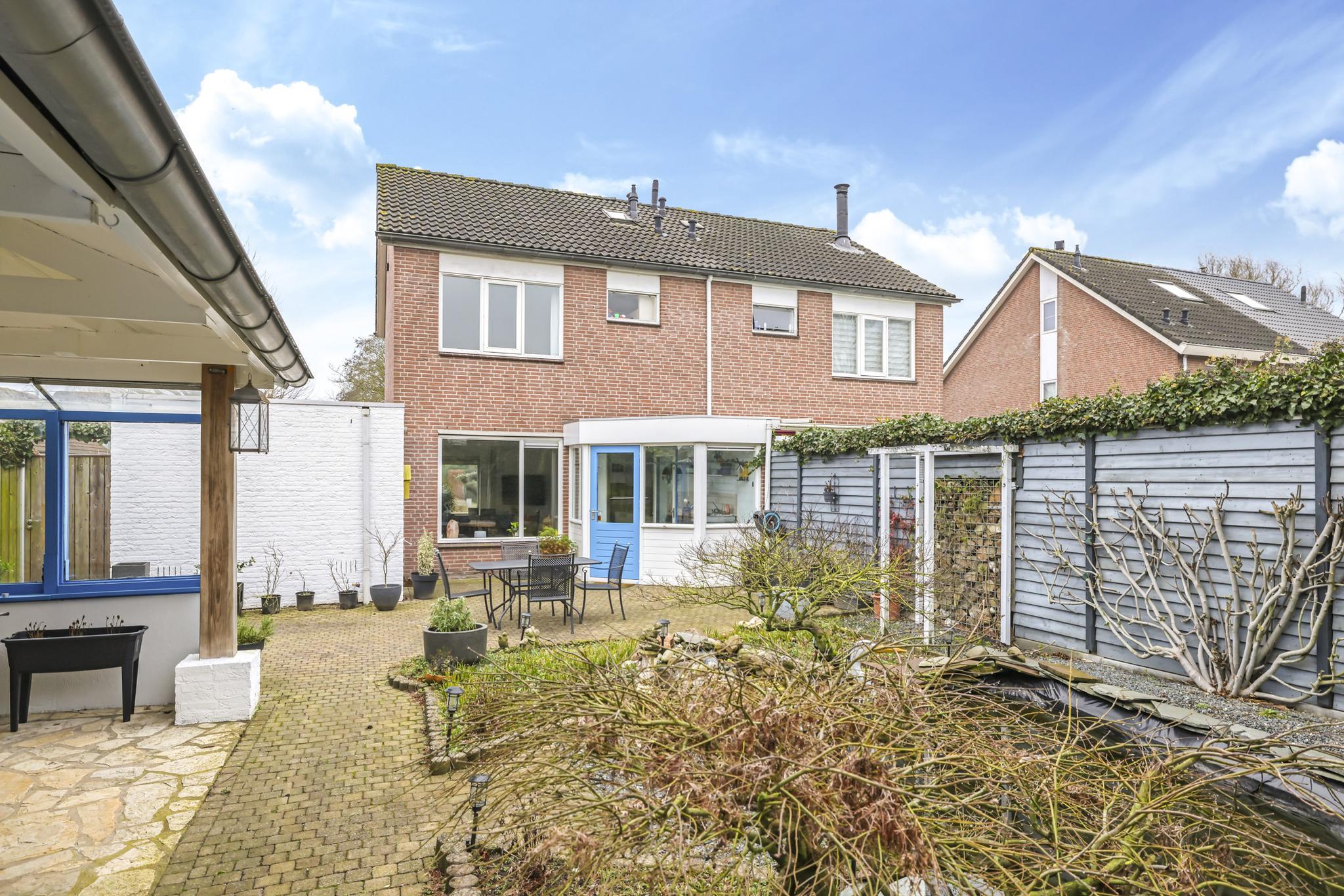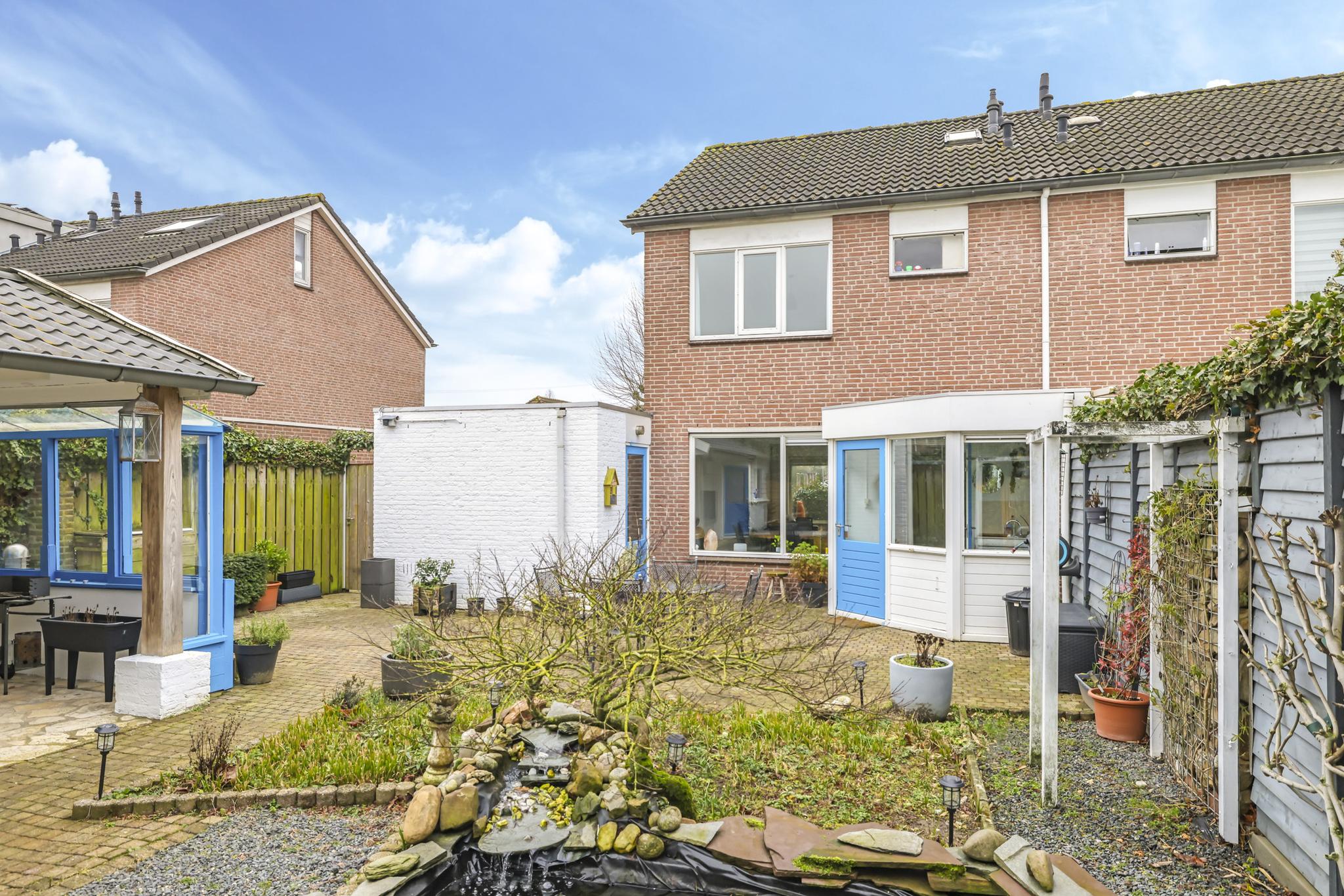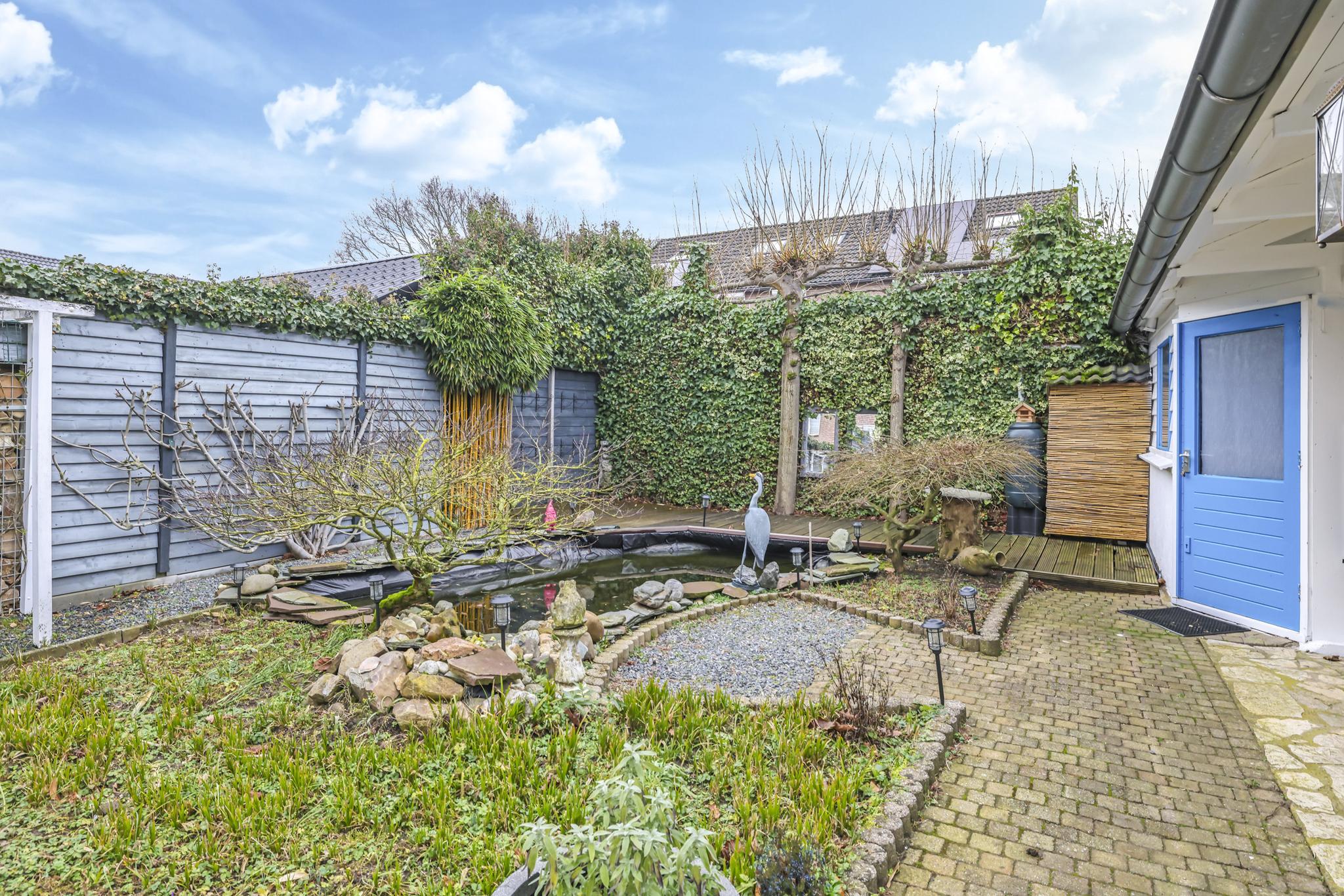 Bij deze woning hoort een heerlijke achtertuin. De tuin heeft een goed formaat, mede door de mooie breedte van het perceel. Geen wonder dat er hier meerdere terrassen zijn gecreëerd. Een groot terras direct aan de woning en een stijlvol vlonder terras achter in de tuin. Tussen de terrassen in is een vijver geplaatst met diverse planten en struiken. Achter in de hoek staat een ruime schuur welke met ca. 12m² grootte een stuk ruimer is dan gemiddeld. Naast het plaatsen van fietsen heb je hier veel ruimte om bijvoorbeeld te klussen. In de nok is nog extra opbergruimte aanwezig. Aan de schuur is een stijlvolle veranda geplaatst waar je heerlijk beschut kunt zitten. Wanneer het buiten afkoelt zit je hier nog heerlijk bij de houtkachel.