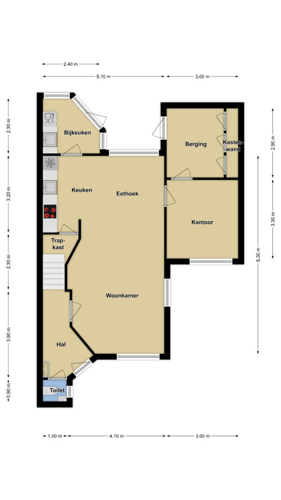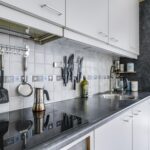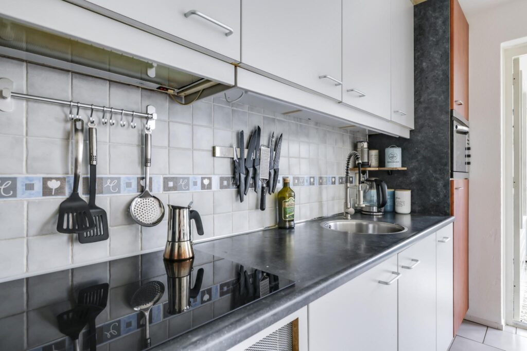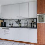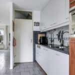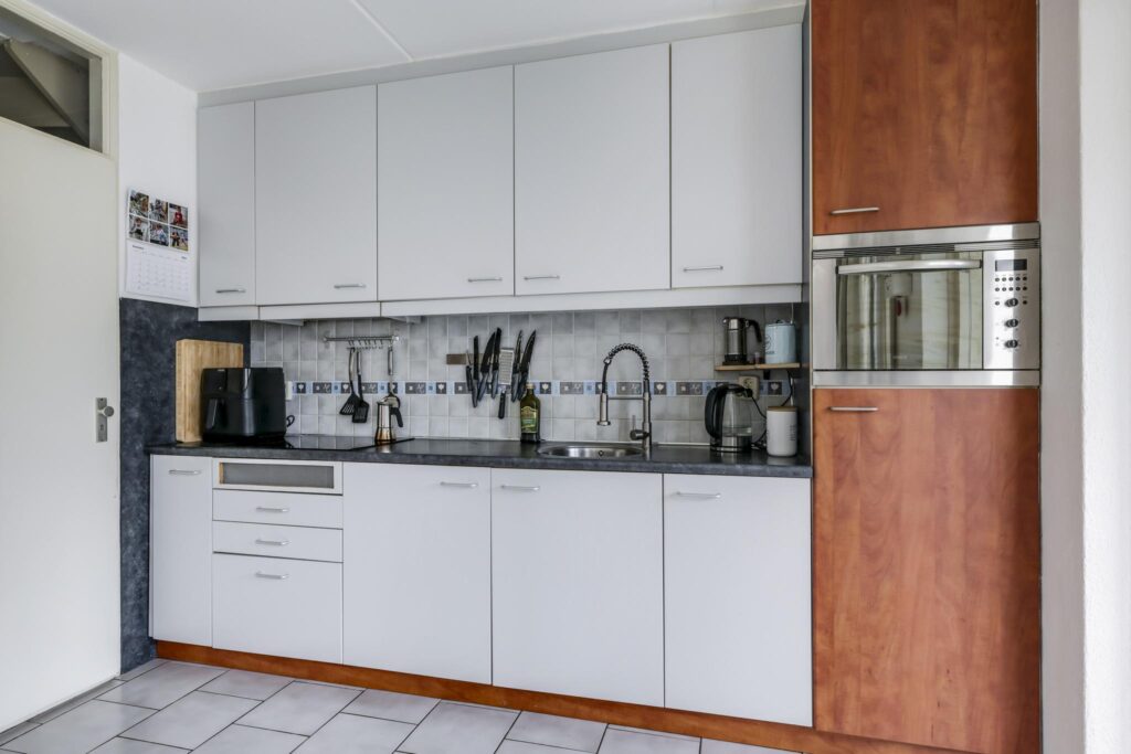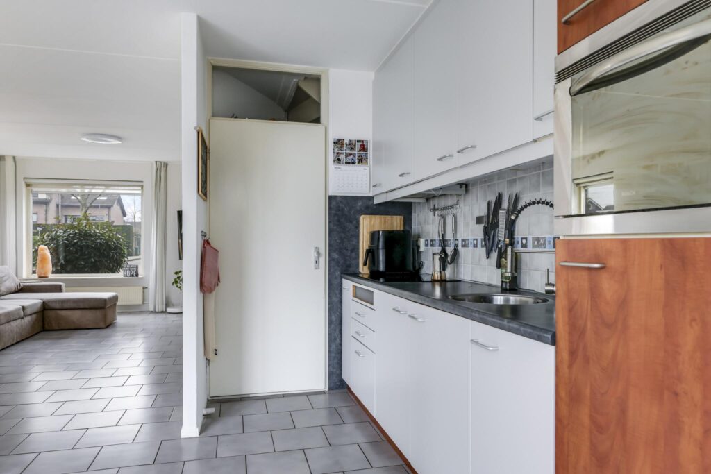 De open keuken staat direct in verbinding met de woonkamer. Er is hier gekozen voor een recht keukenblok met bovenkasten tot aan het plafond, waardoor er veel kastruimte aanwezig is. De inbouwapparatuur bestaat uit een inductie kookplaat, een koelkast en een combi-oven/magnetron. Door de close-in-boiler heb je direct warm water. Vanuit de keuken is de trapkast bereikbaar.