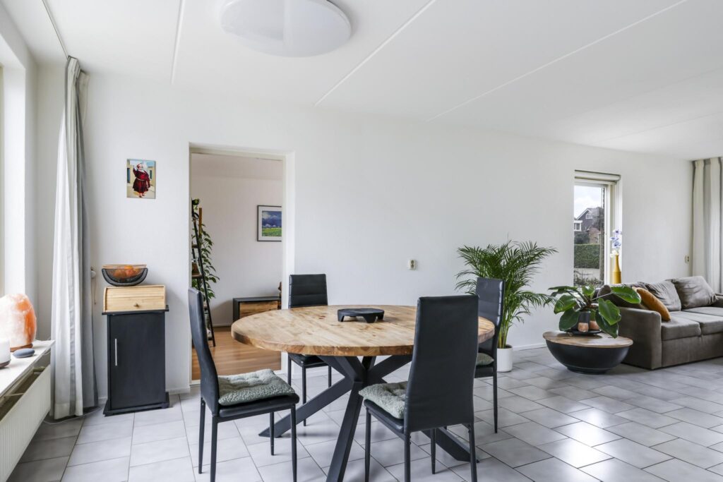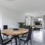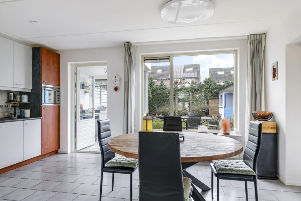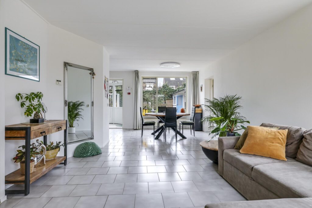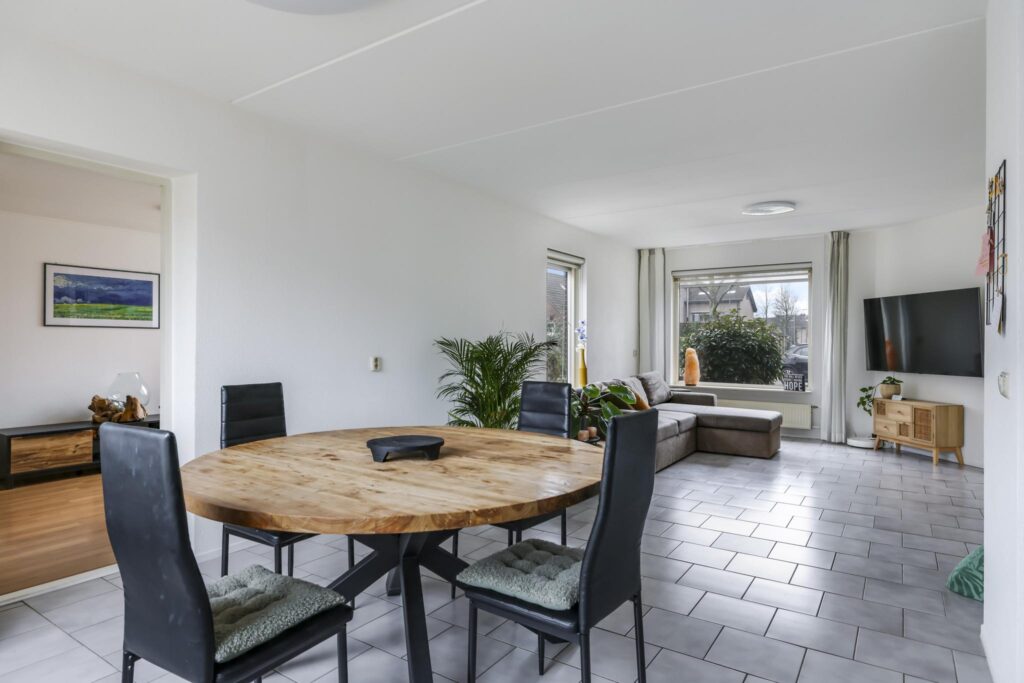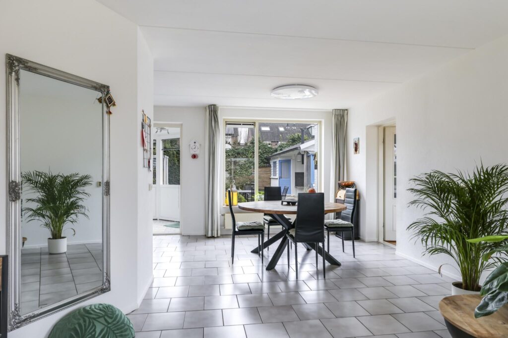 Deze woning heeft een klassieke doorzon-woonkamer met grote raampartijen waaronder in de zijgevel. Hierdoor is het altijd licht in de woonkamer wat voor een prettige woonsfeer zorgt. De kamer is goed in te richten met een grote hoekbank en een 6-persoons eettafel. Op de vloer liggen plavuizen welke aangenaam aanvoelen door de aanwezige vloerverwarming.