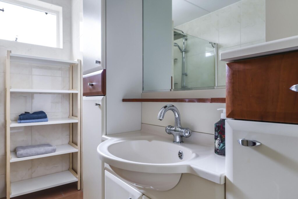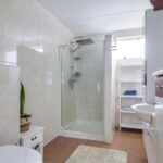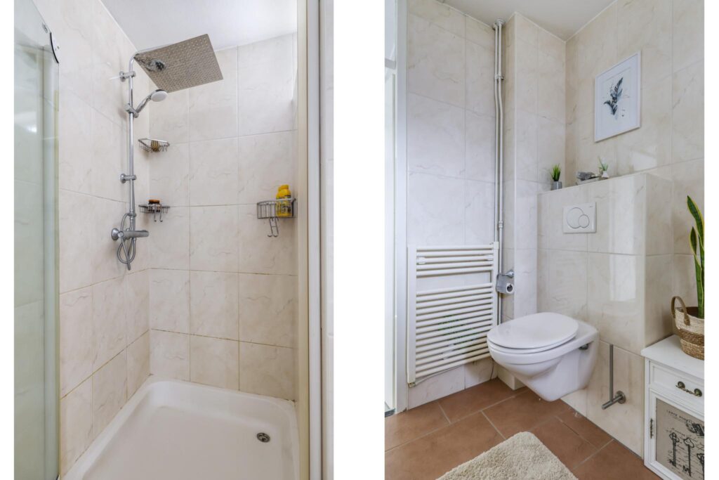 Badkamer met douchecel, een wastafelmeubel met extra kastruimte en een 2e toilet