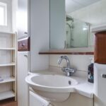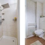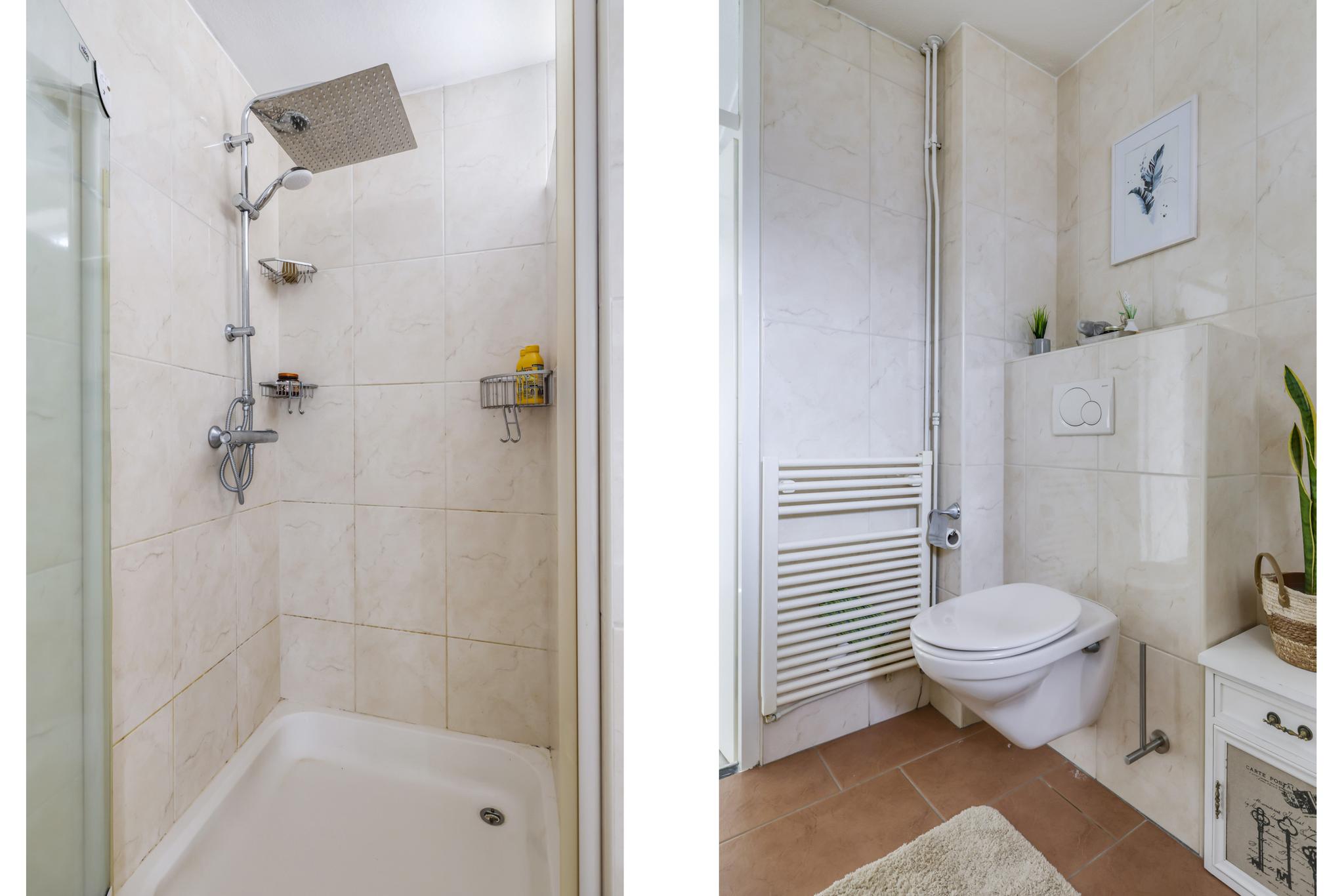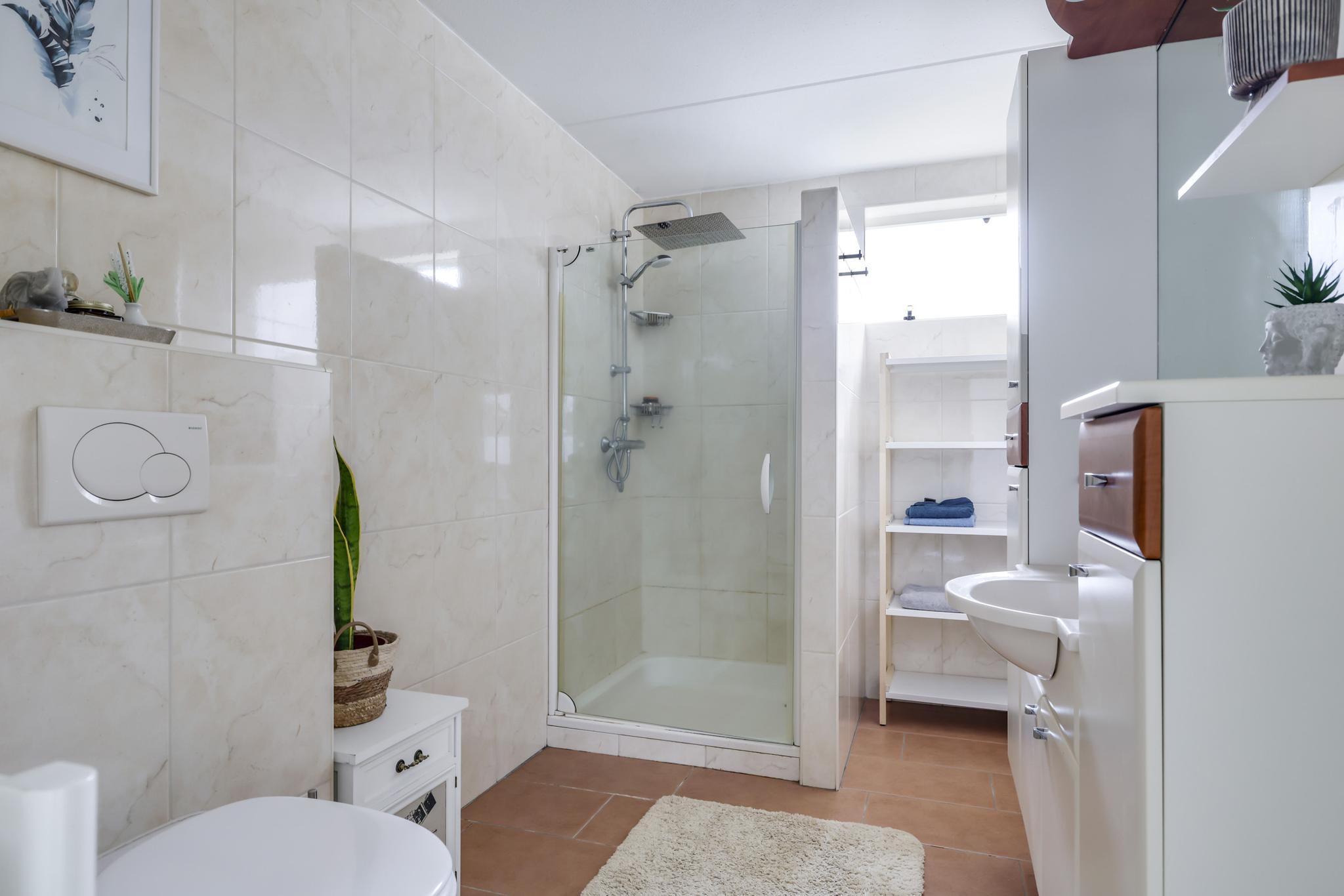 De badkamer is ruim opgezet waarbij al het wenselijke sanitair aanwezig is, maar er nog voldoende bewegingsruimte overblijft. De ruimte is geheel betegeld en ingericht met een douchecel, een wastafelmeubel en een 2e toilet (zwevend). Het wastafelmeubel is voorzien van veel extra opbergruimte. Uiteraard ontbreekt ook de handdoekradiator niet. Een hooggeplaatst raam biedt hier een ventilatiemogelijkheid, tevens is er ook mechanische afzuiging aanwezig.