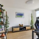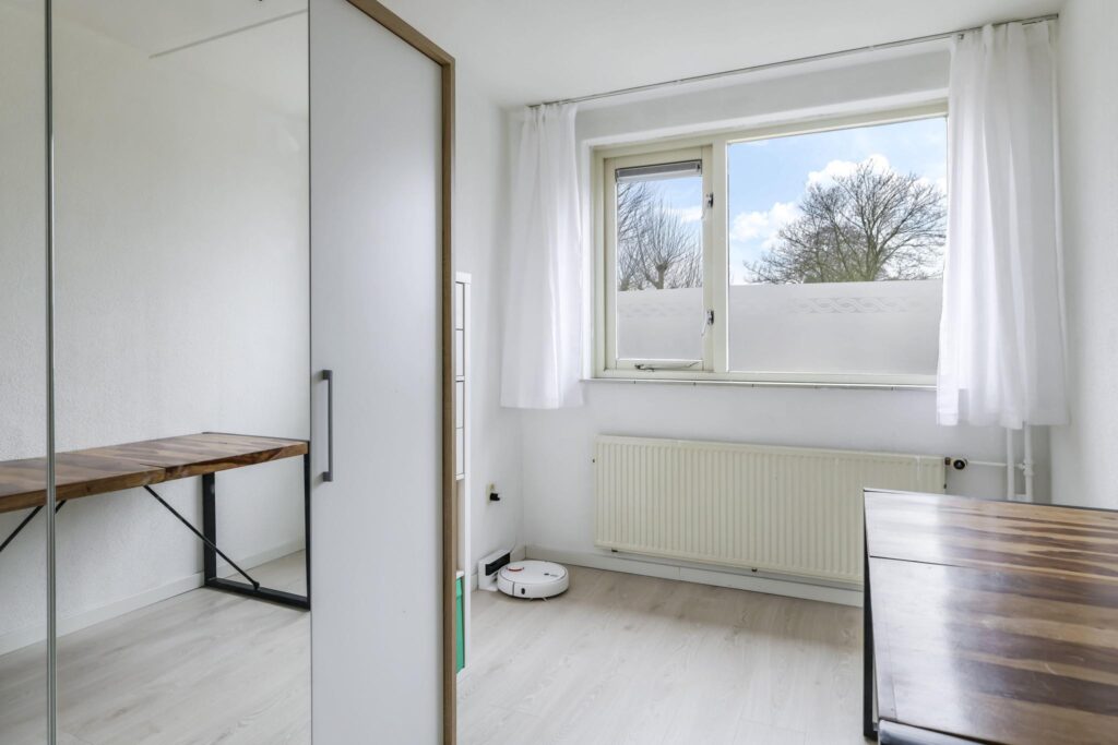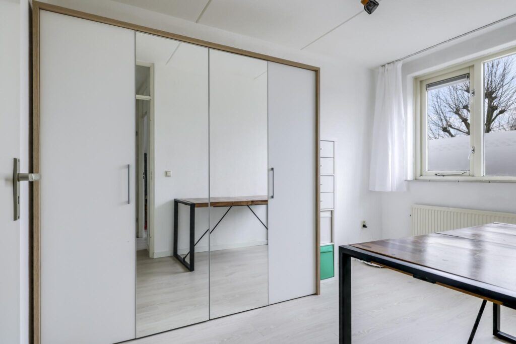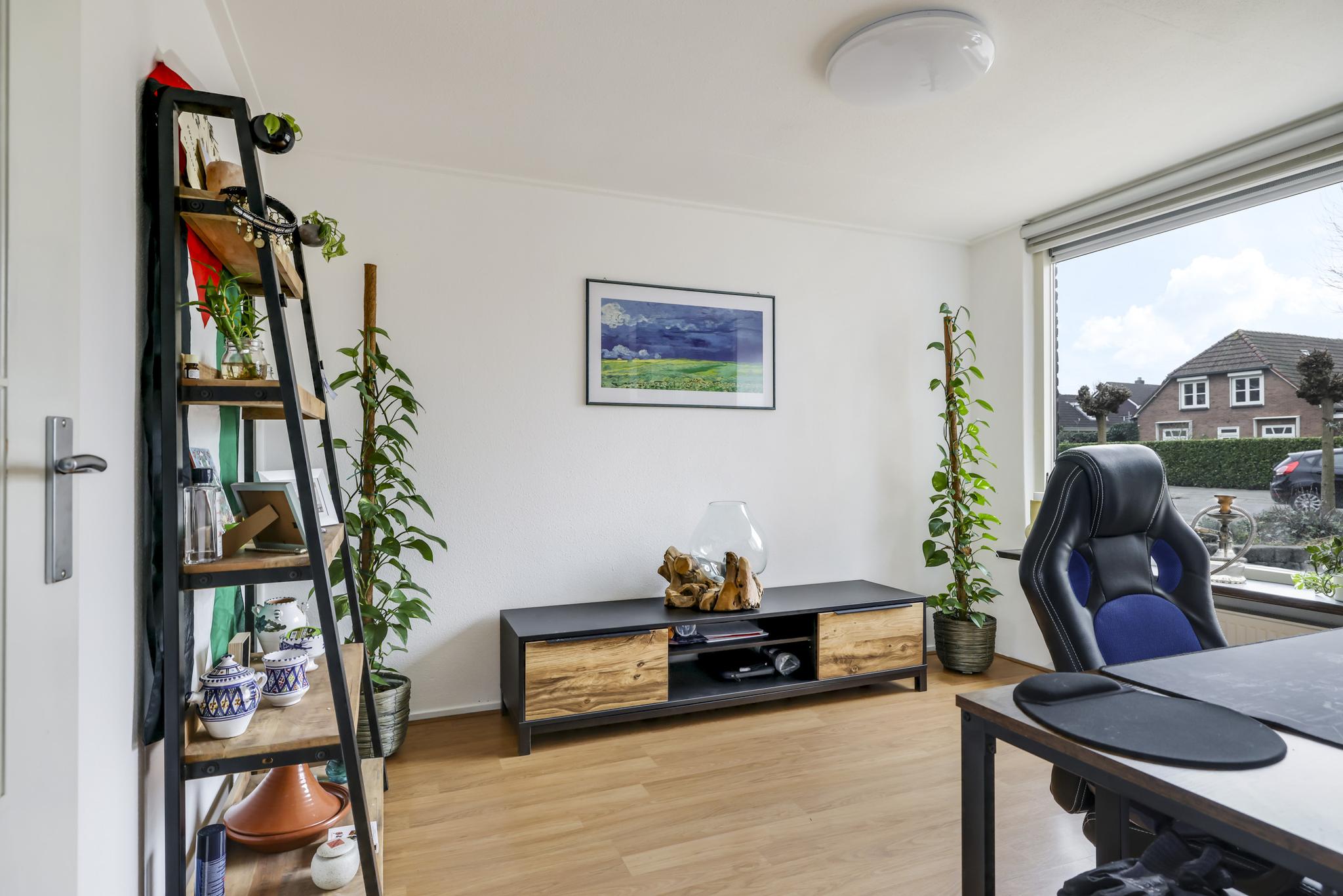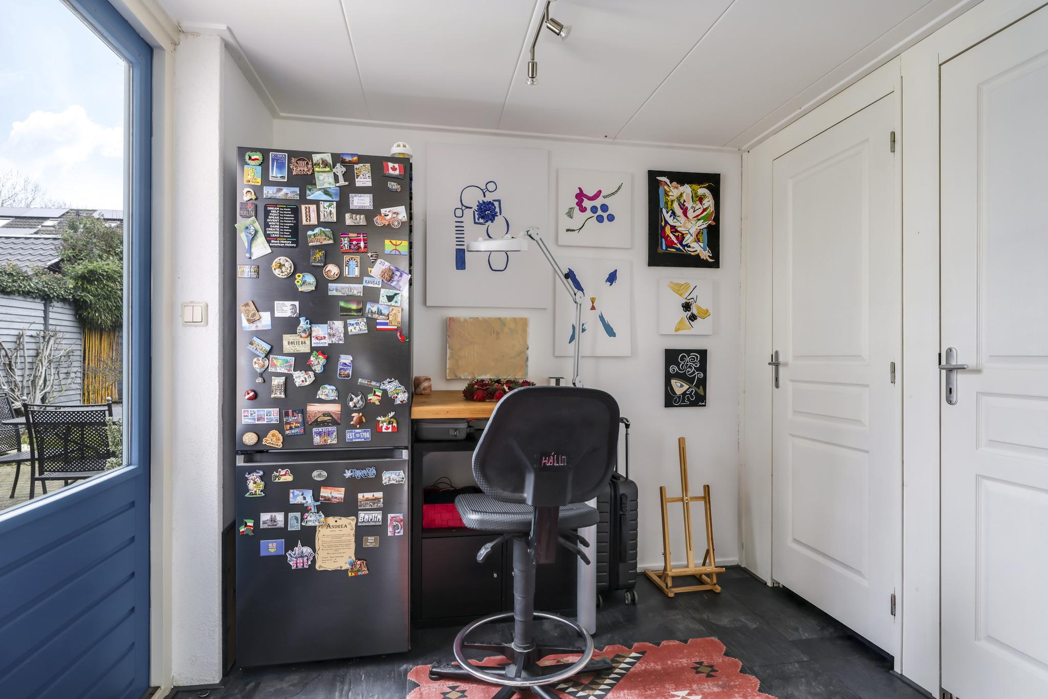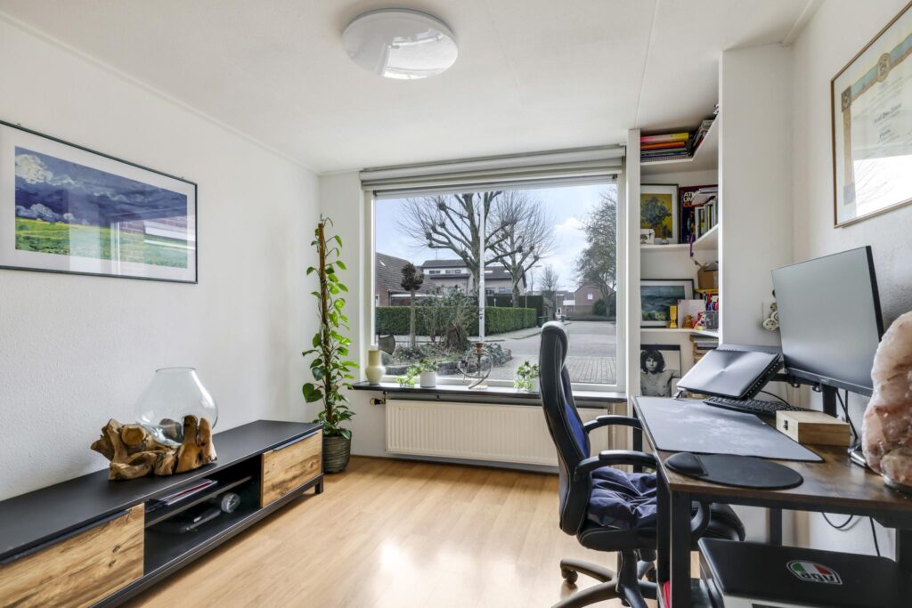 Doordat vanaf de bouw af de garage bij de woning is betrokken, zijn er flink wat extra vierkante meters leefruimte aan de woning toegevoegd. Deze ‘zijvleugel’ is opgedeeld in een werkkamer en een bergruimte. Hier kun je je prima terugtrekken om te werken en/of een speelkamer te maken. Aan de voorzijde geeft een groot raam veel lichtinval. Aan de achterzijde is een deur aanwezig waardoor je rechtstreeks de tuin in loopt.