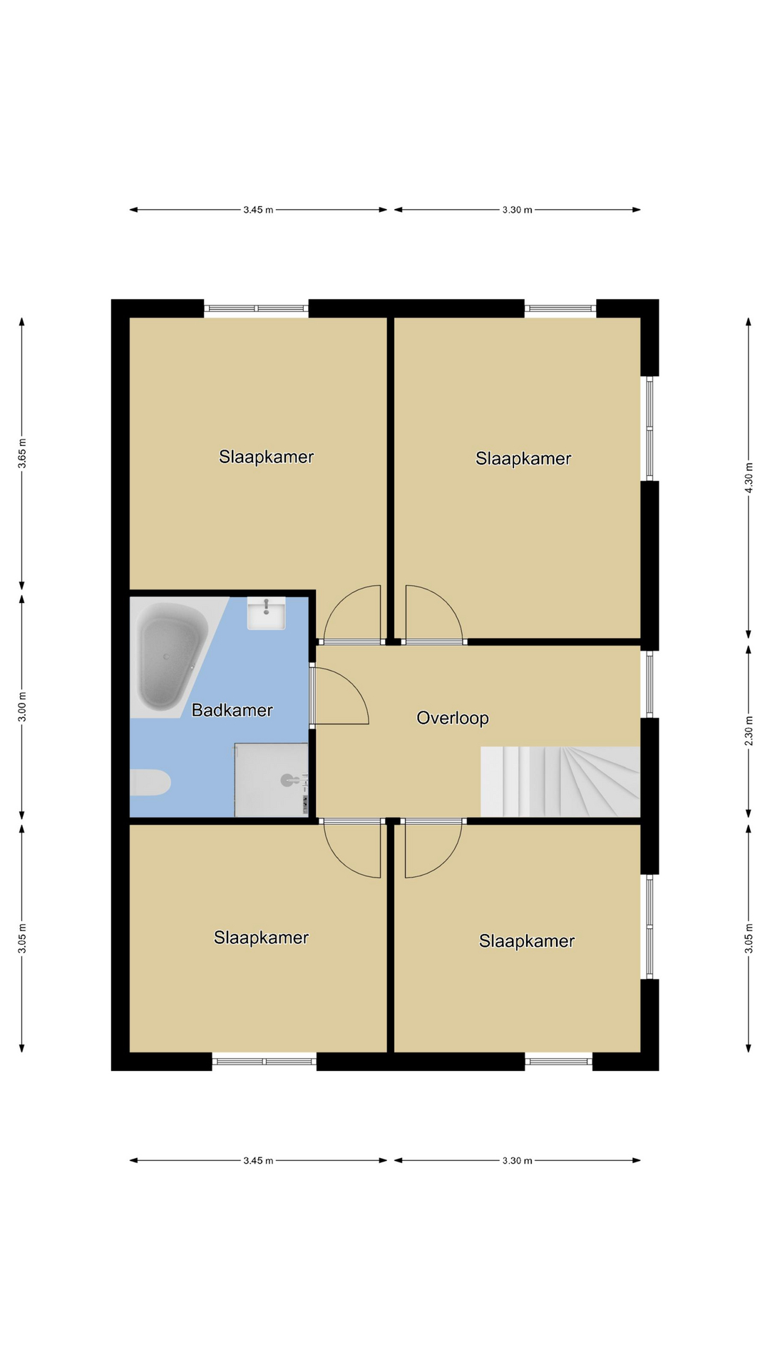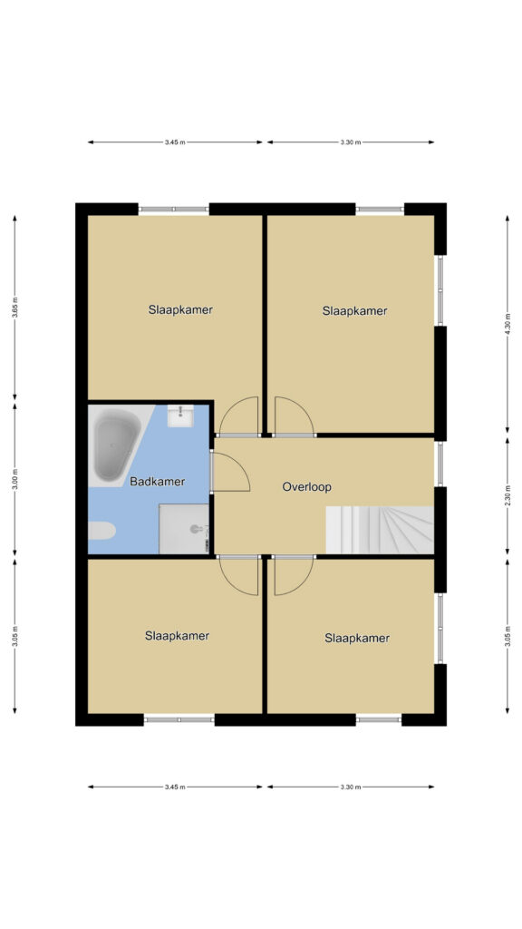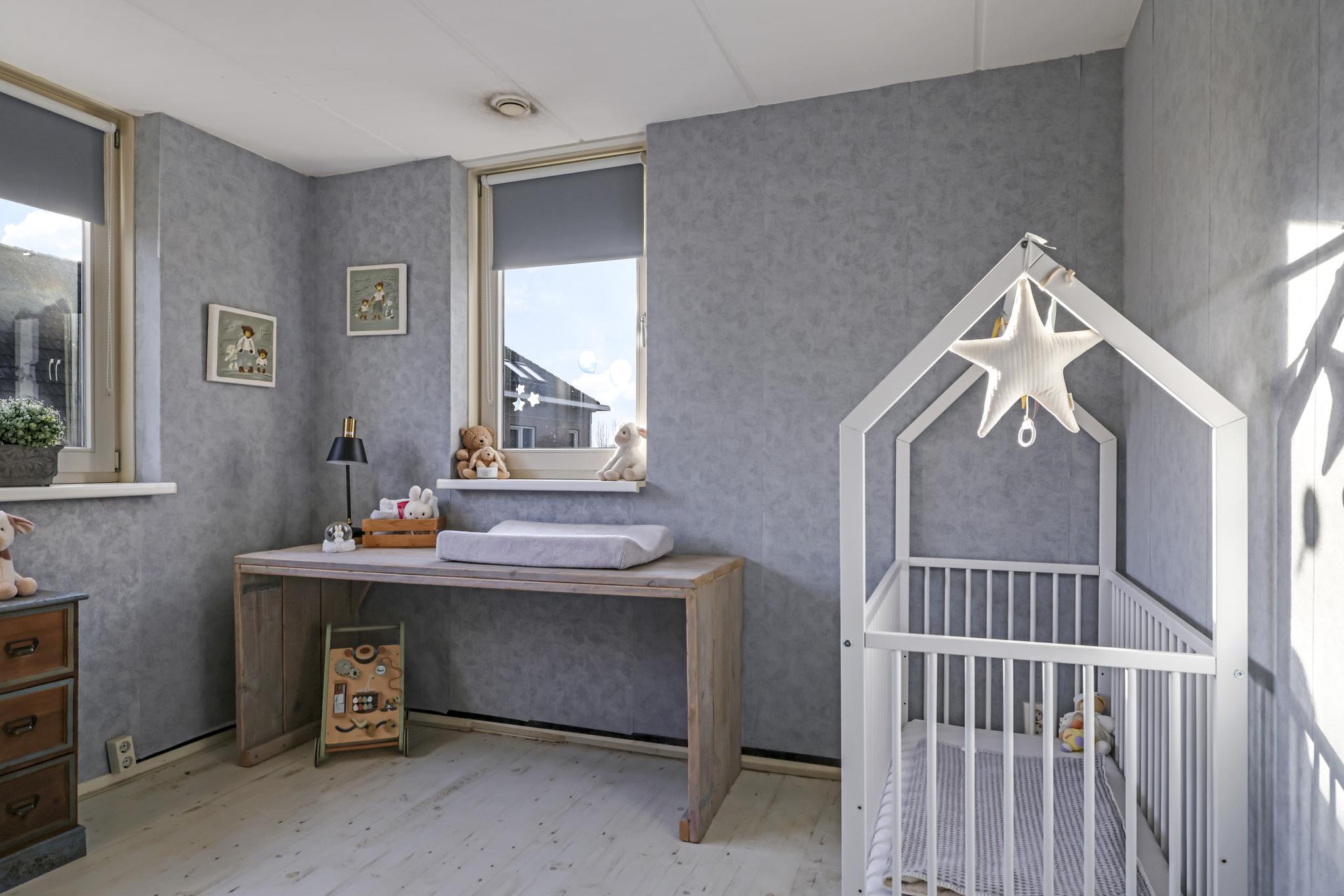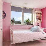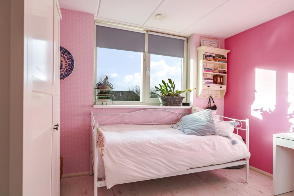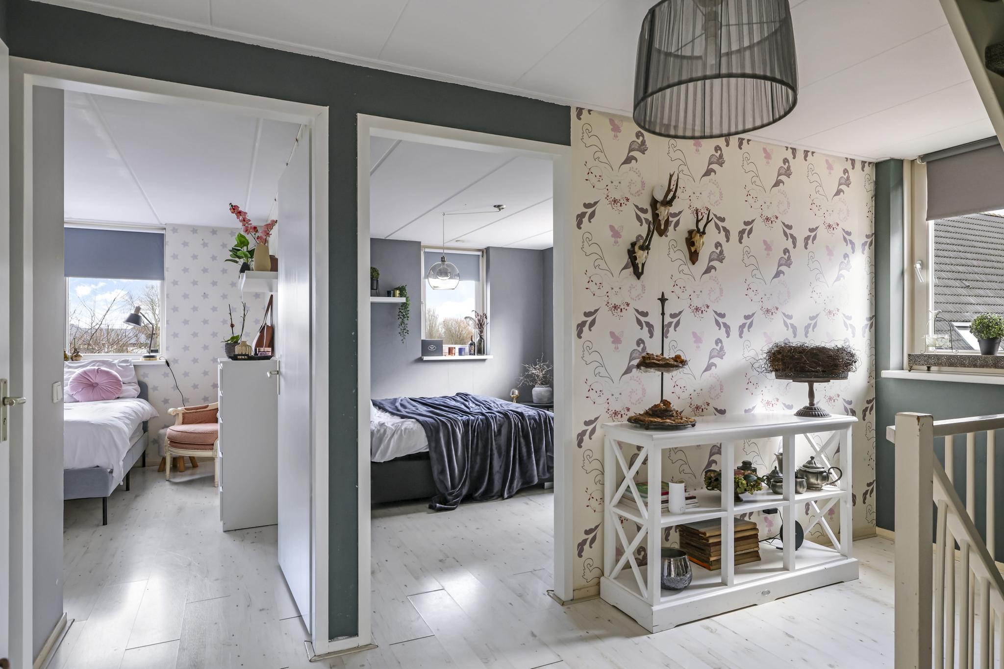 Via een prettige hal met garderobehoek komen we op de 1e verdieping terecht. Hier valt meteen de ruimte op de overloop op. Deze woonlaag is ingedeeld met maar liefst 4 (!) ruime slaapkamers van respectievelijk 14m2, 13m2, 11m2 en 10m2 groot. Er zit dus geen kleine kamer tussen. Bovendien vinden we hier geen schuine dakvlakken waardoor de kamers praktisch zijn in te delen. Er zijn geen radiatoren aanwezig doordat de gehele verdieping vloerverwarming heeft. Door de gunstige, hoge ligging van de woning is ook het vrije uitzicht de moeite waard.