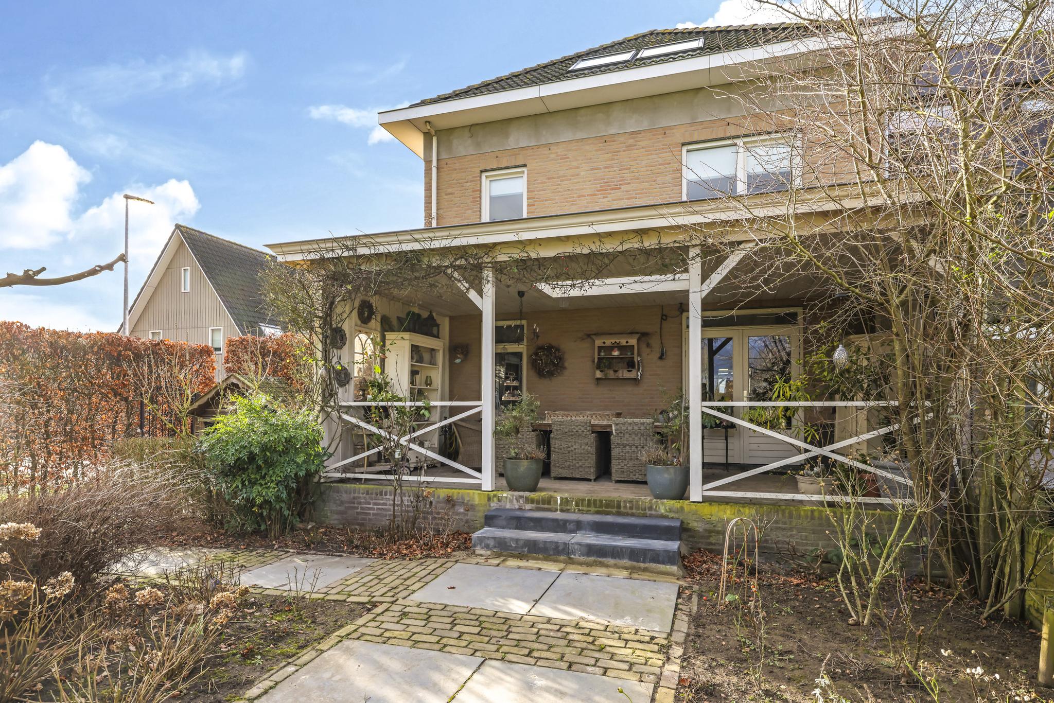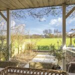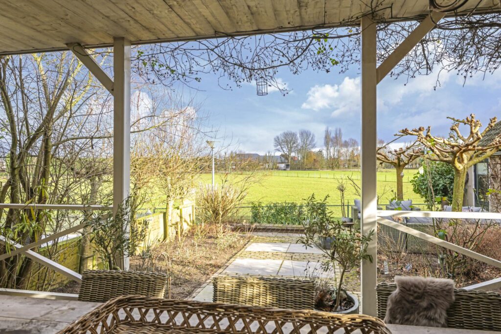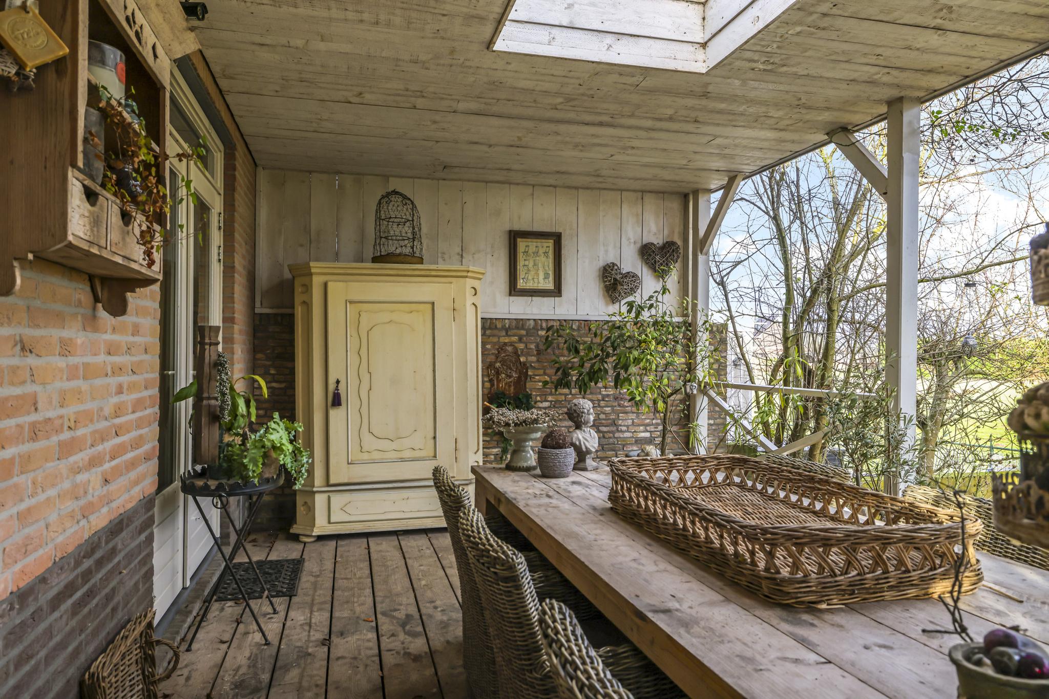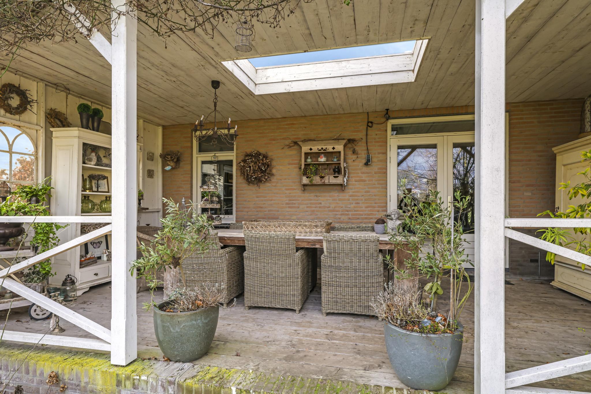 Eén van de grote pluspunten van deze woning is de achtertuin die aan de weilanden grenst. Een fraai onderdeel van de tuin is de veranda die bijna over de volle breedte van de woning is aangebouwd (7m bij 4m). Het landelijke karakter is ook hier weer duidelijk aanwezig, onder meer in materiaalkeuzes en detaillering. Voorbeelden zijn het houtvlonder terras, het stalraampje, de kruizen in het hekwerk en de rijk gedecoreerde boeiboorden. De lichtkoepel maakt het plaatje compleet met een sublieme lichtinval. Overigens ligt de veranda op hetzelfde niveau als de woning waardoor je prachtig vrij weg kijkt over de weilanden.