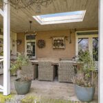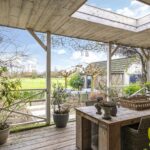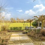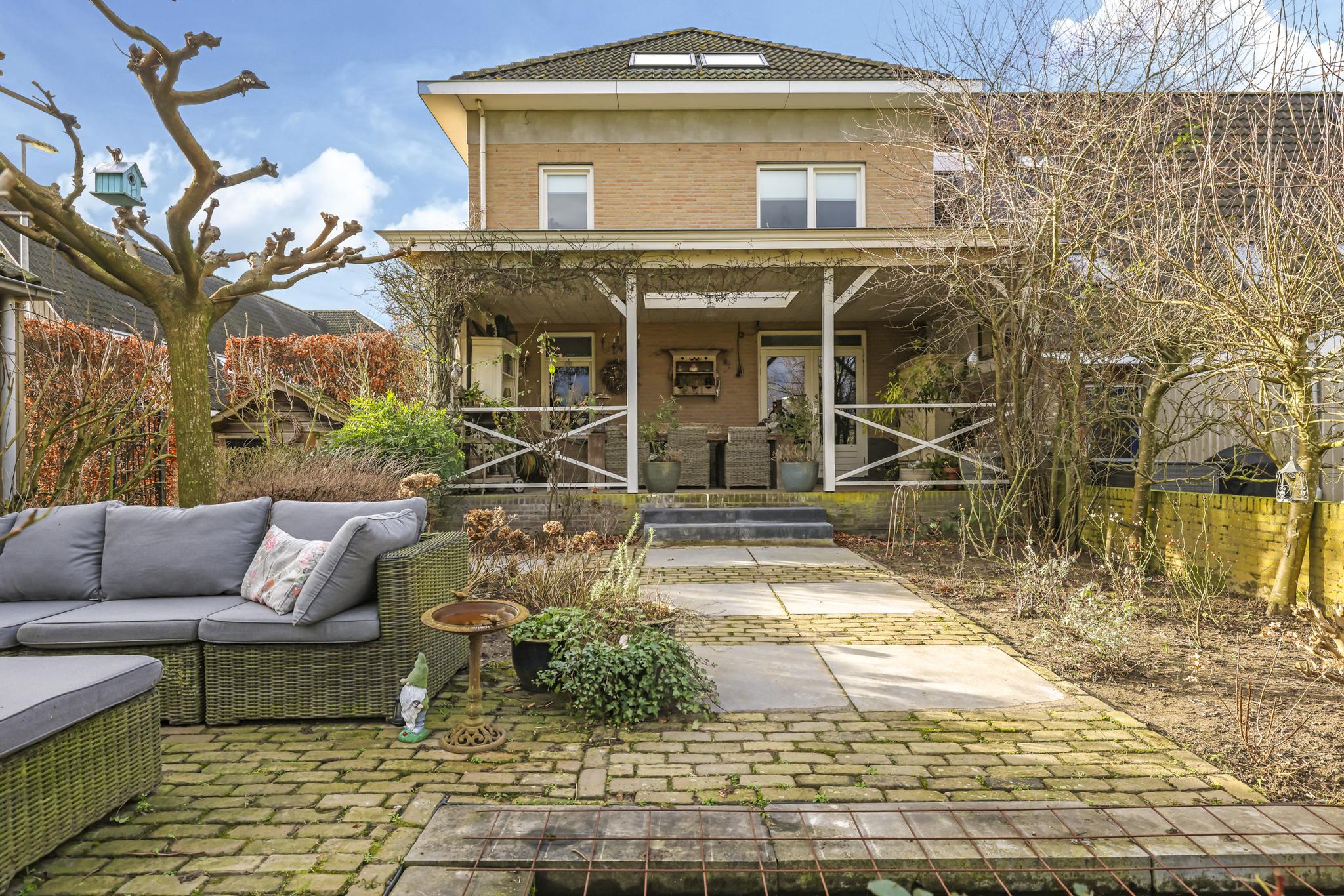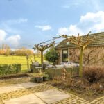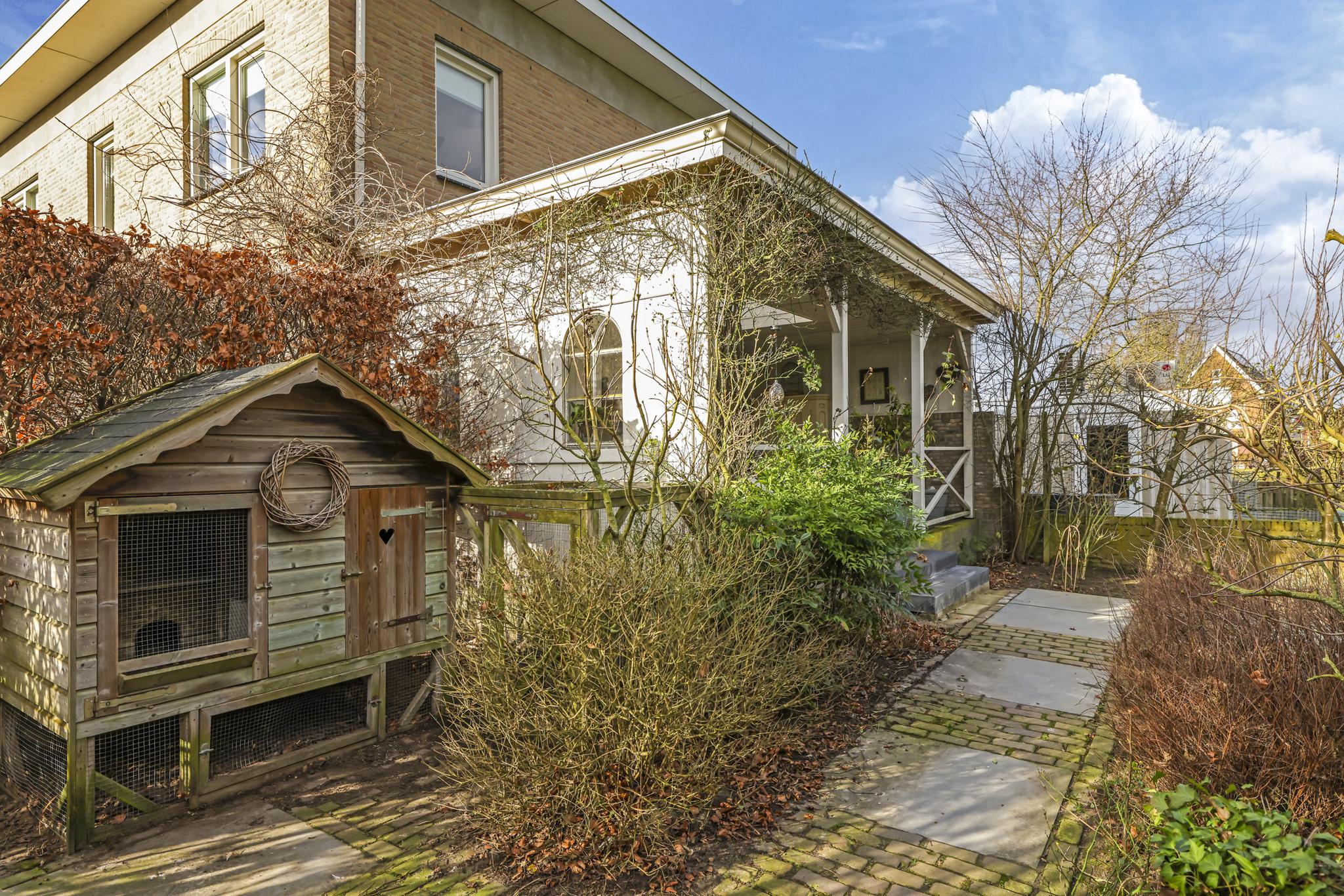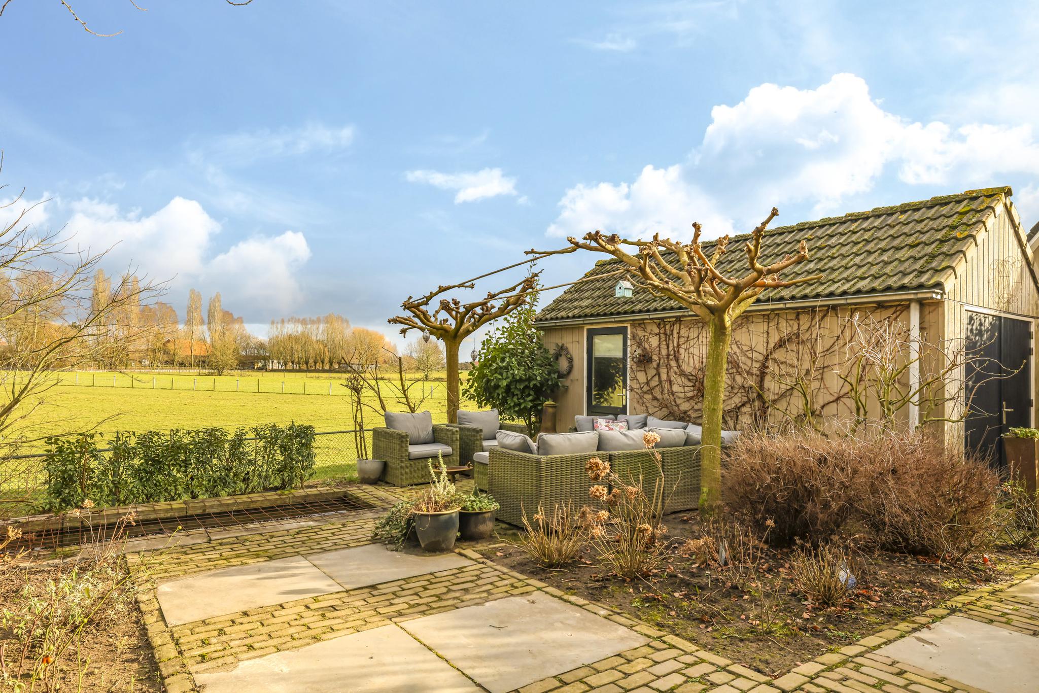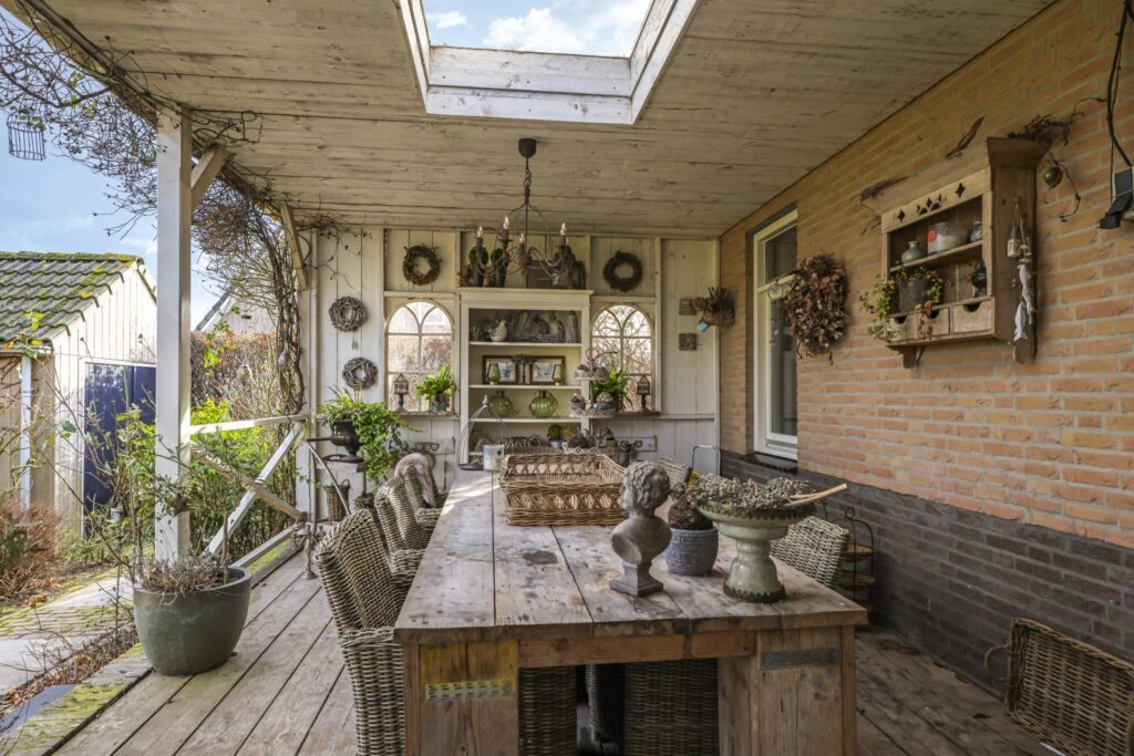 Eén van de grote pluspunten van deze woning is de achtertuin die aan de weilanden grenst. Een fraai onderdeel van de tuin is de veranda die bijna over de volle breedte van de woning is aangebouwd (7m bij 4m). Het landelijke karakter is ook hier weer duidelijk aanwezig, onder meer in materiaalkeuzes en detaillering. Voorbeelden zijn het houtvlonder terras, het stalraampje, de kruizen in het hekwerk en de rijk gedecoreerde boeiboorden. De lichtkoepel maakt het plaatje compleet met een sublieme lichtinval. Overigens ligt de veranda op hetzelfde niveau als de woning waardoor je prachtig vrij weg kijkt over de weilanden.