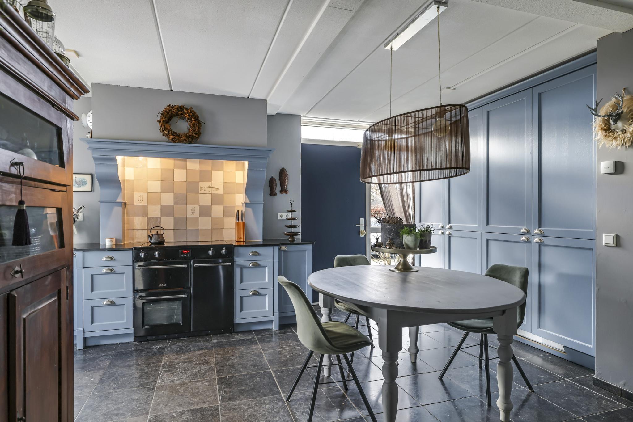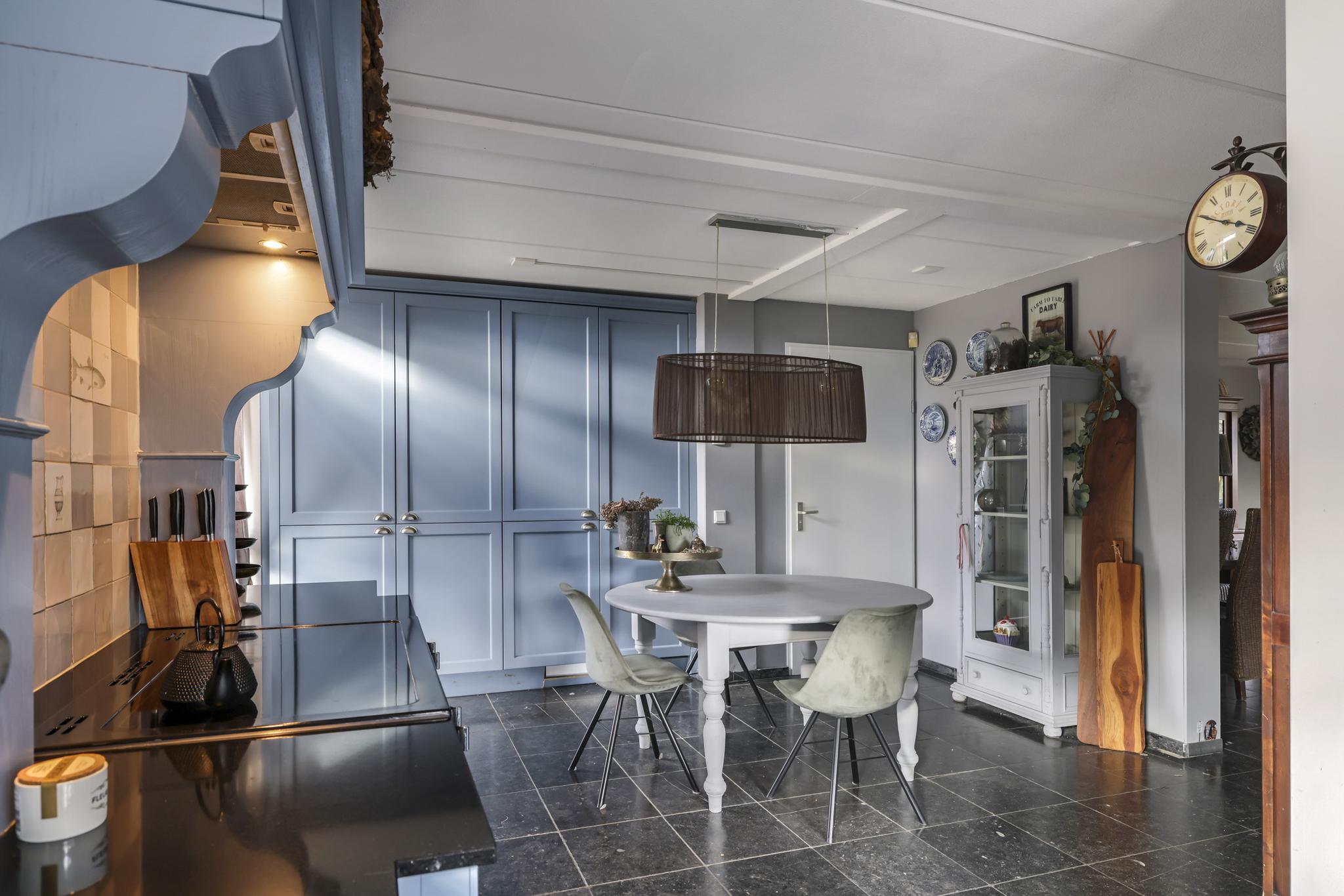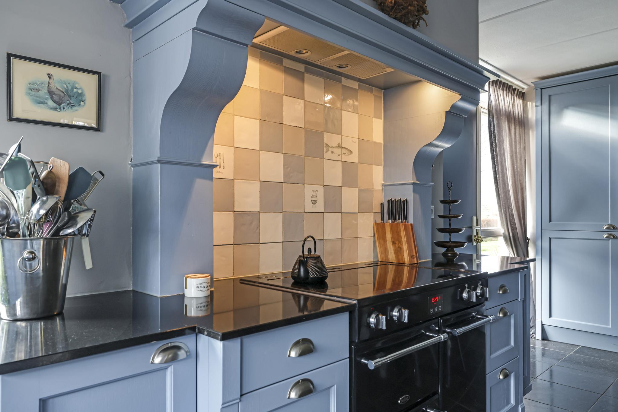 De keuken is geheel in stijl van de woning gekozen waarbij er niet is bezuinigd op materiaalkeuzes en inbouwapparatuur. De keuken is namelijk in massief hout uitgevoerd waarbij de paneelfronten de keuken een landelijke uitstraling geven. Het aanrechtblad is van composiet, net als de groot formaat gootsteen. De inbouwapparatuur bestaat uit onder meer een vaatwasser, een koelkast, een aparte vriezer (5 lades) en een magnetron. Een echte eye-catcher is het 90cm brede fornuis (Belling) met 5-pits inductie kookplaat en 3 afzonderlijke ovens. Boven het fornuis is een stijlvolle afzuigschouw met tegen de achterwand handgevormde tegeltjes aangebracht. Hoge servieskasten met de nodige opbergmogelijkheden maken deze keuken compleet.