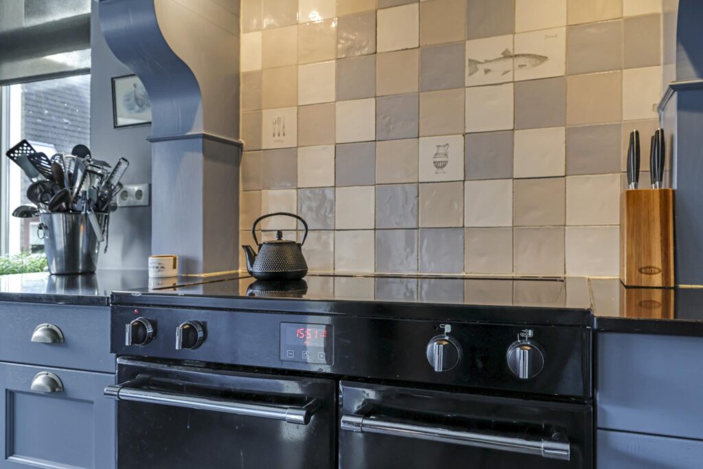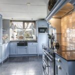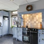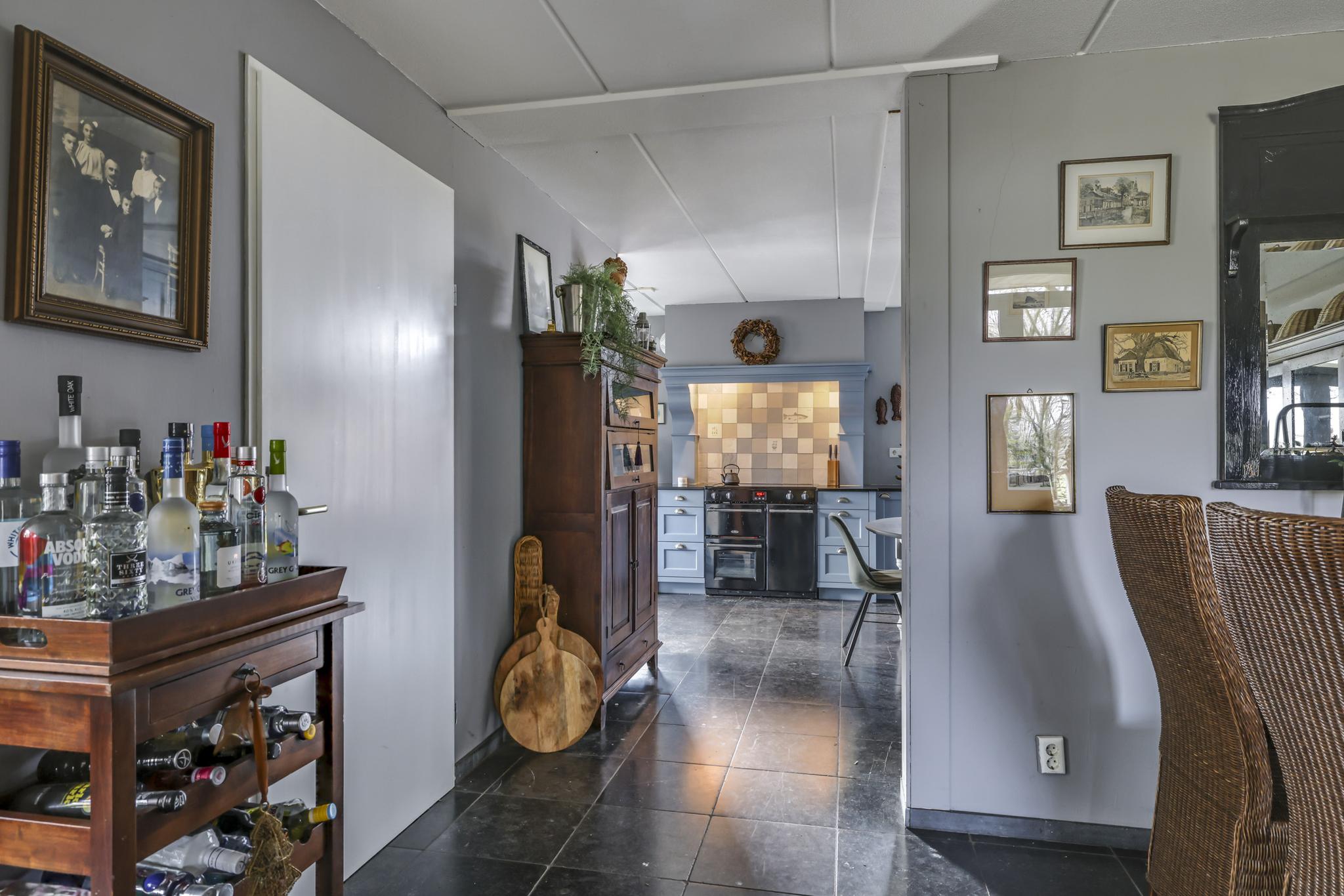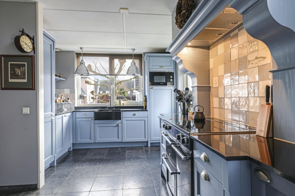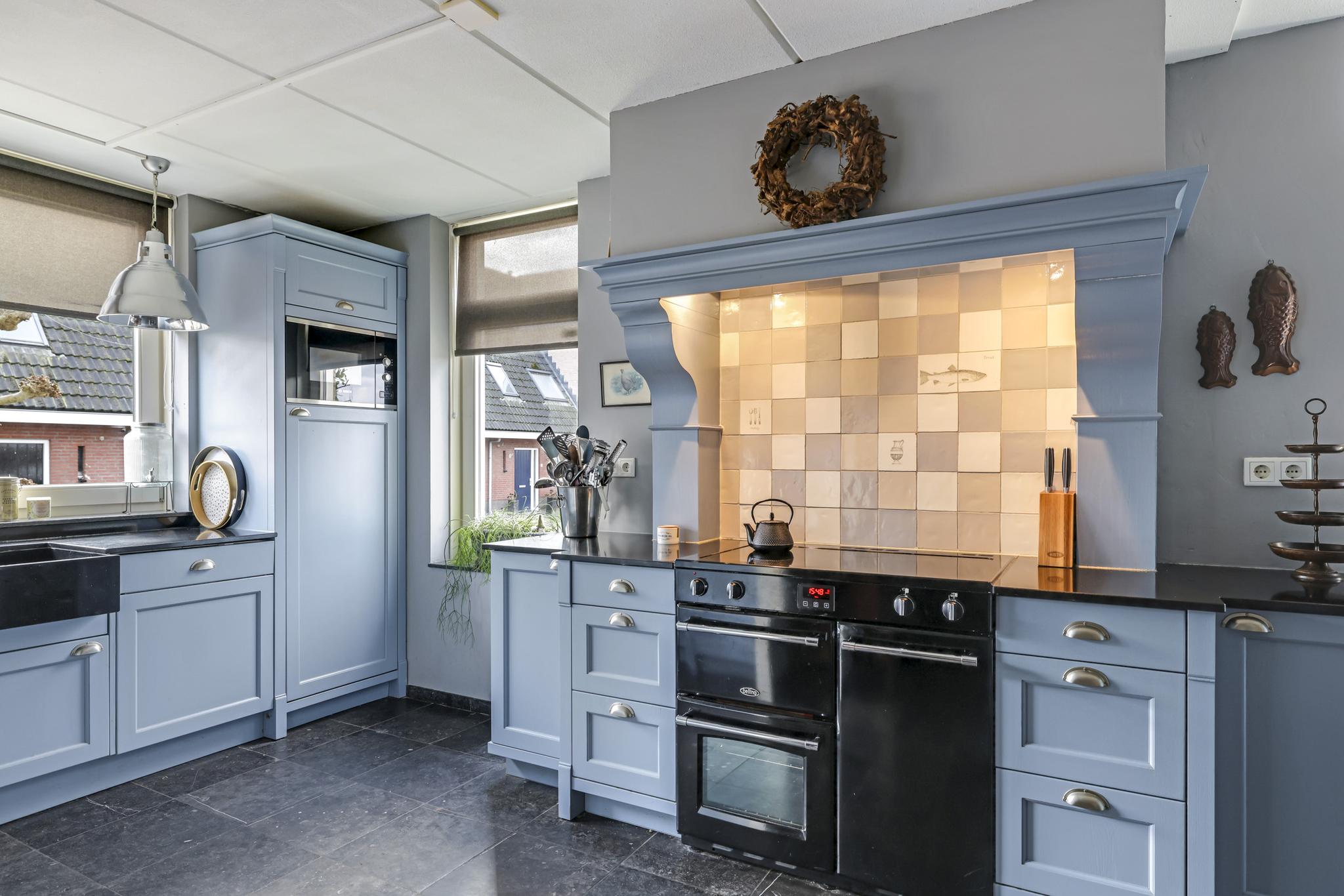 De keuken is geheel in stijl van de woning gekozen waarbij er niet is bezuinigd op materiaalkeuzes en inbouwapparatuur. De keuken is namelijk in massief hout uitgevoerd waarbij de paneelfronten de keuken een landelijke uitstraling geven. Het aanrechtblad is van composiet, net als de groot formaat gootsteen. De inbouwapparatuur bestaat uit onder meer een vaatwasser, een koelkast, een aparte vriezer (5 lades) en een magnetron. Een echte eye-catcher is het 90cm brede fornuis (Belling) met 5-pits inductie kookplaat en 3 afzonderlijke ovens. Boven het fornuis is een stijlvolle afzuigschouw met tegen de achterwand handgevormde tegeltjes aangebracht. Hoge servieskasten met de nodige opbergmogelijkheden maken deze keuken compleet.