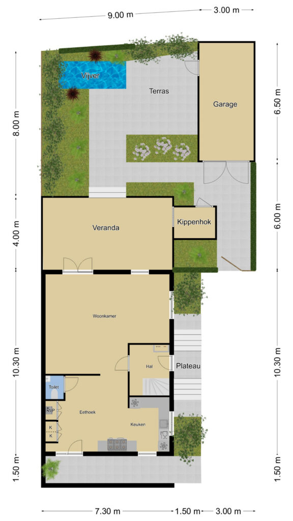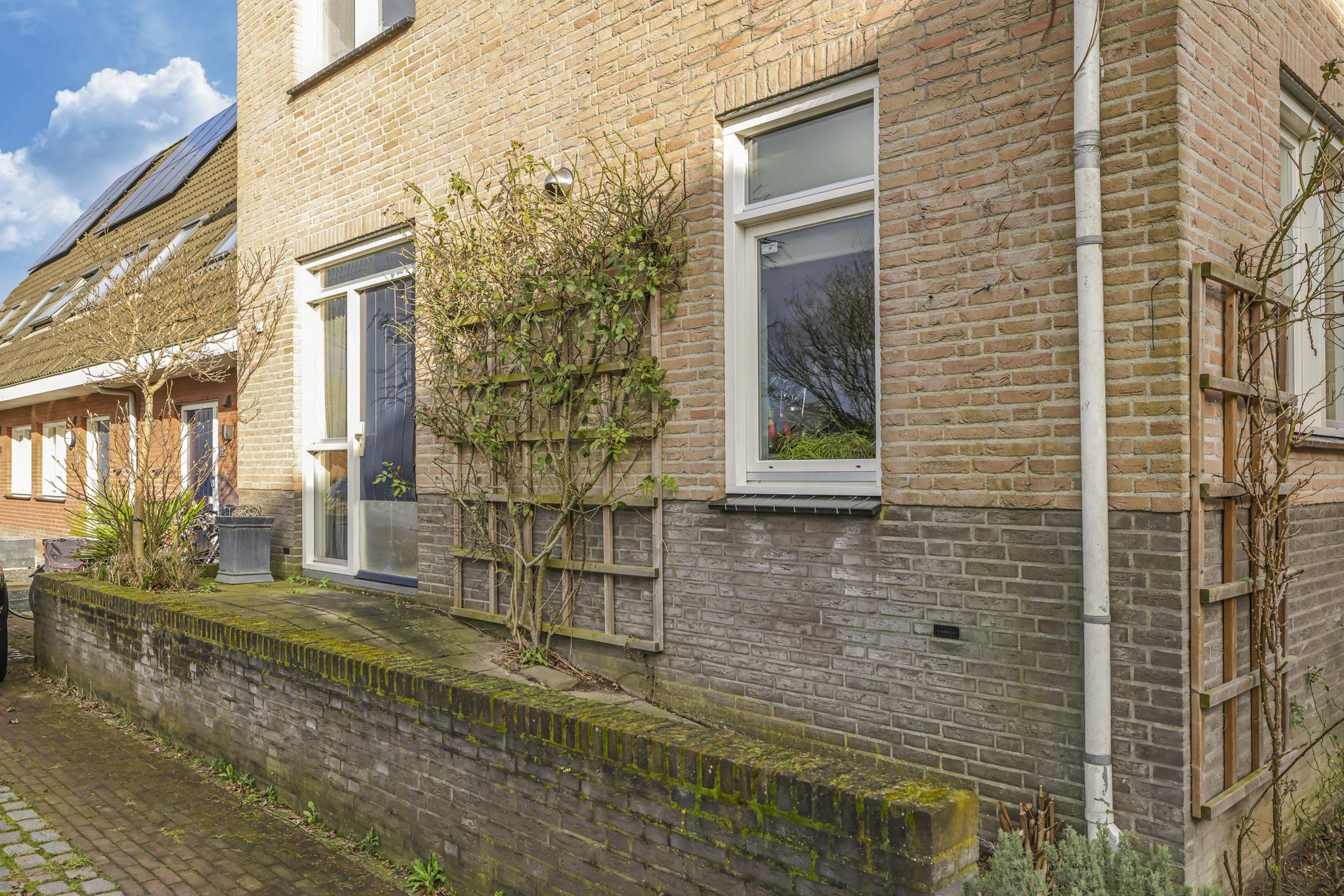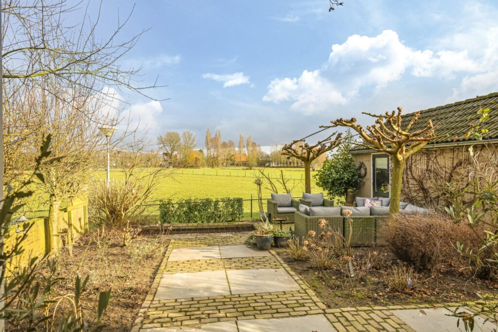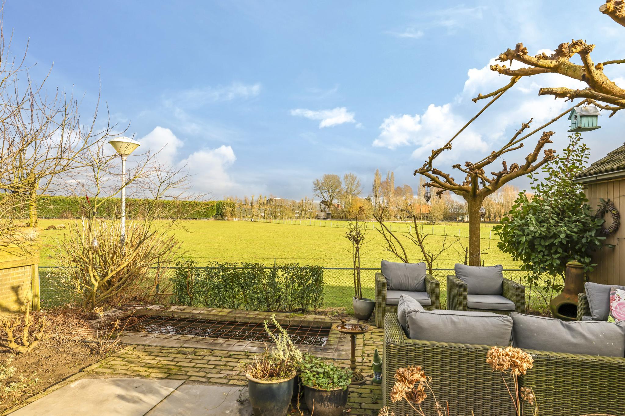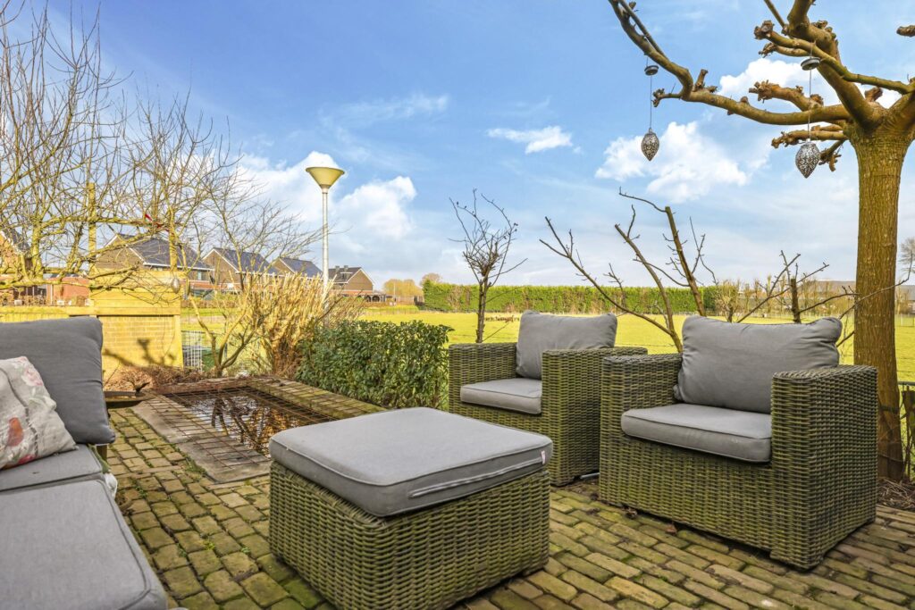 De tuin bestaat verder uit een vijver en een 2e zitterras (tegels 80×80) met plaats voor een uitgebreide tuinset. Diverse struiken en onder meer een volwassen dakplataan zorgen voor een groen karakter. Privacy hoef je niet te creëren want die is hier al gewaarborgd door de vrije ligging aan de rand van het dorp. Terwijl je geniet van een lekker wijntje, staan de schapen aan de andere kant van de sloot te grazen. En mocht je het leuk vinden, dan mogen de kippen en het kippenhok van verkoper achterblijven.