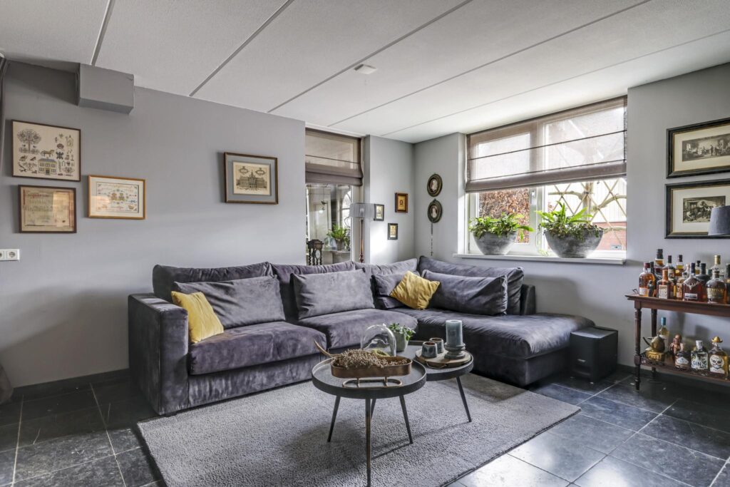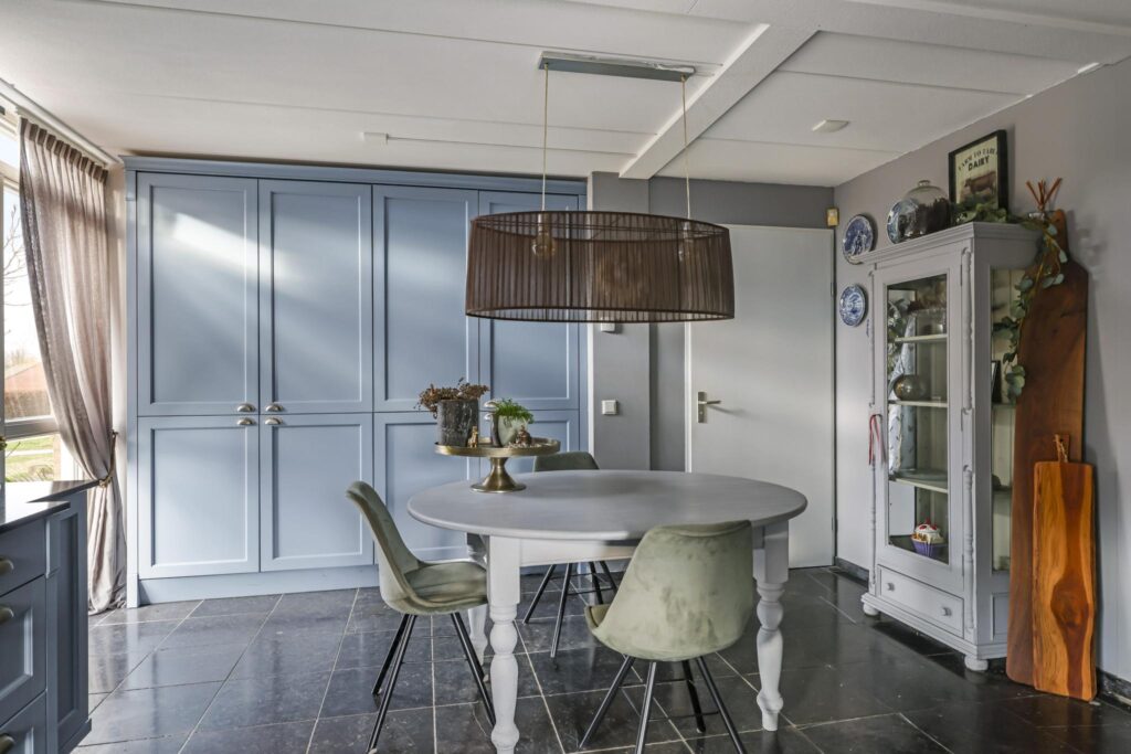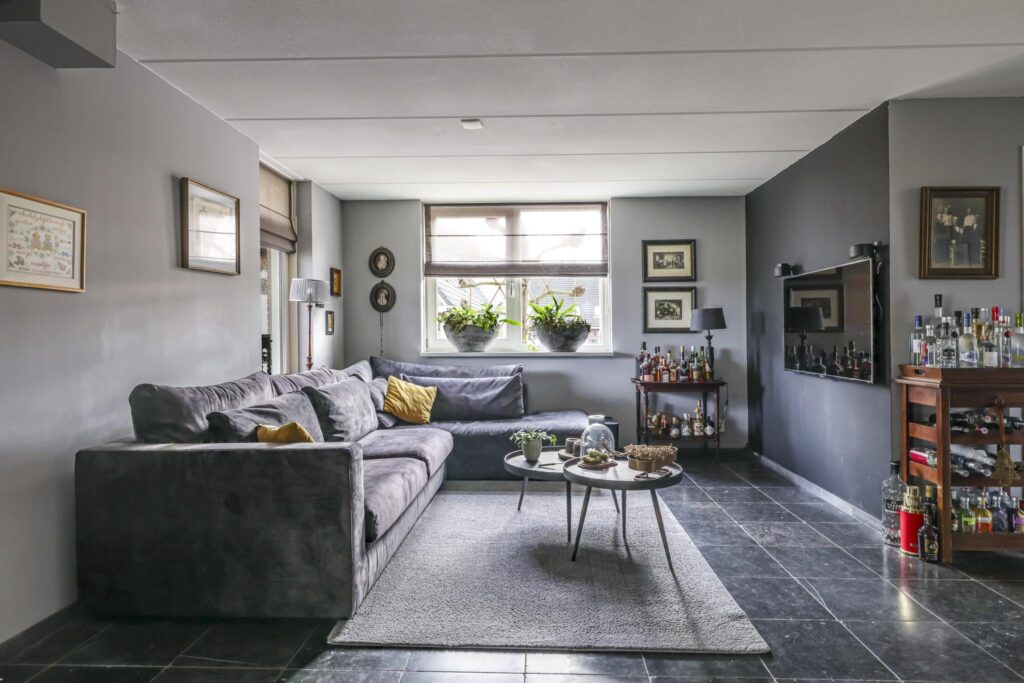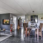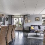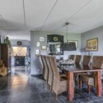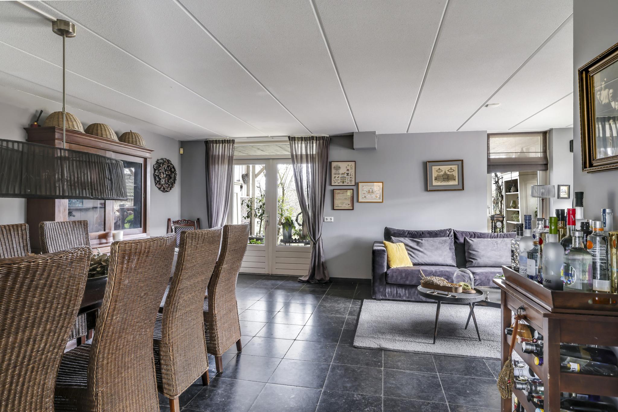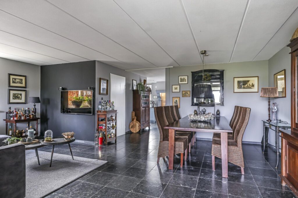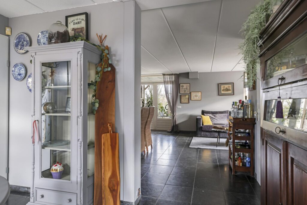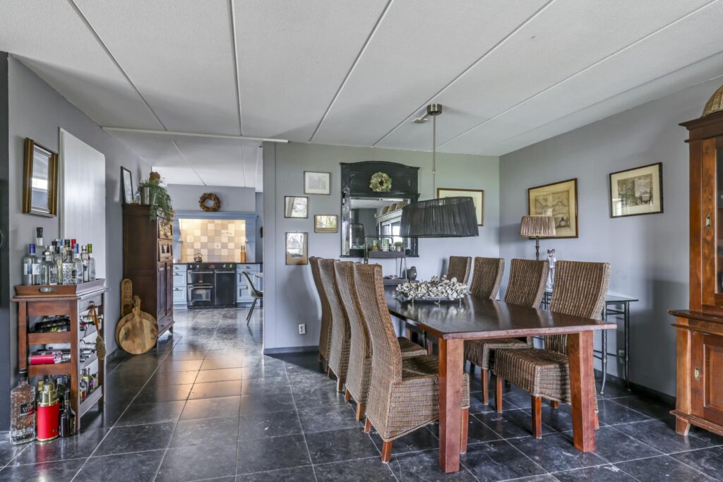 De woonkamer voelt ruimtelijk aan, mede door de praktische indeling en de raampartijen die voor een prettige lichtinval zorgen. Het vrije uitzicht door de straat en op de weilanden versterken het vrije gevoel. De living biedt ruimte aan een comfortabele zithoek waarbij je niet hoeft op te letten of dat die grote hoekbank wel past. Hetzelfde geldt voor een lange eettafel. In de huidige setting is er gekozen voor een 8-persoons eettafel hetgeen niet ten koste is gegaan van het ruimtelijke gevoel. Het afwerkingsniveau is verzorgd te noemen hetgeen je terug ziet in gladde stucwanden en een vloer die in Belgisch hardsteen is uitgevoerd. Dubbele terrasdeuren geven direct toegang tot de veranda waardoor je eenvoudig het buitenleven bij de woning betrekt.