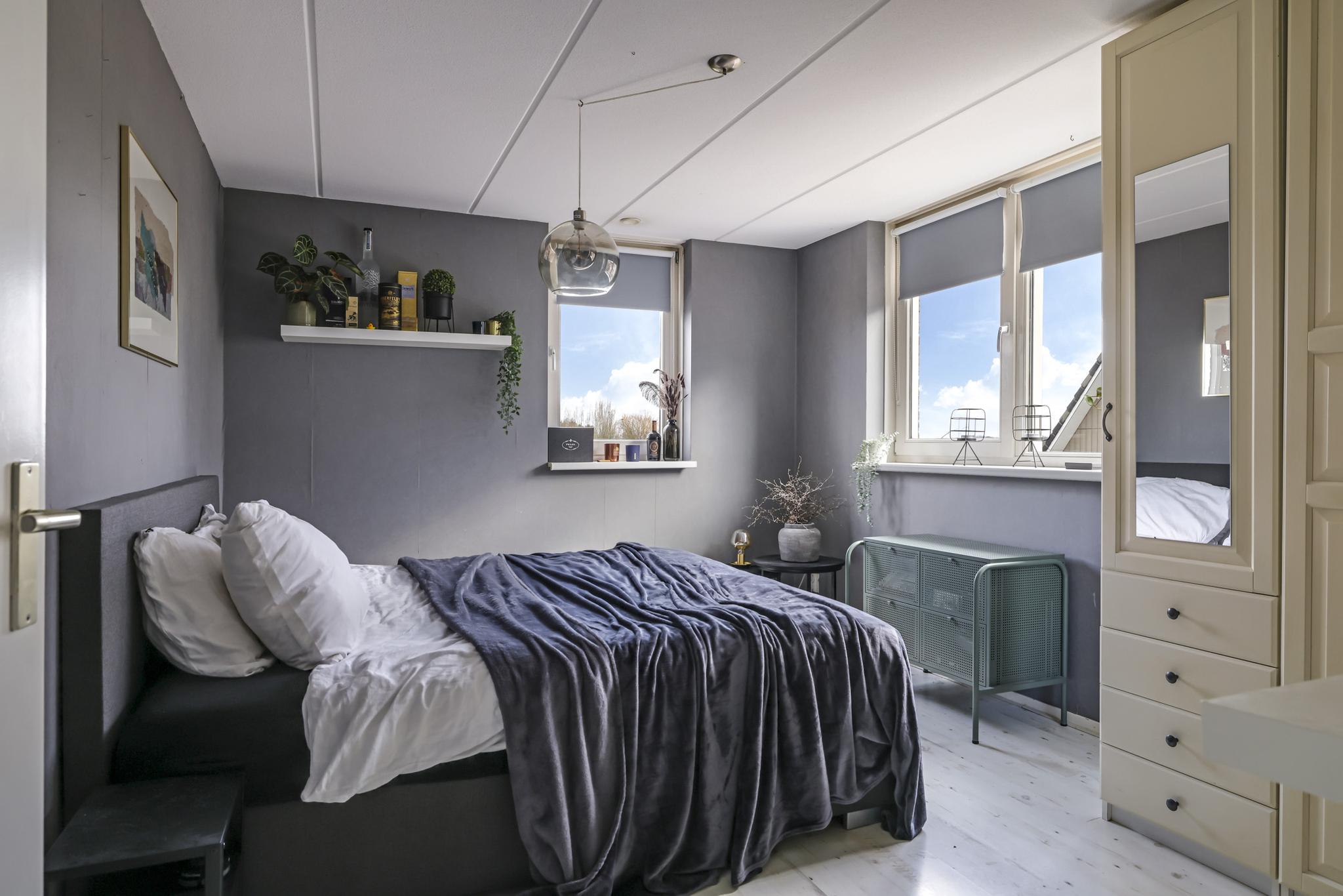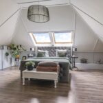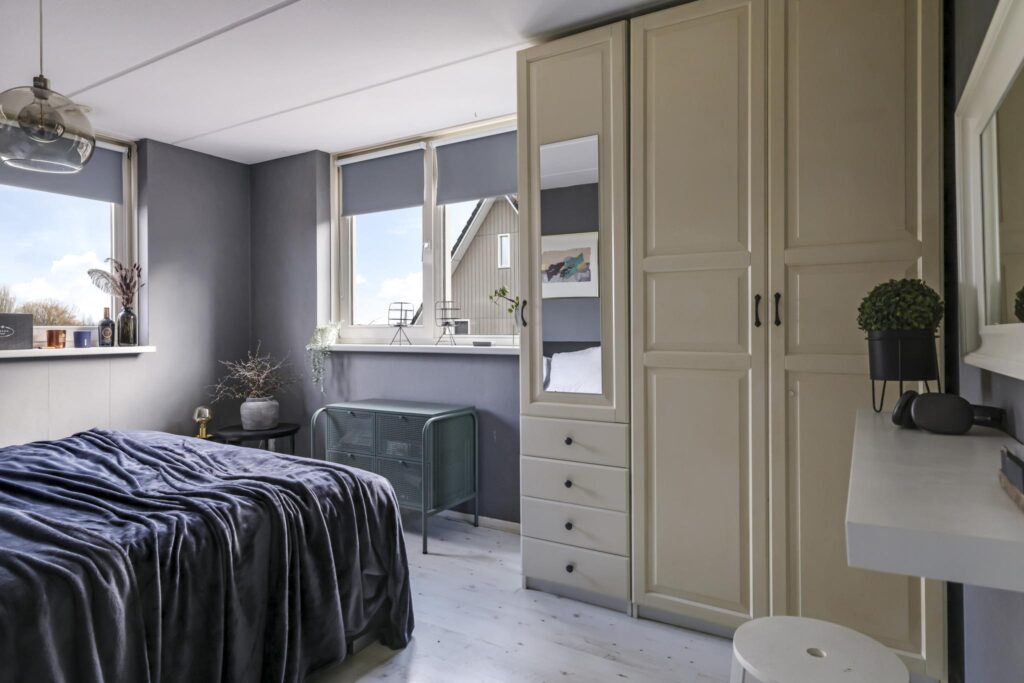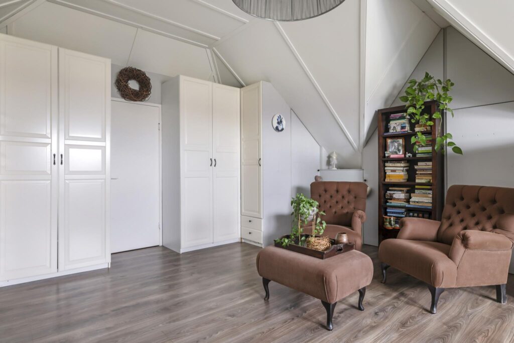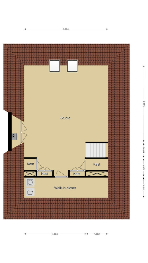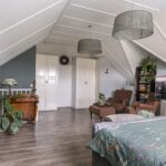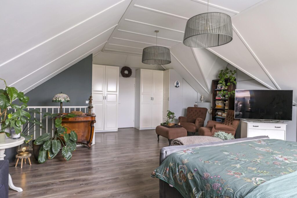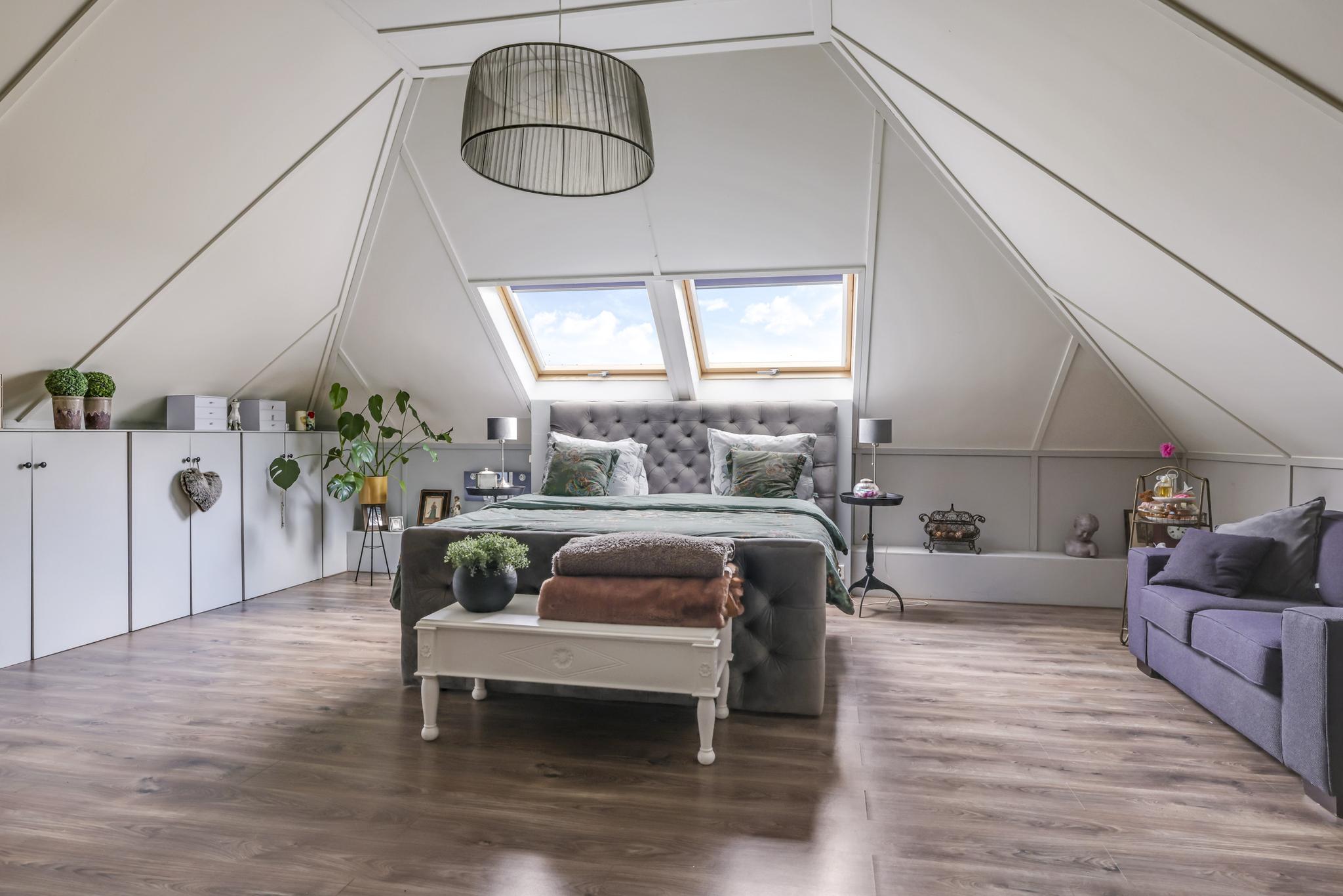 Wanneer we doorlopen naar de 2e verdieping, wordt je overweldigd door de ruimte die je tegemoet komt. Hier is ervoor gekozen om de ruimte niet op te delen in meerdere slaapkamers maar om de ruimte maximaal te laten zien. Grote dakvensters en een hoge nok versterken daarbij het ruimtelijk ‘balzaal-gevoel’. Je zou het een grote studio kunnen noemen, ideaal voor ouders of voor een tiener die voorlopig nog niet het huis uit gaat. Opvallend zijn de vaste linnenkasten die voor een uitgebreide garderobe zorgen. Achter de kasten is er nog een inloopkast c.q. wasruimte te vinden. Naast de wasmachine- en wasdrogeropstelling kun je hier nog veel (seizoen)spullen opbergen.