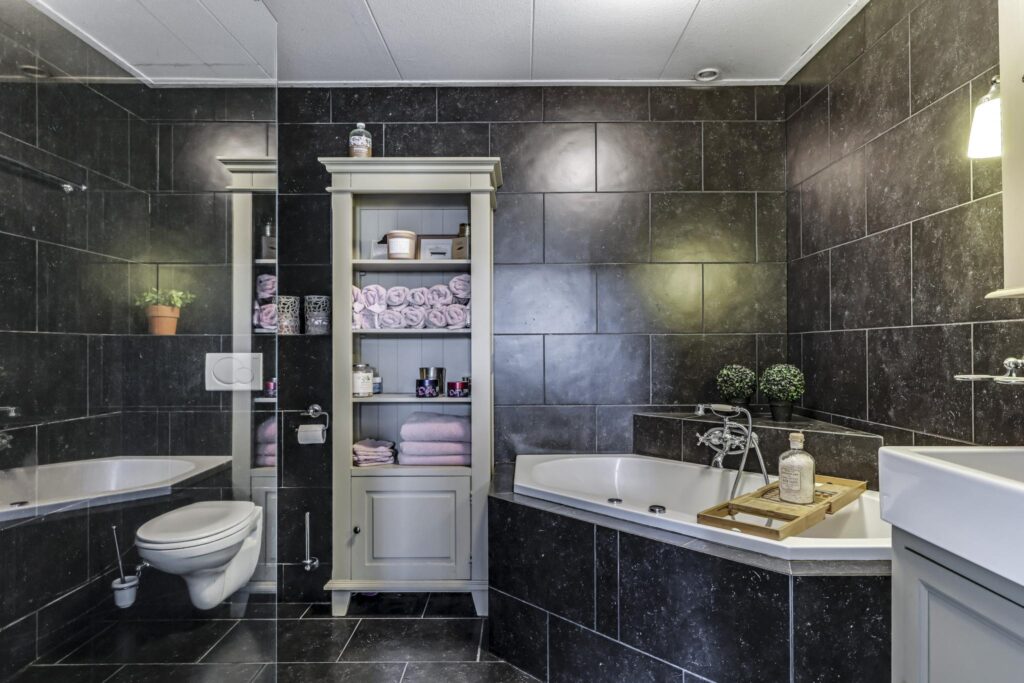 Badkamer met whirlpool ligbad, inloopdouche en 2e toilet.