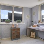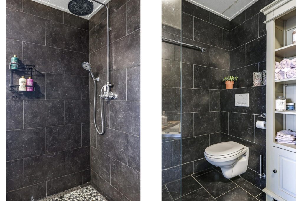 Net als de slaapkamers is ook de badkamer goed bemeten. De ruimte is optimaal en praktisch ingedeeld waarbij er niets is bezuinigd op het sanitair en inrichting. Denk daarbij aan een whirlpool ligbad en een comfortabele inloopdouche met zowel een rainshower als een handdouche (vernieuwd). Net als op de begane grond is ook hier het toilet zwevend uitgevoerd. Geheel in de landelijke stijl van de woning is het wastafelmeubel en de spiegelkast in hout uitgevoerd. Beiden worden ter overname aangeboden. Koude voeten hoef je hier niet te krijgen aangezien de vloerverwarming op de badkamer gewoon doorloopt.