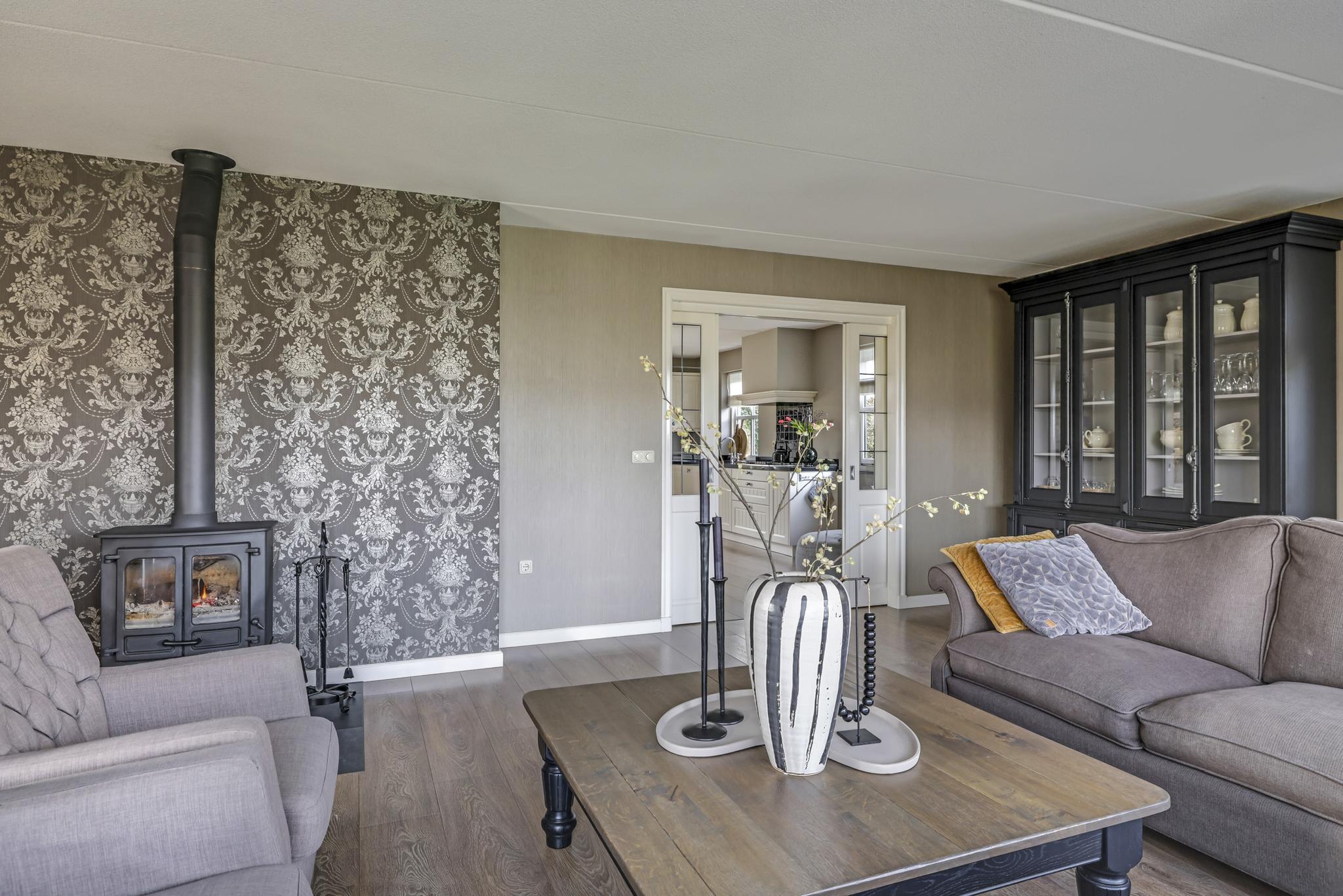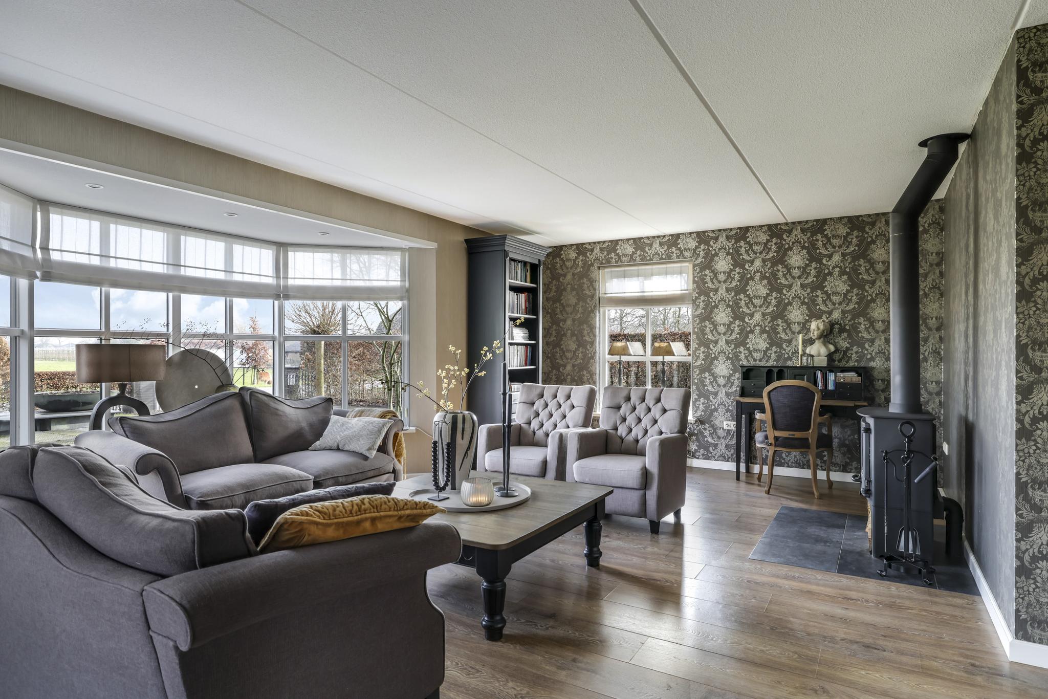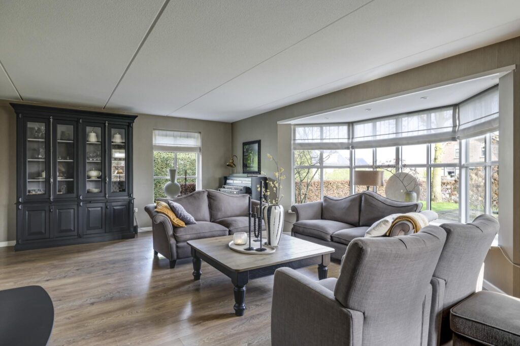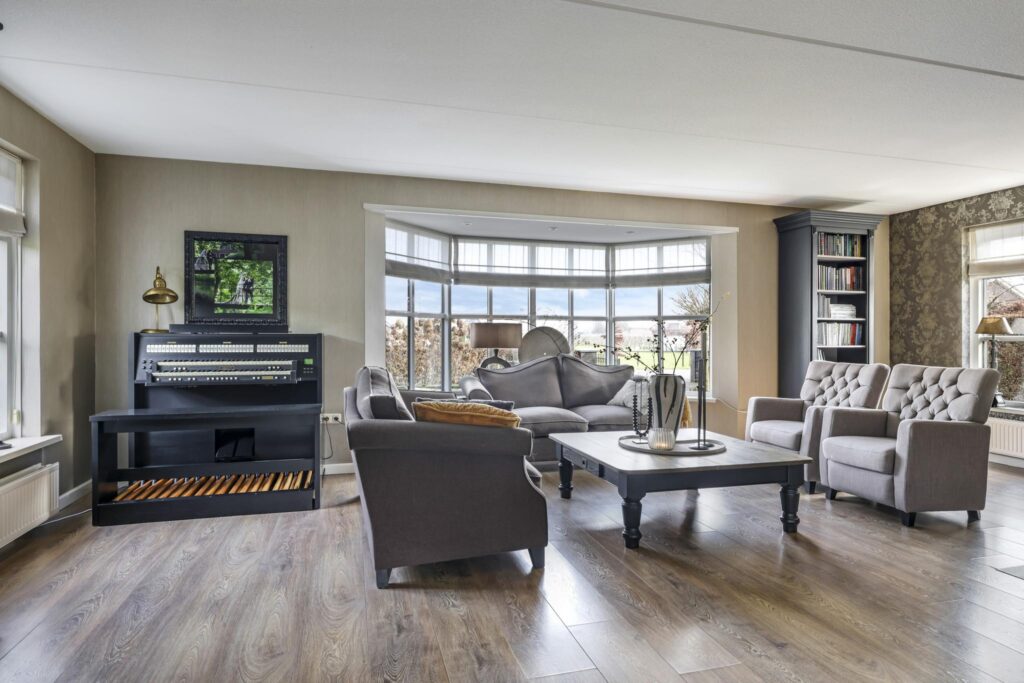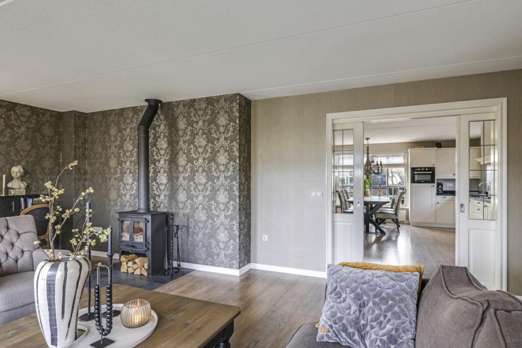 De royale woonkamer aan de voorzijde voelt prettig aan. Daarbij zorgt een erker voor veel lichtinval en biedt vrij uitzicht op de tegenovergelegen weide met pony’s. De kamer beslaat de volle breedte van de woning, waardoor er voldoende ruimte is voor een comfortabele zithoek met een grote hoekbank. De houtkachel voegt extra warmte en sfeer toe, ideaal voor gezellige avonden met familie en vrienden.