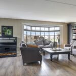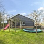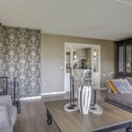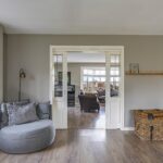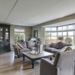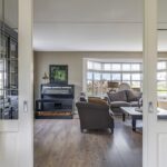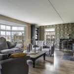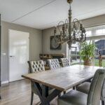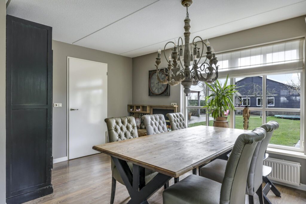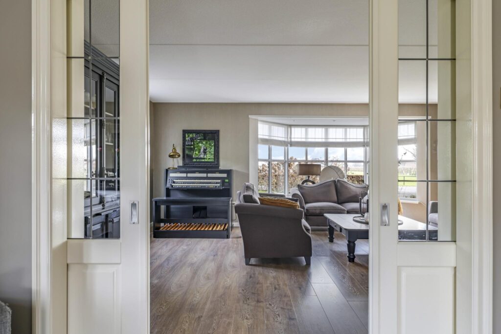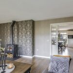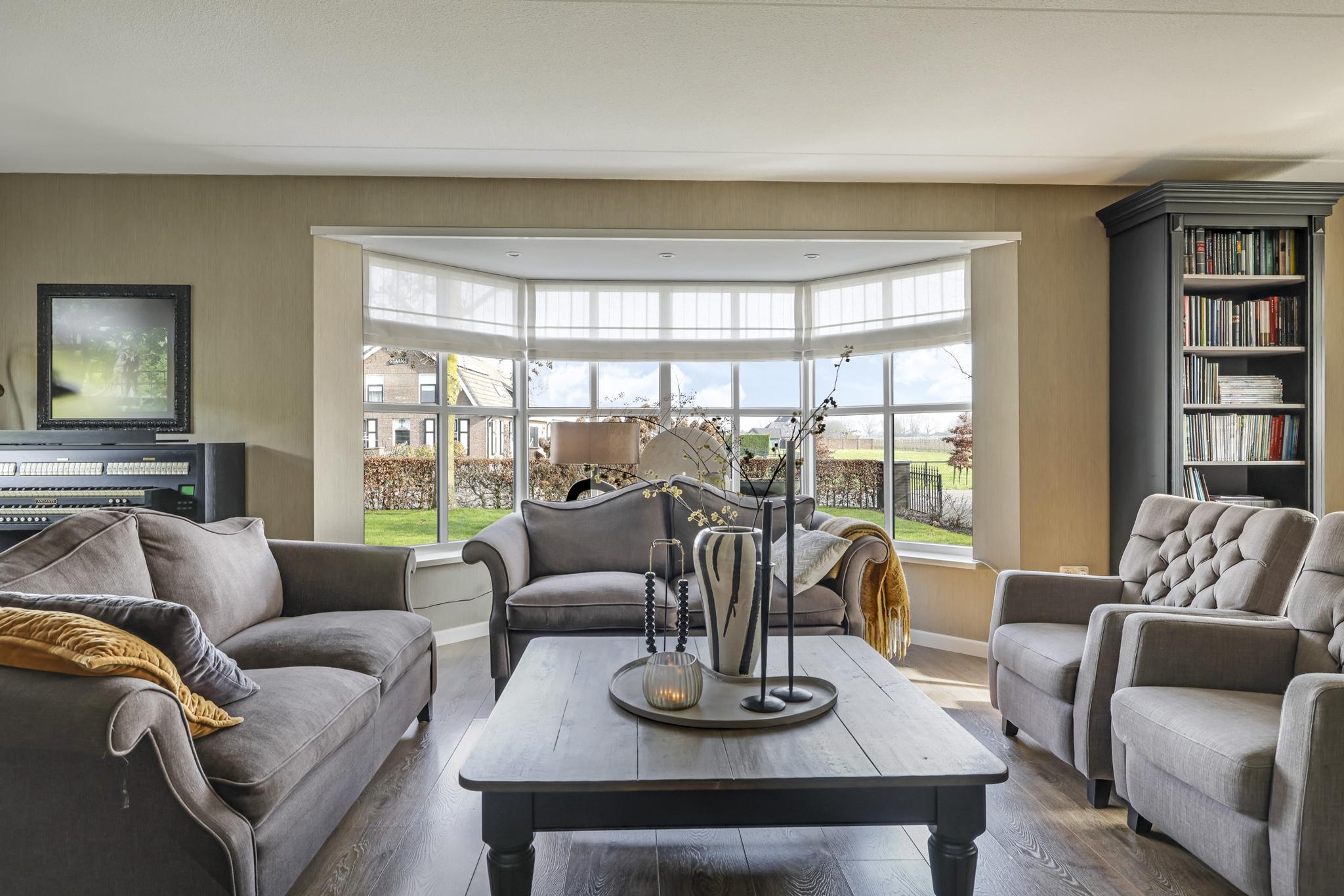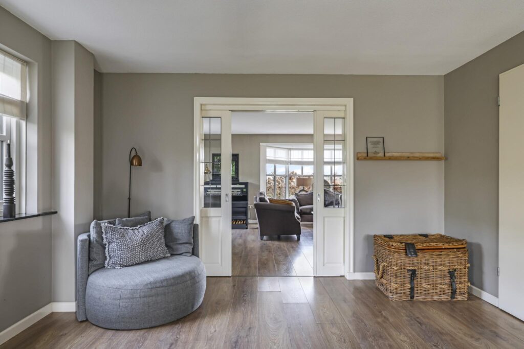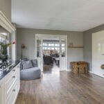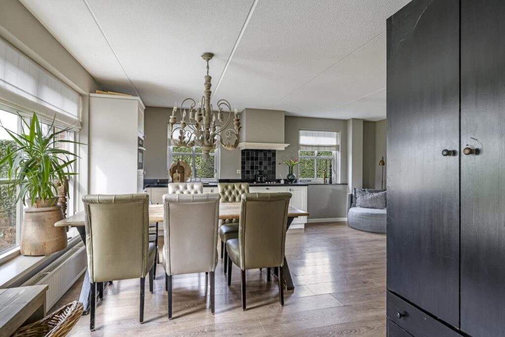 De royale woonkamer aan de voorzijde voelt prettig aan. Daarbij zorgt een erker voor veel lichtinval en biedt vrij uitzicht op de tegenovergelegen weide met pony’s. De kamer beslaat de volle breedte van de woning, waardoor er voldoende ruimte is voor een comfortabele zithoek met een grote hoekbank. De houtkachel voegt extra warmte en sfeer toe, ideaal voor gezellige avonden met familie en vrienden.