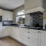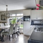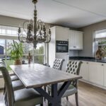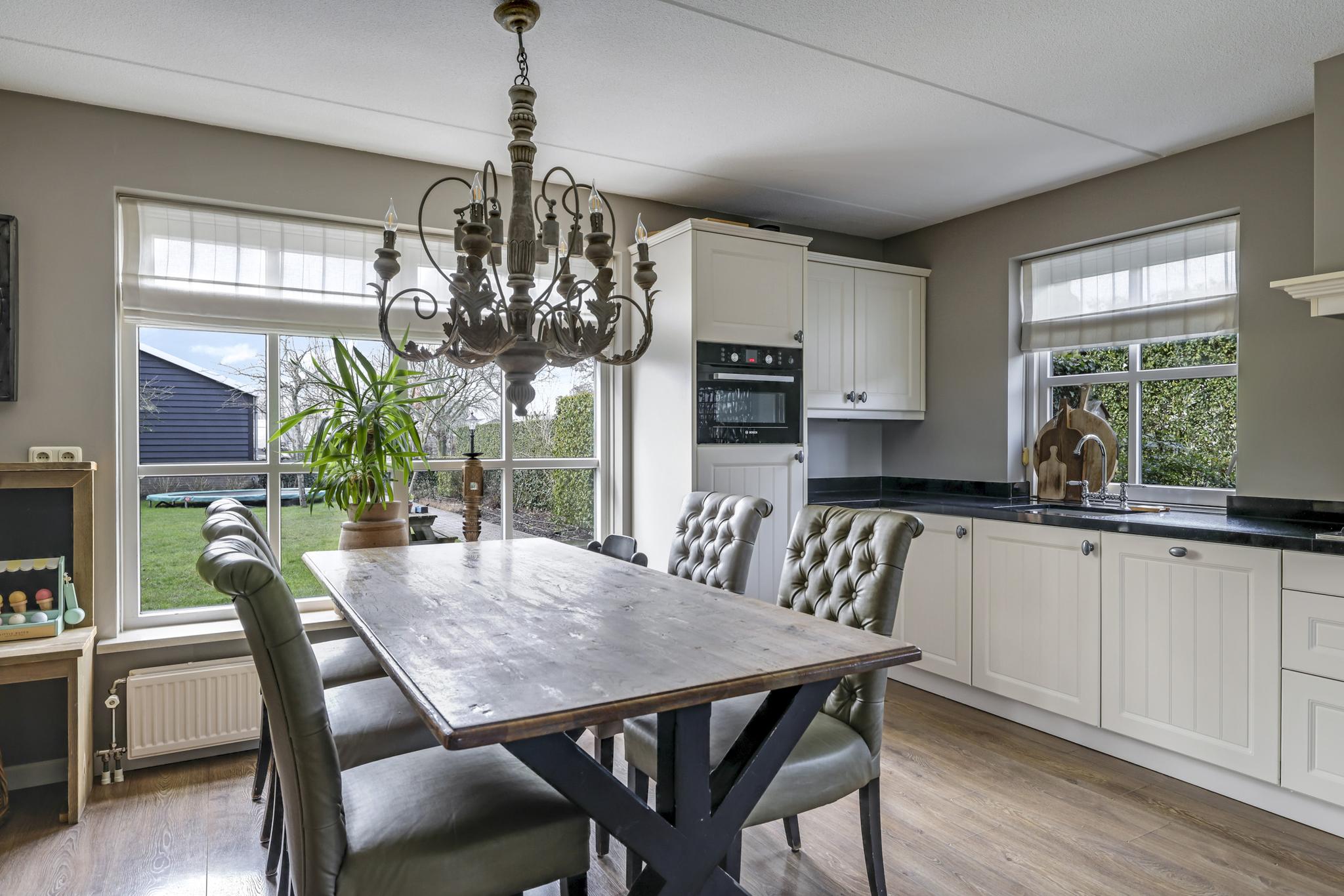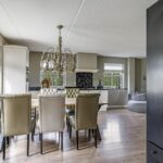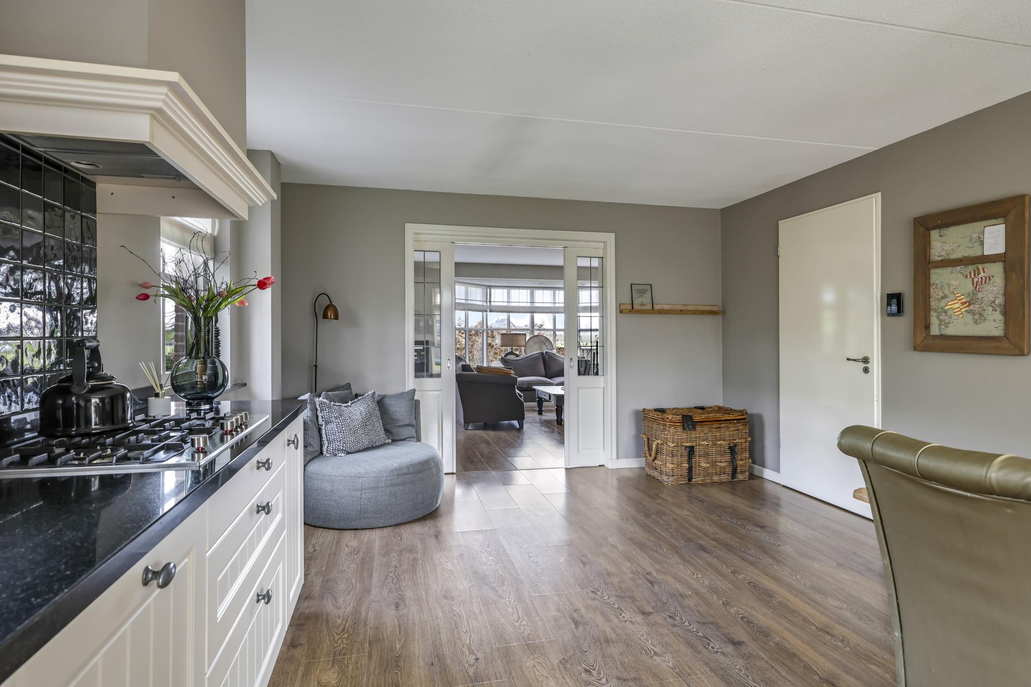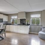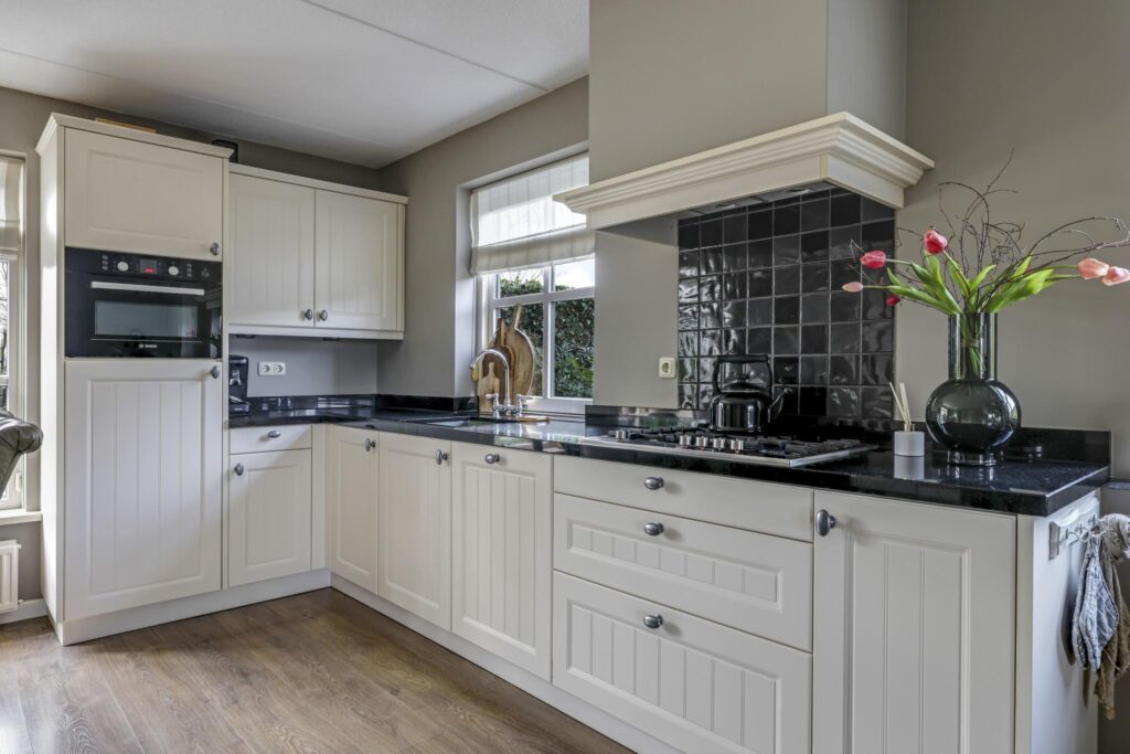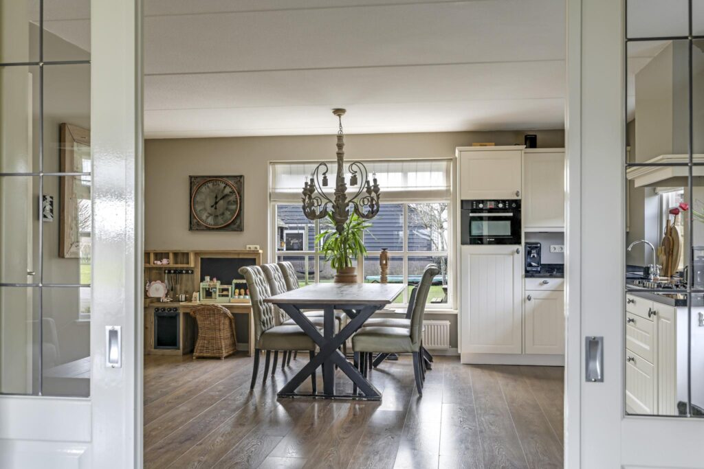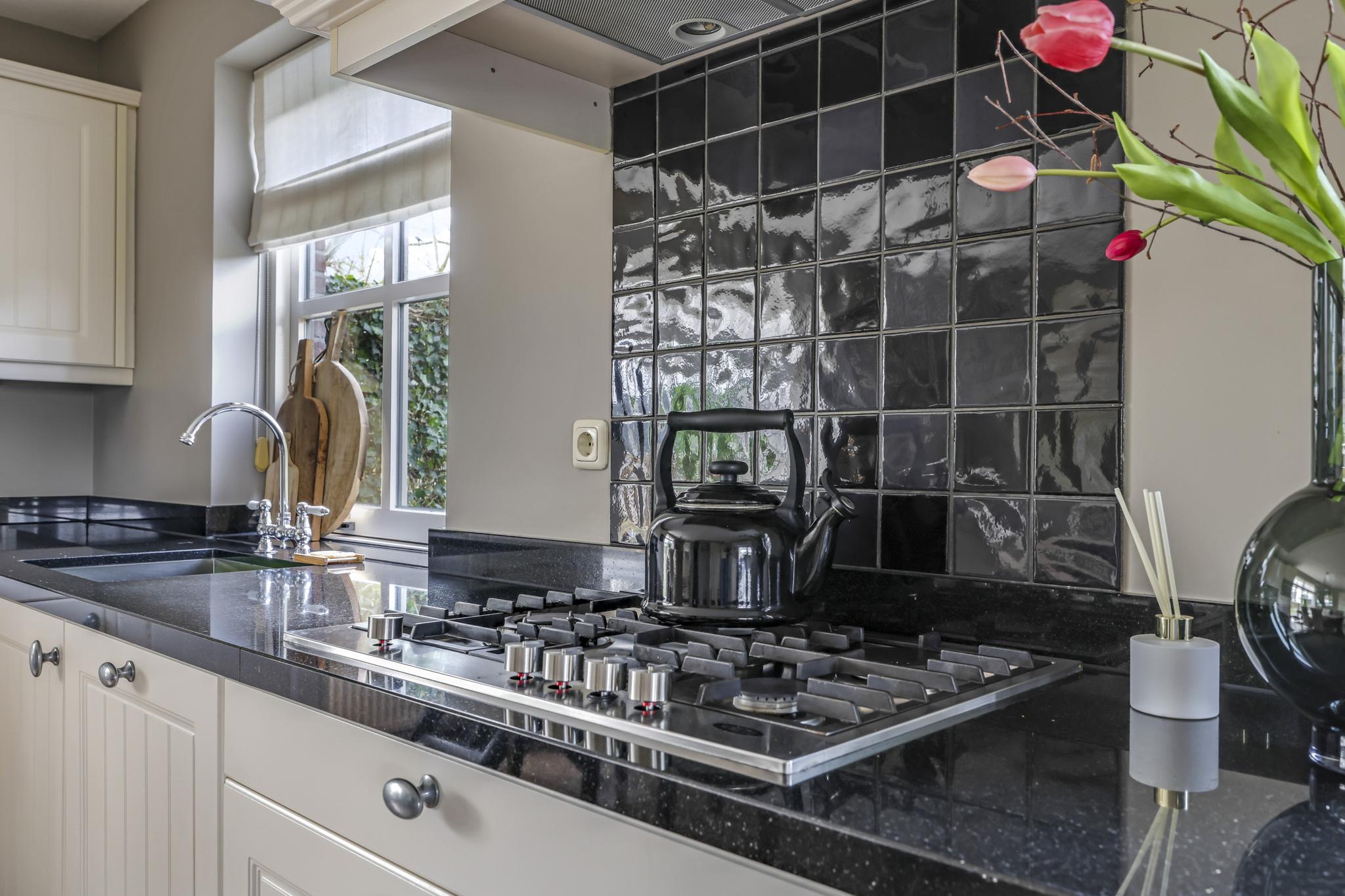 De gezellige leefkeuken is een droom voor kookliefhebbers! De keuken is uitgevoerd in een landelijke stijl en voorzien van een hoogwaardig werkblad van natuursteen. De en-suite deuren met glas-in-lood kunnen de keuken afsluiten zonder afbreuk te doen aan het ruimtelijke gevoel. Daarnaast beschikt de keuken over alle wenselijke inbouwapparatuur, zoals een vaatwasser, koelkast, combi-oven/magnetron, 5-pits gaskookplaat en een afzuigschouw. Er is meer dan genoeg ruimte voor een grote eettafel, ideaal voor een gezin met meerdere kinderen.