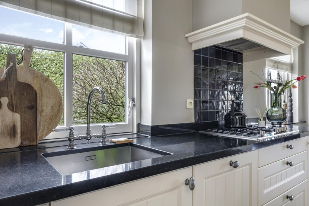 Landelijke keuken met o.a. een natuurstenen werkblad